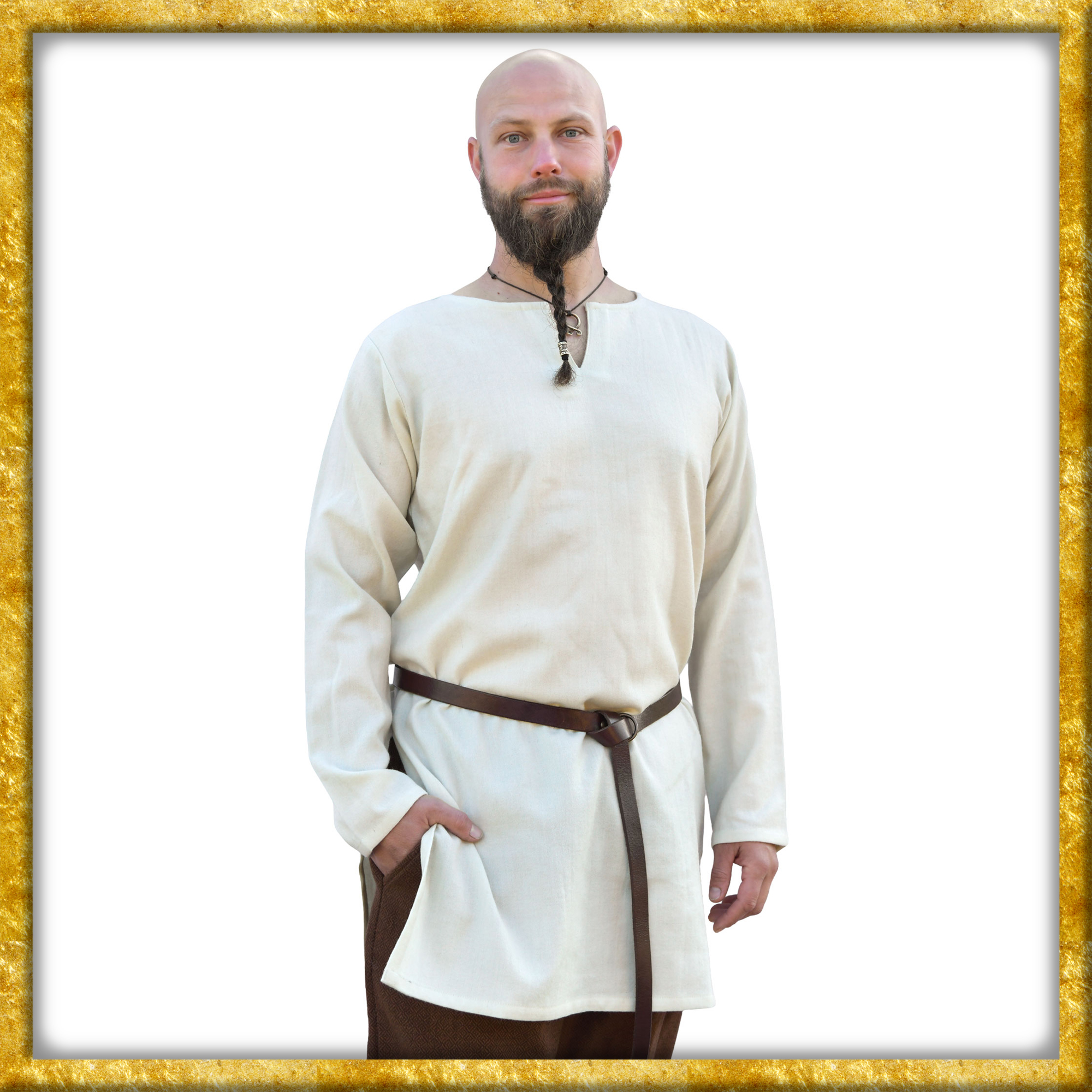Die Wikinger Tunika ist aus 100% Wolle gefertigt und überzeugt durch ihre hochwertige Qualität und ein angenehmes Tragegefühl. Die langärmlige Tunika reicht etwa bis zur Mitte der Oberschenkel und Schlitze an der Seitennaht sorgen für optimale Bewegungsfreiheit. Der klassische Rundhalsausschnitt ist in der vorderen Mitte geschlitzt und kann je nach Belieben offen getragen oder mit einer Fibel geschlossen werden.