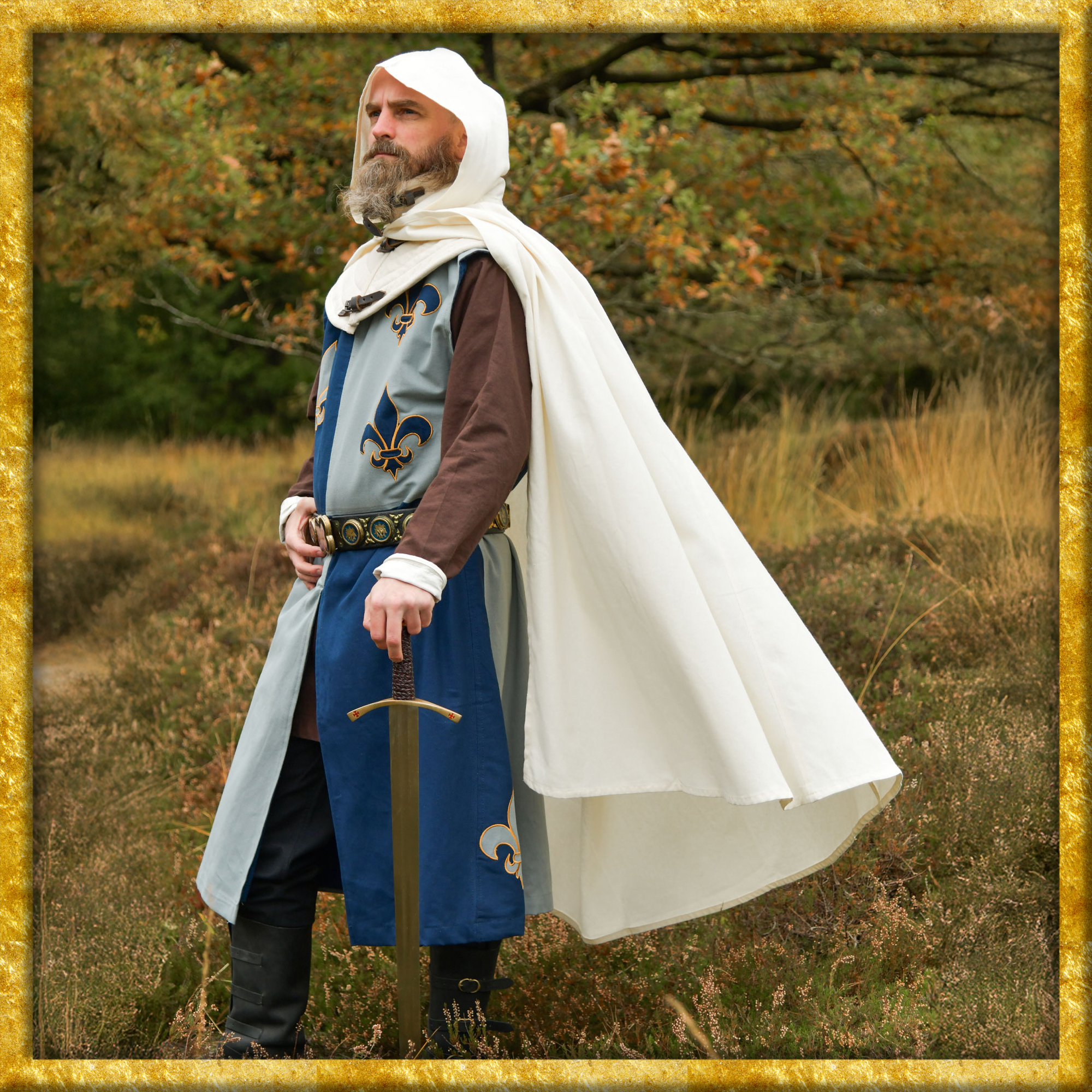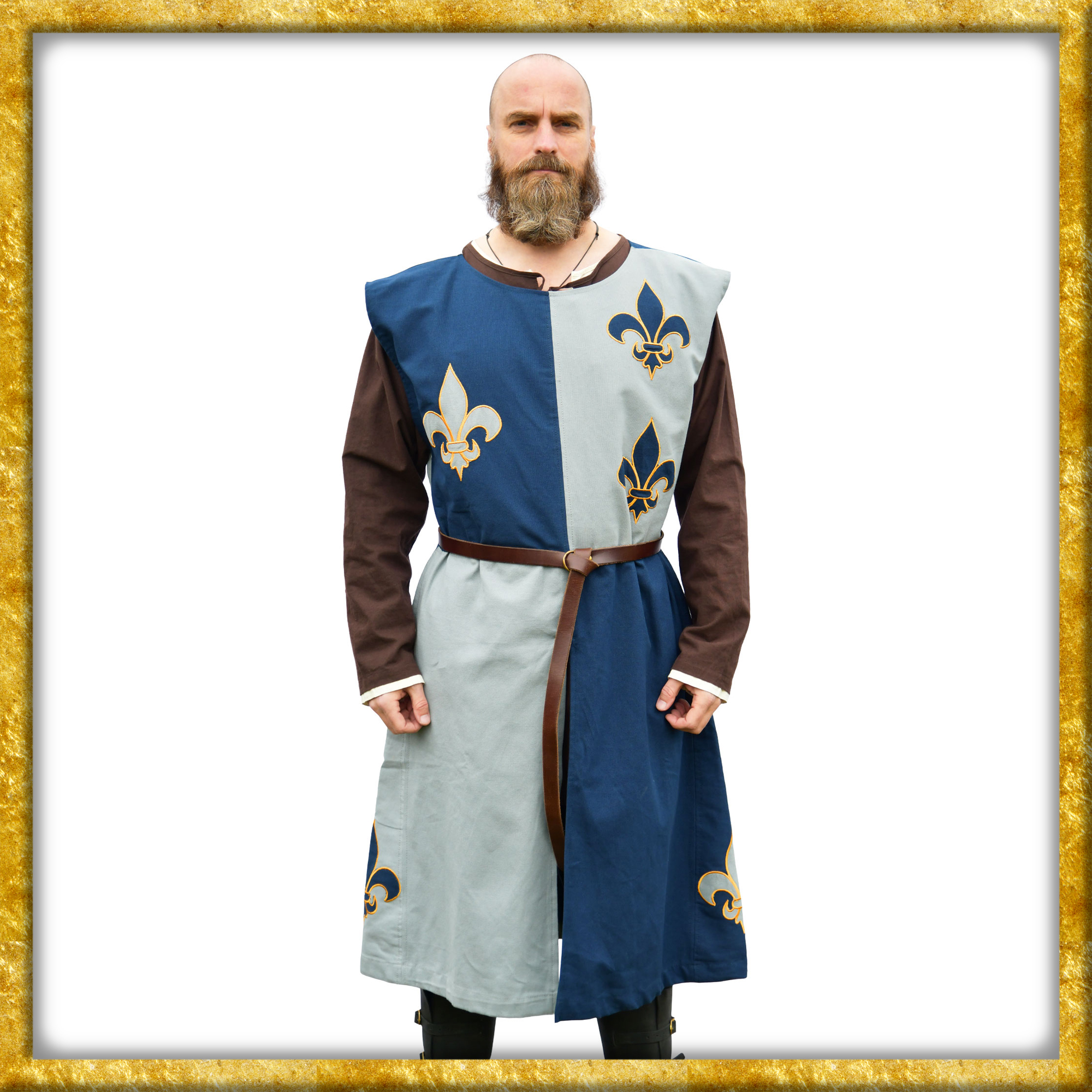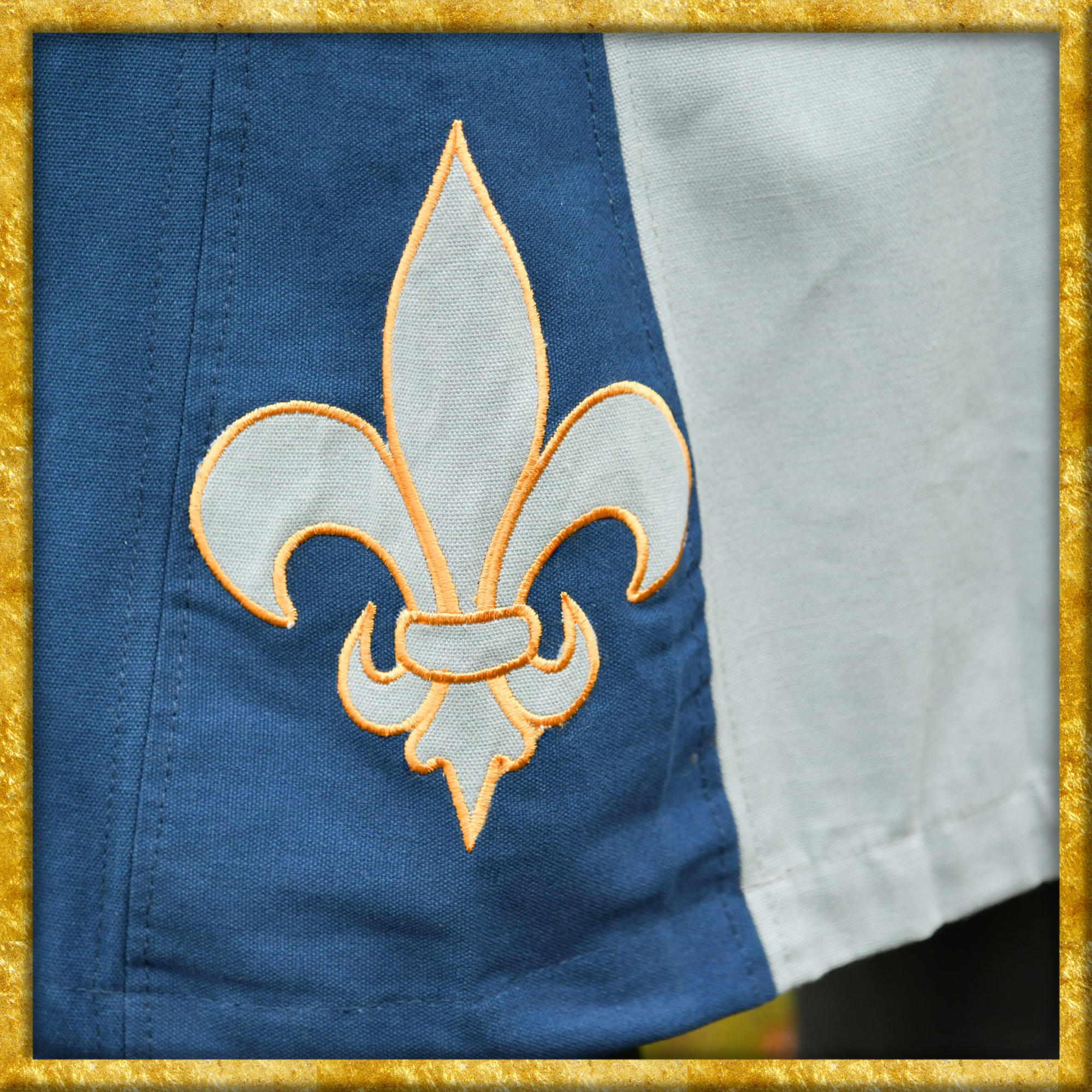 Der Wappenrock, auch Waffenrock, Waffenkleid, Tappert oder Surcot genannt, kam im 12. Jahrhundert auf und wurde von den Rittern über dem Harnisch oder der Kettenrüstung getragen. Er schützte den Träger vor Sonneneinstrahlung auf dem Schlachtfeld und durch die verschiedenen Farbkombinationen machte er im Kampfgetümmel deutlich, wer Freund und wer Feind war. Die Lilie ist sowohl ein Symbol der französischen Monarchie als auch ein christliches Zeichen. Im französischen Kontext wird die Lilie häufig in den Farben Blau und Gold dargestellt.