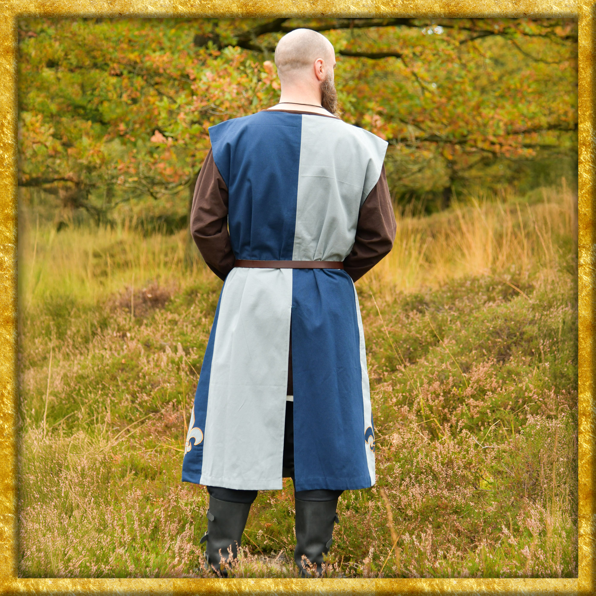 Dieser wadenlange Wappenrock ist aus festem Baumwollstoff gefertigt und komplett gefüttert. Der Rumpfteil ist bis zur Taille gerade geschnitten, das Rockteil ist ausgestellt und mittig geschlitzt. Die schachbrettartige Farbaufteilung - MiParti - und die applizierten Lilien verleihen diesem Waffenkleid seinen individuellen Look.