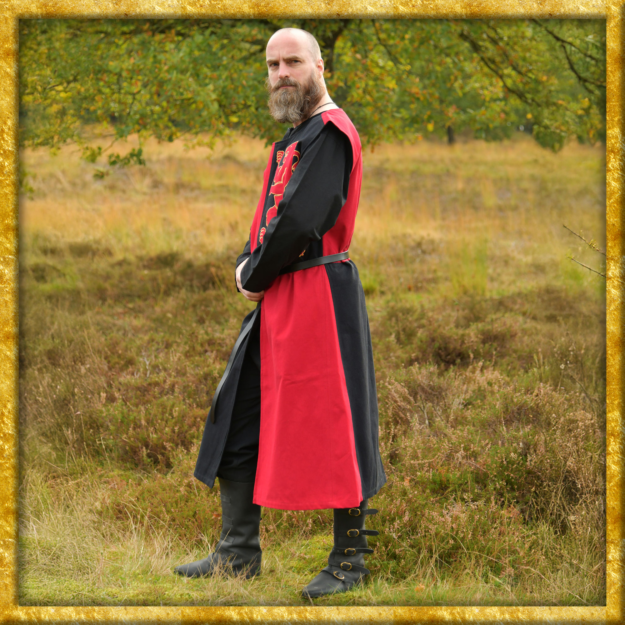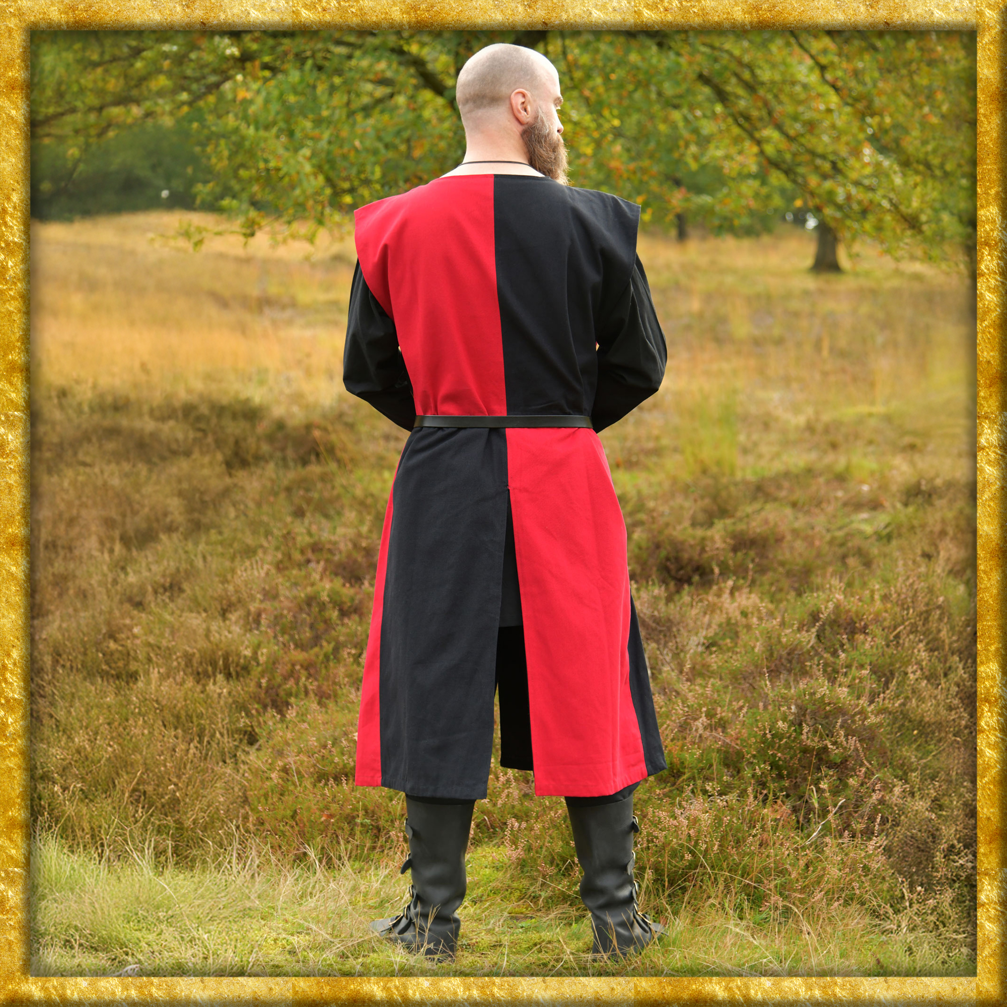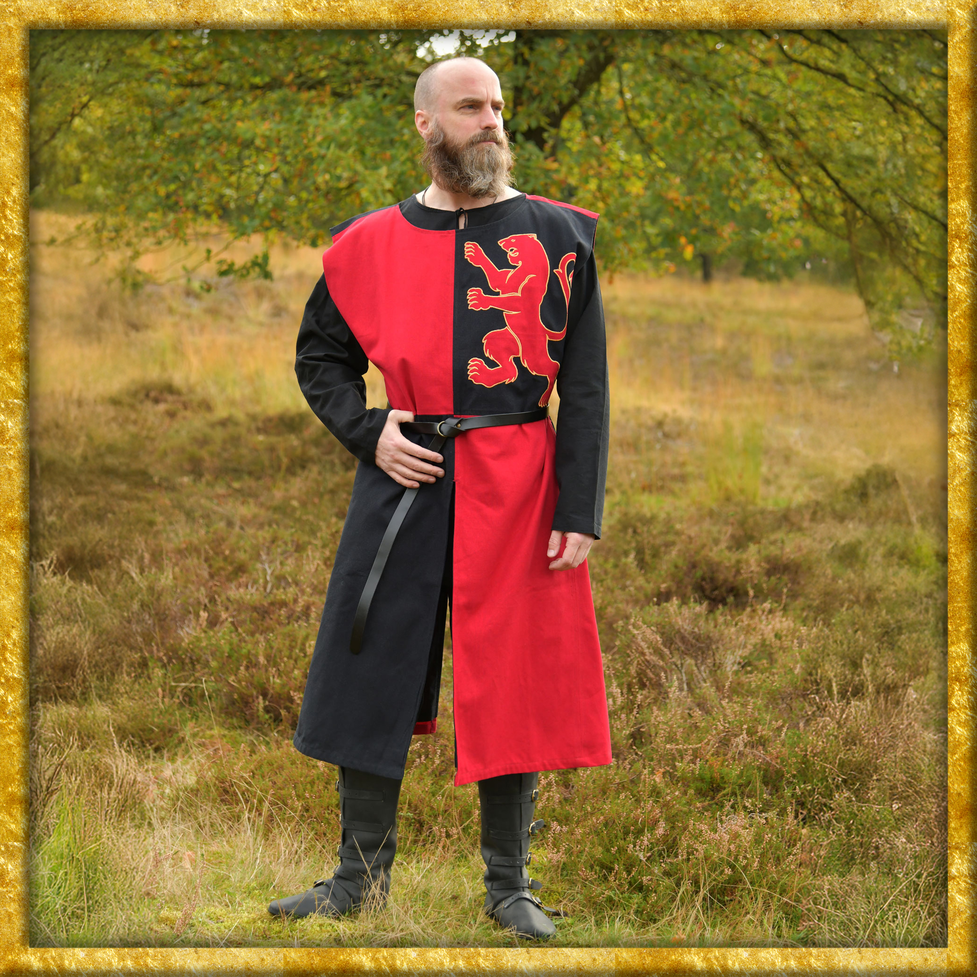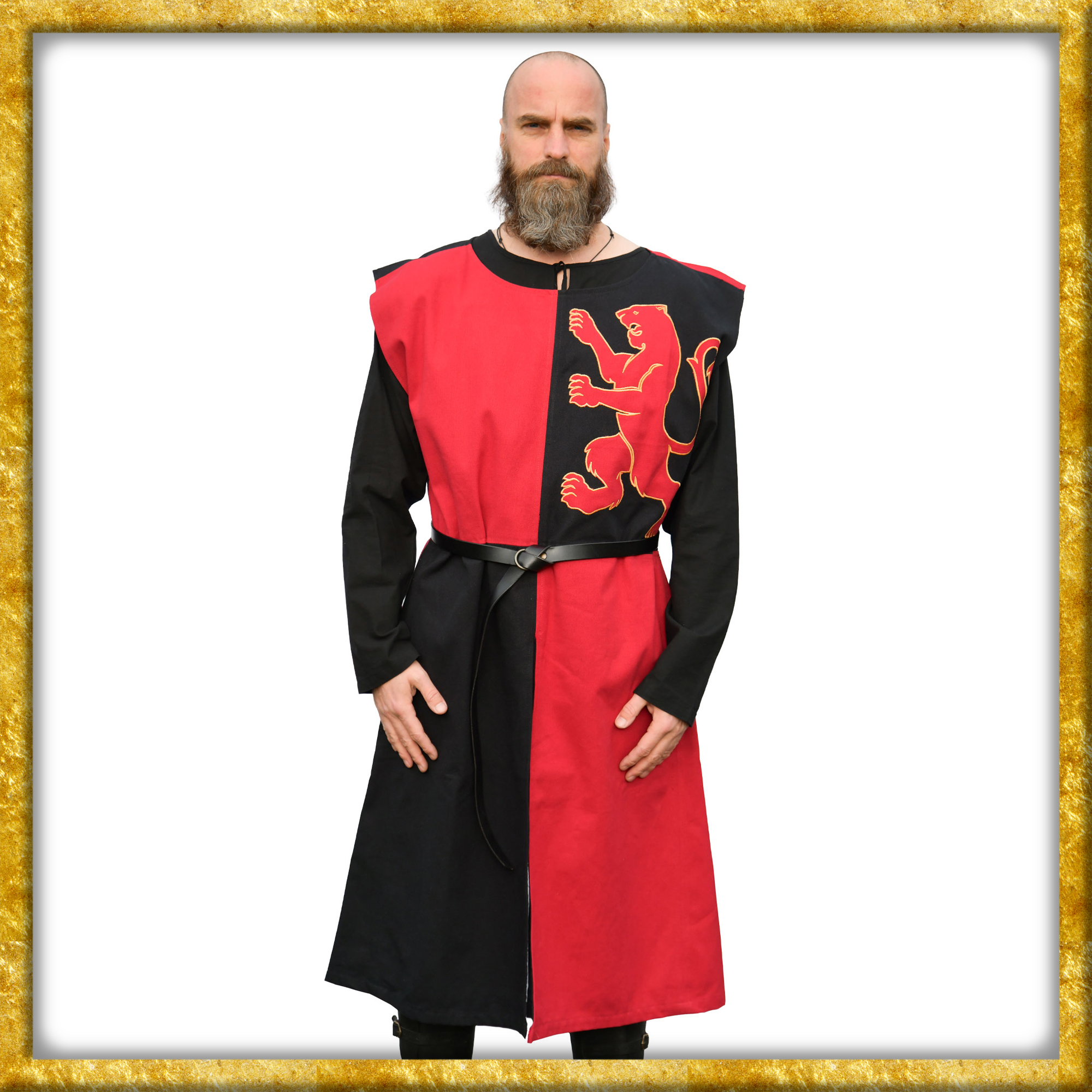 Dieser wadenlange Wappenrock ist aus festem Baumwollstoff gefertigt und komplett gefüttert. Der Rumpfteil ist bis zur Taille gerade geschnitten, das Rockteil ist ausgestellt und mittig geschlitzt. Die schachbrettartige Farbaufteilung - MiParti - und der applizierte Löwe verleihen diesem Waffenkleid seinen individuellen Look.