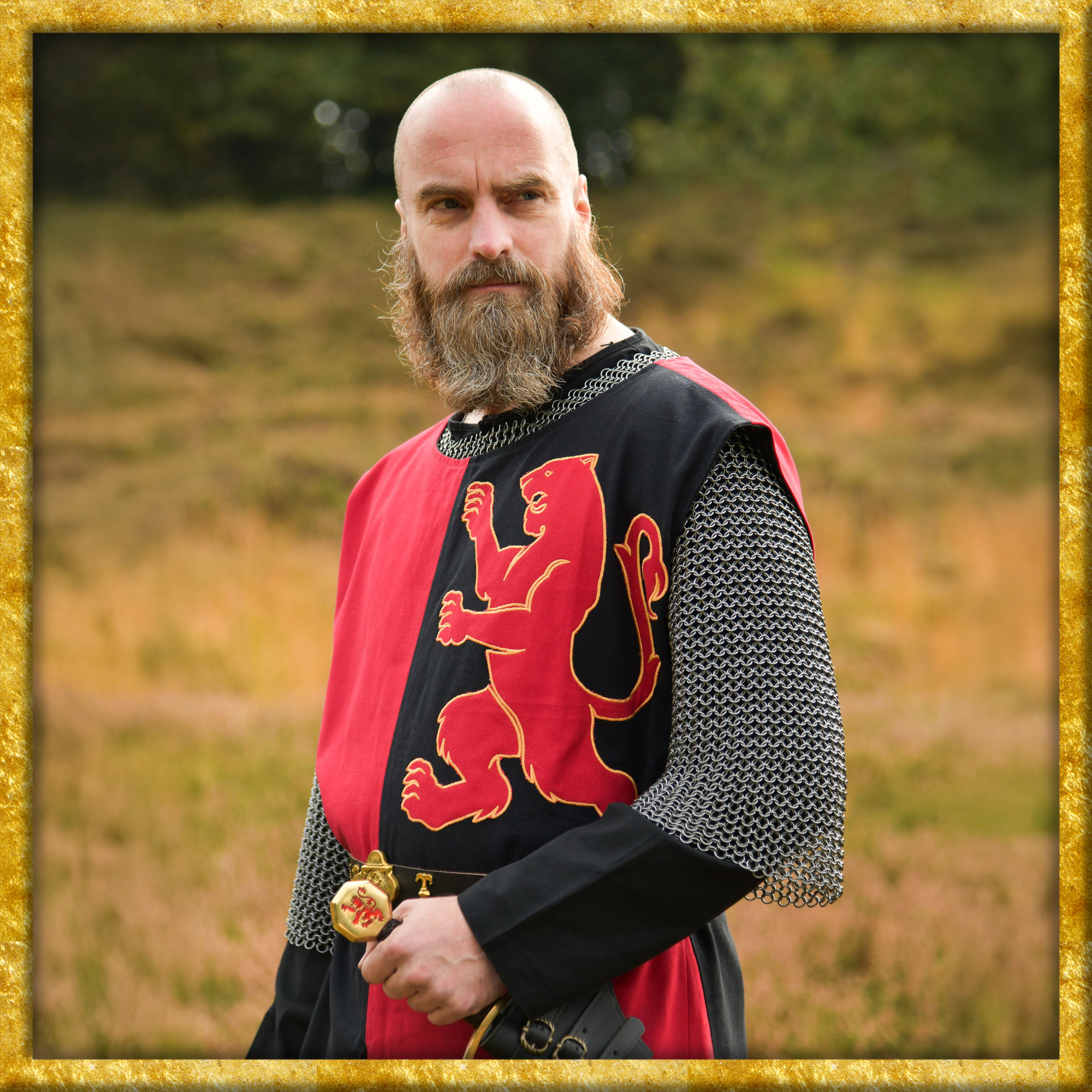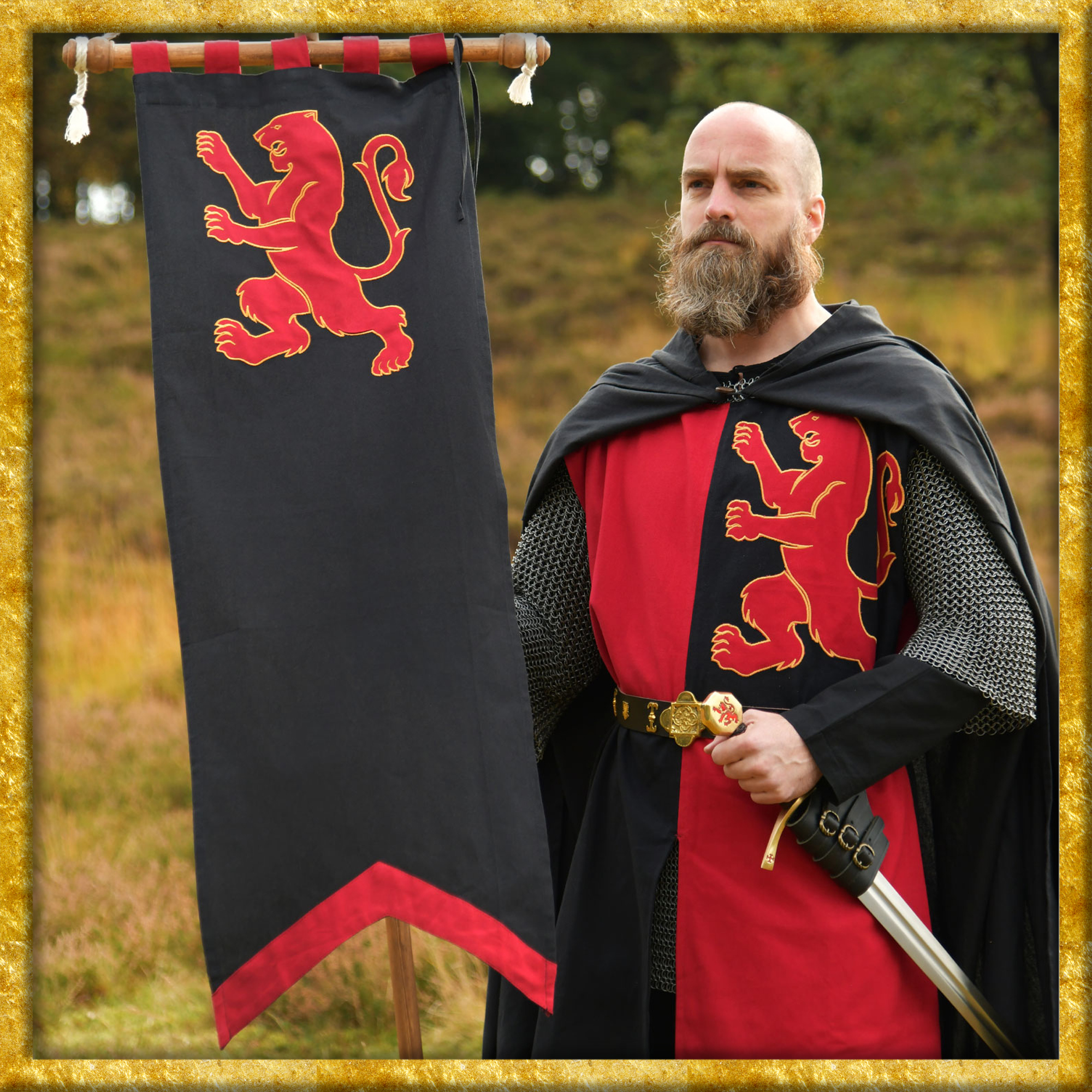 Der Wappenrock, auch Waffenrock, Waffenkleid, Tappert oder Surcot genannt, kam im 12. Jahrhundert auf und wurde von den Rittern über dem Harnisch oder der Kettenrüstung getragen. Er schützte den Träger vor Sonneneinstrahlung auf dem Schlachtfeld und durch die verschiedenen Farbkombinationen machte er im Kampfgetümmel deutlich, wer Freund und wer Feind war. Der Löwe als mächtiges Wappentier hat eine königliche Symbolik und wird häufig in den Farben Rot, Schwarz und Gold dargestellt.
