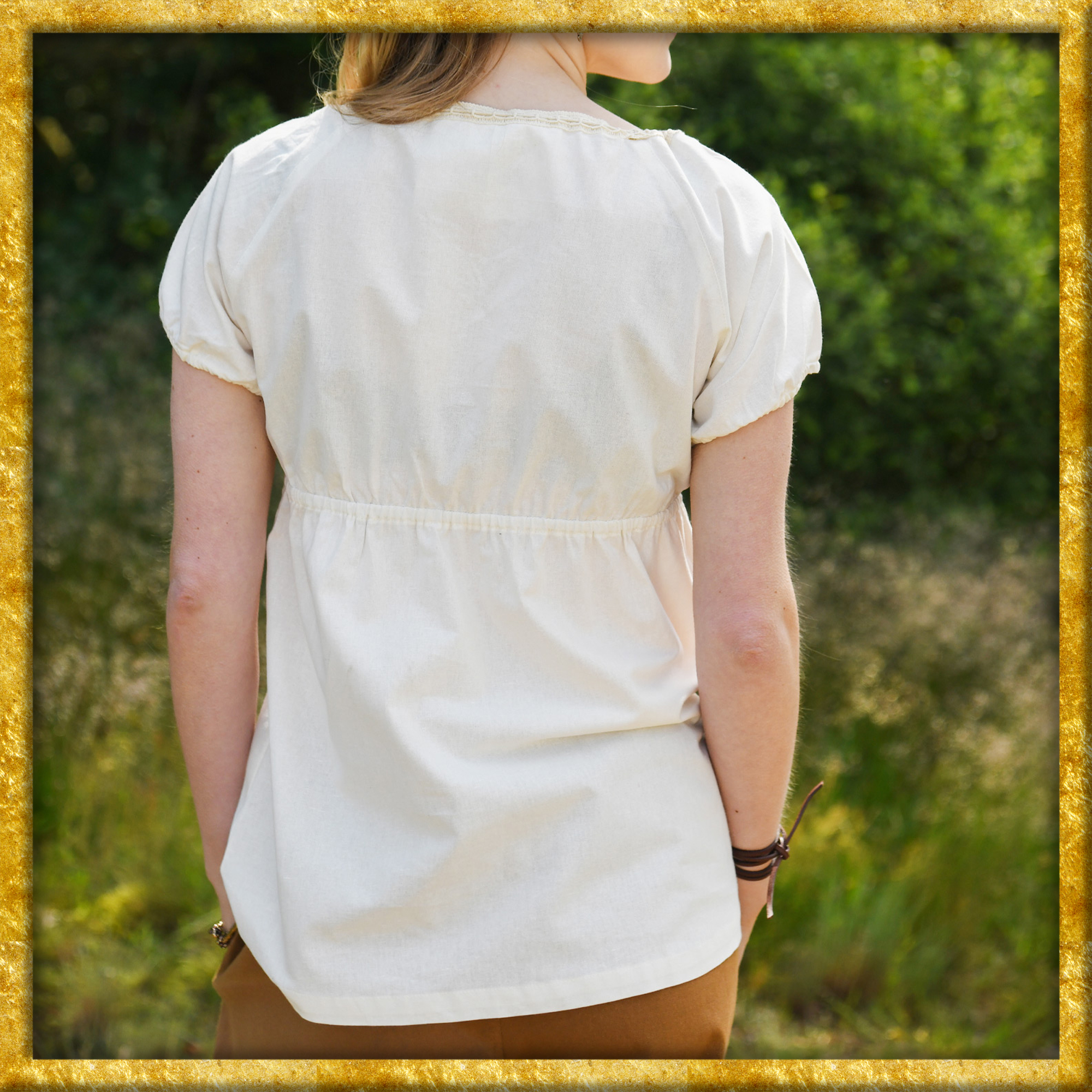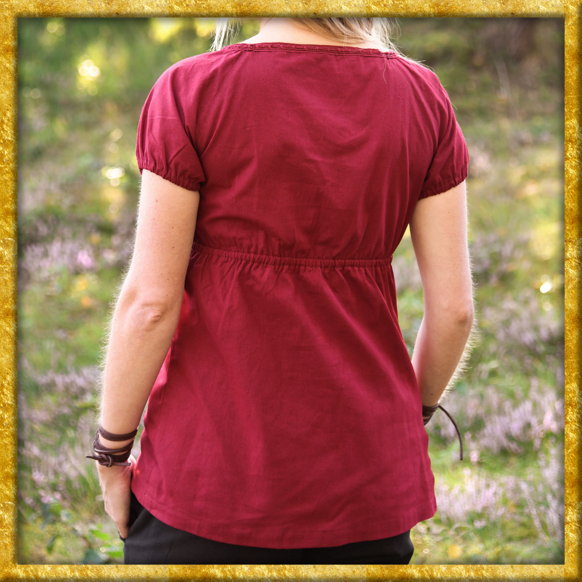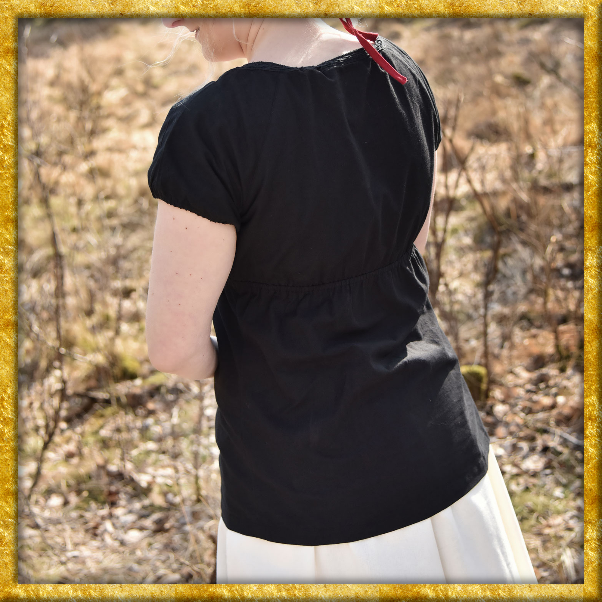 Diese mittelalterliche Baumwollbluse ist aus leichtem Stoff gefertigt und locker geschnitten. Sie ist den Farben Weinrot, Schwarz oder Natur erhältlich. Der Ausschnitt ist mit einer kleinen Baumwollspitze verziert und kann durch ein kleines Bändchen in der Weite reguliert werden. Unter der Brust und am Ärmelsaum ist ein Gummiband eingearbeitet, welches eine schöne Raffung kreiert. Diese Sommerbluse ist vielseitig einsetzbar, egal ob für die Darstellung einer Magd, einer Piratin oder einfach im modernen Alltag.