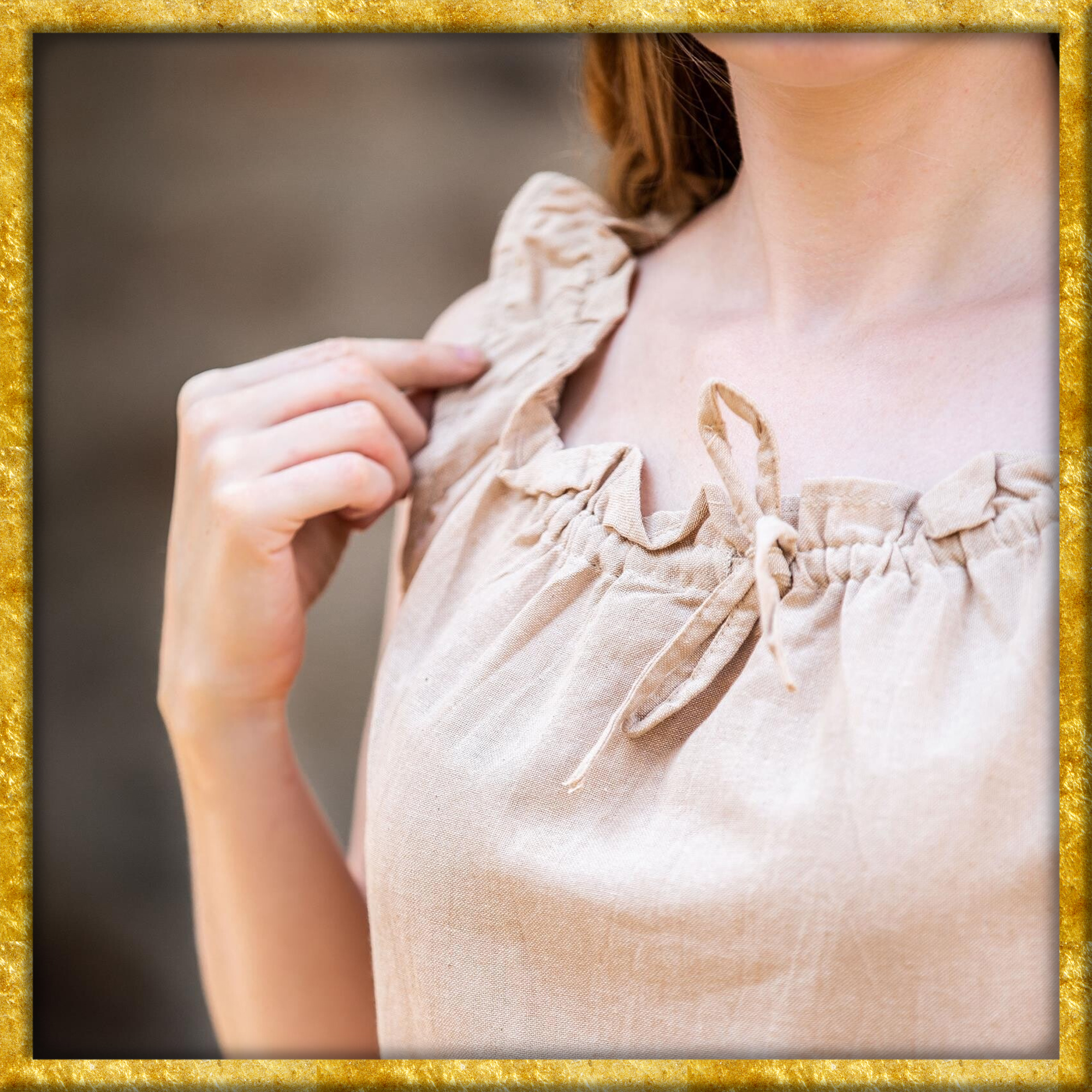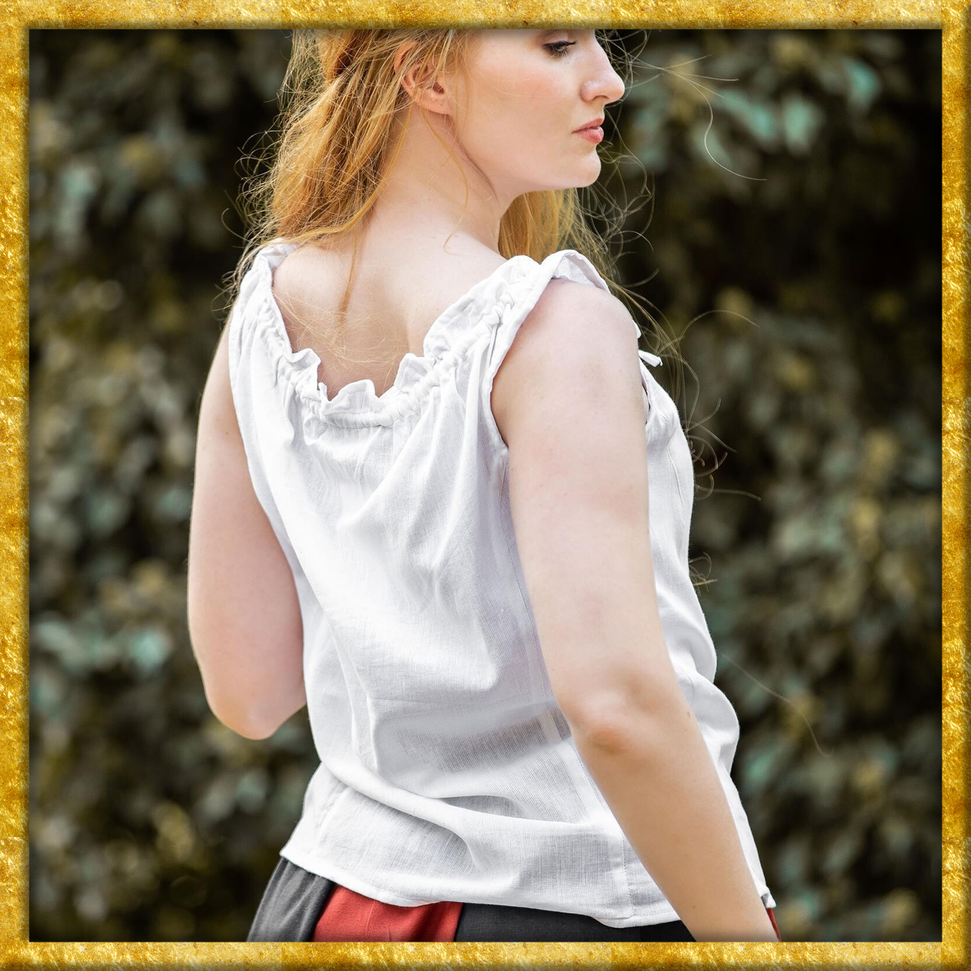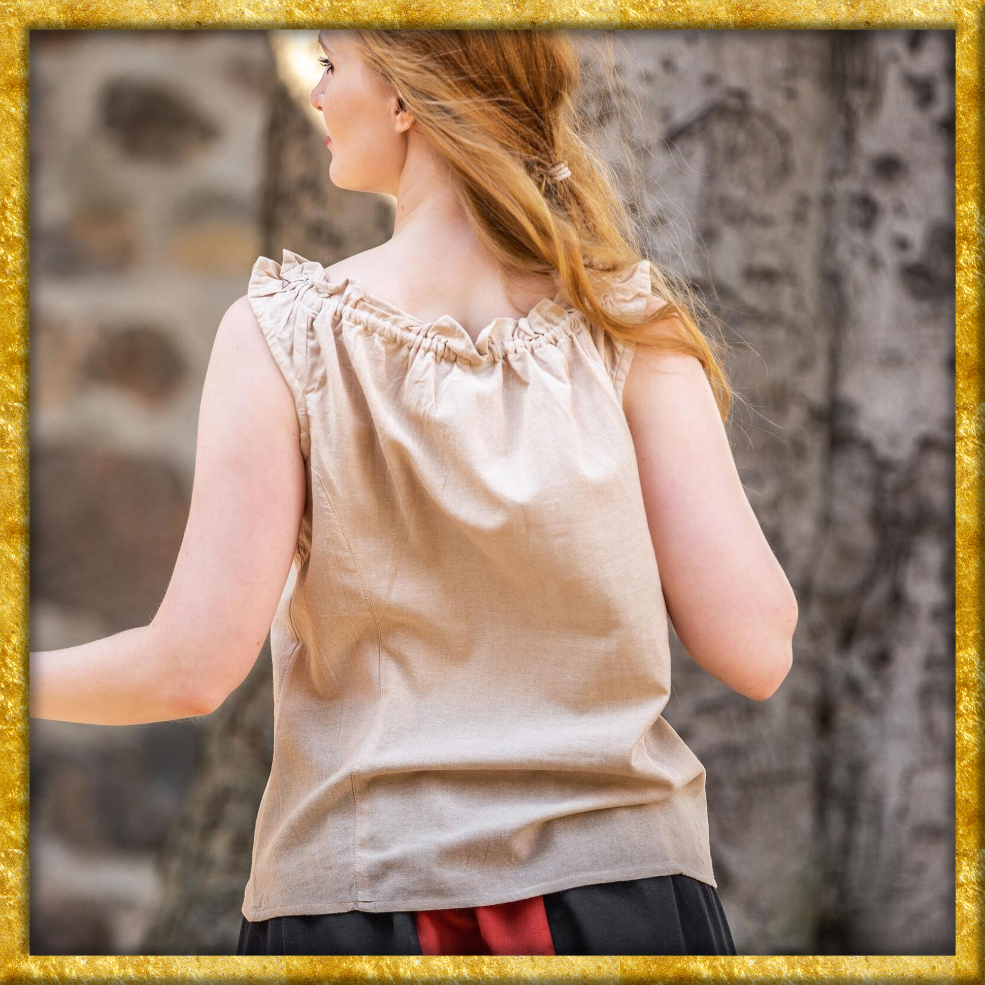 Unsere ärmellose Sommerbluse Adele ist der perfekte Begleiter für warme Tage. Inspiriert von mittelalterlichen Designs, vereint sie moderne Leichtigkeit mit historischem Charme. Die Bluse zeichnet sich durch ihren lockeren Sitz und einen eleganten Tunnelzug am Décolleté aus, der dir die Möglichkeit bietet, die Weite individuell anzupassen. Die leicht gerafften Armausschnitte verleihen der Bluse eine charmante Note. Mit ihrer geraden Saumlinie und dem schlichten Silhouette-Design bietet unsere Bluse sowohl Komfort als auch Stil.