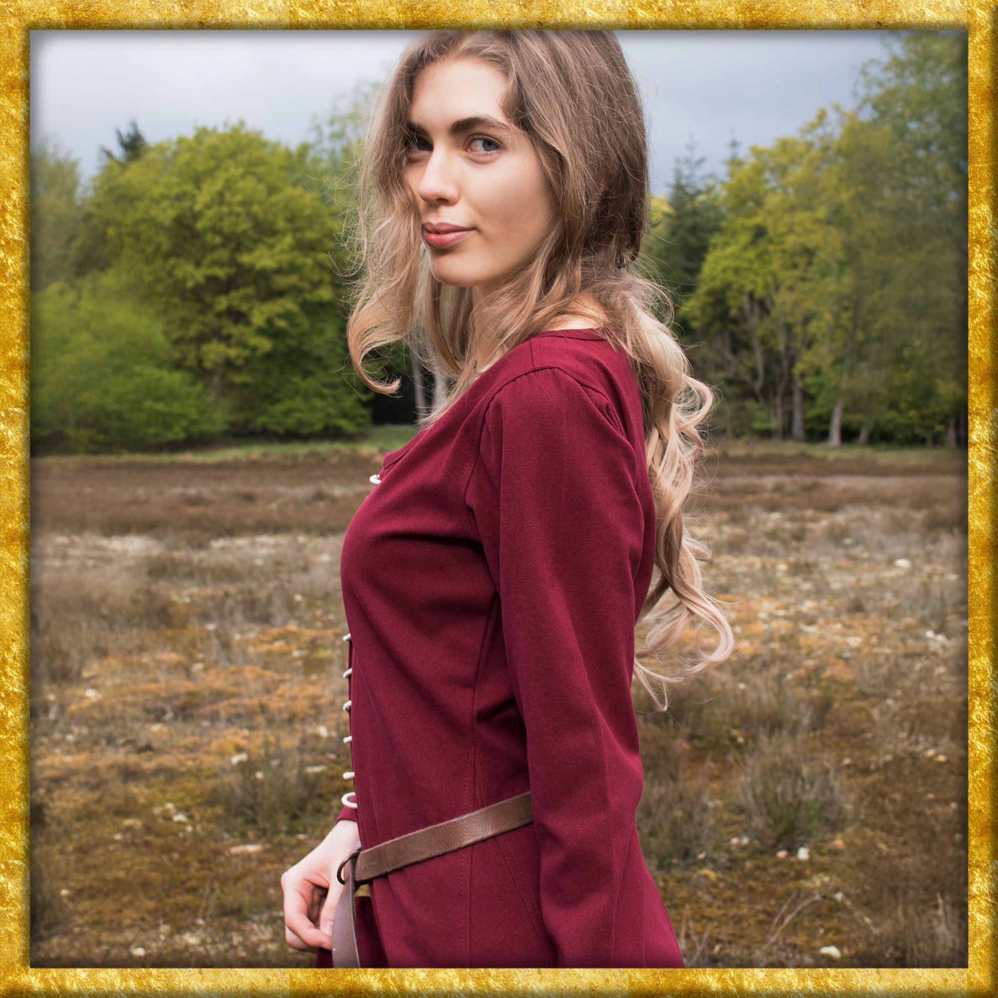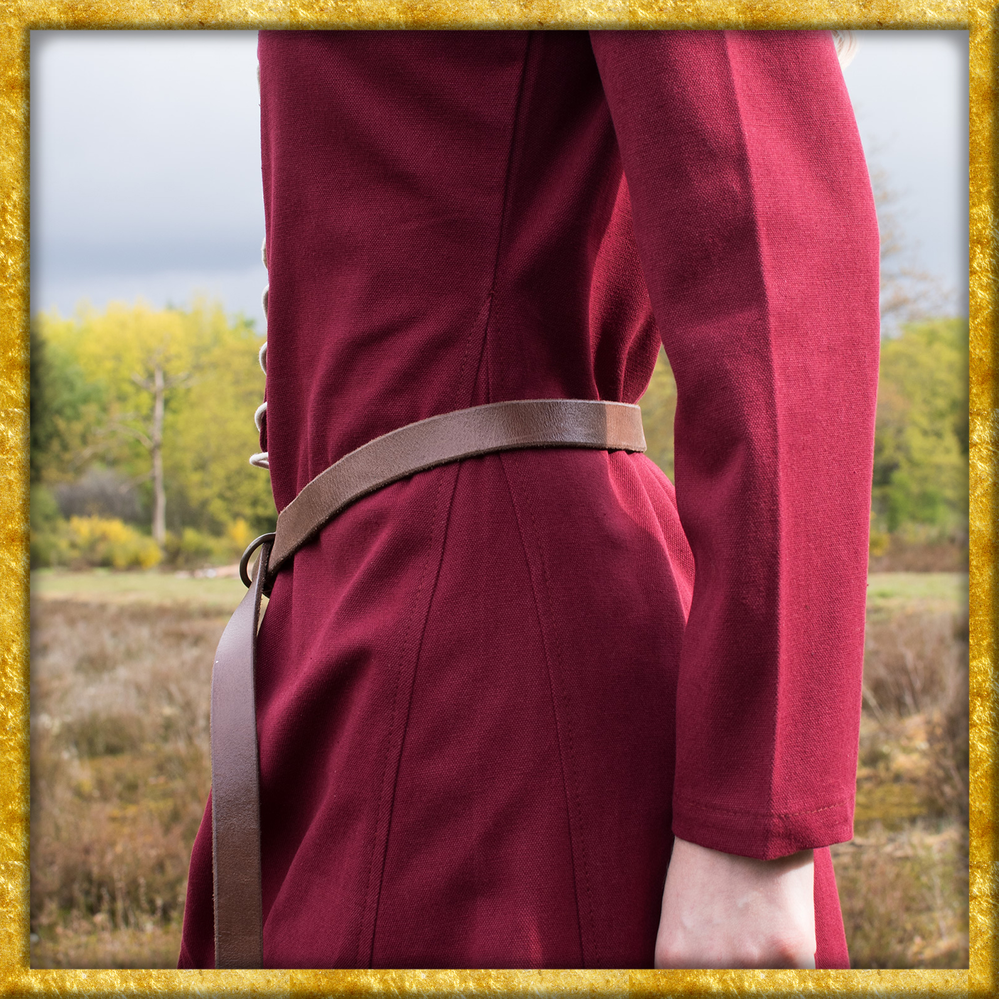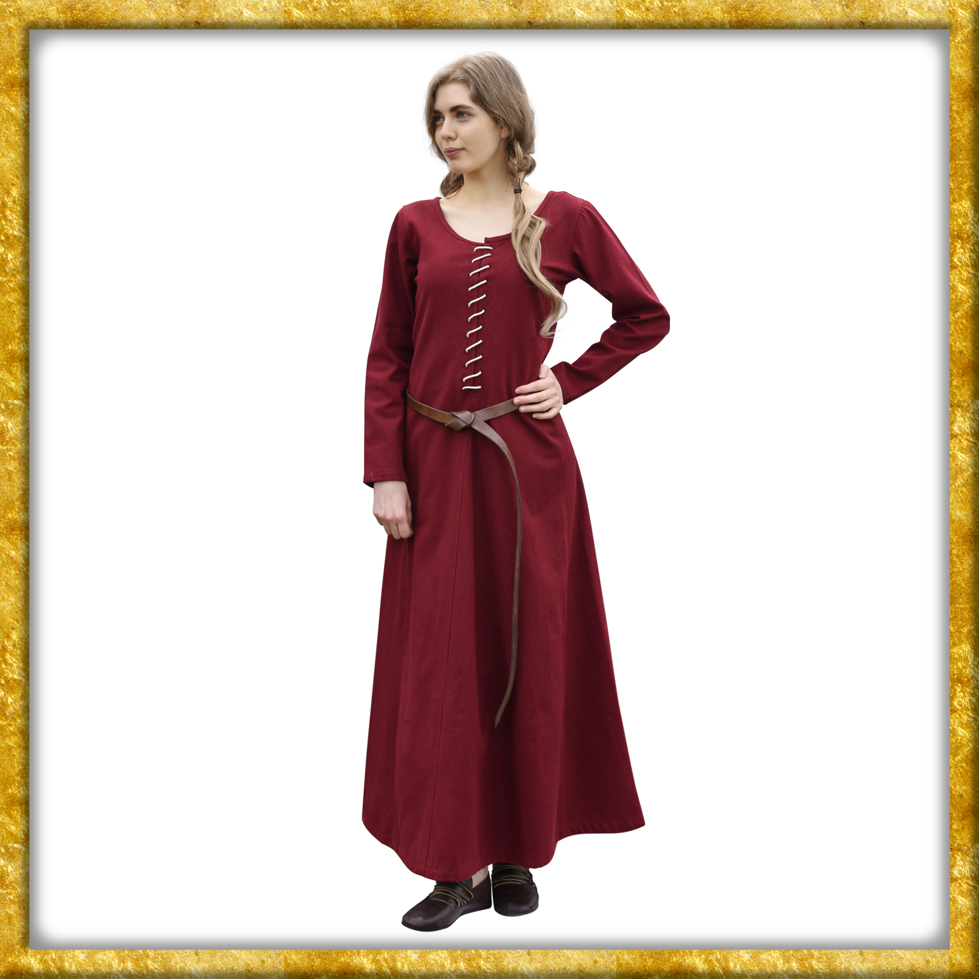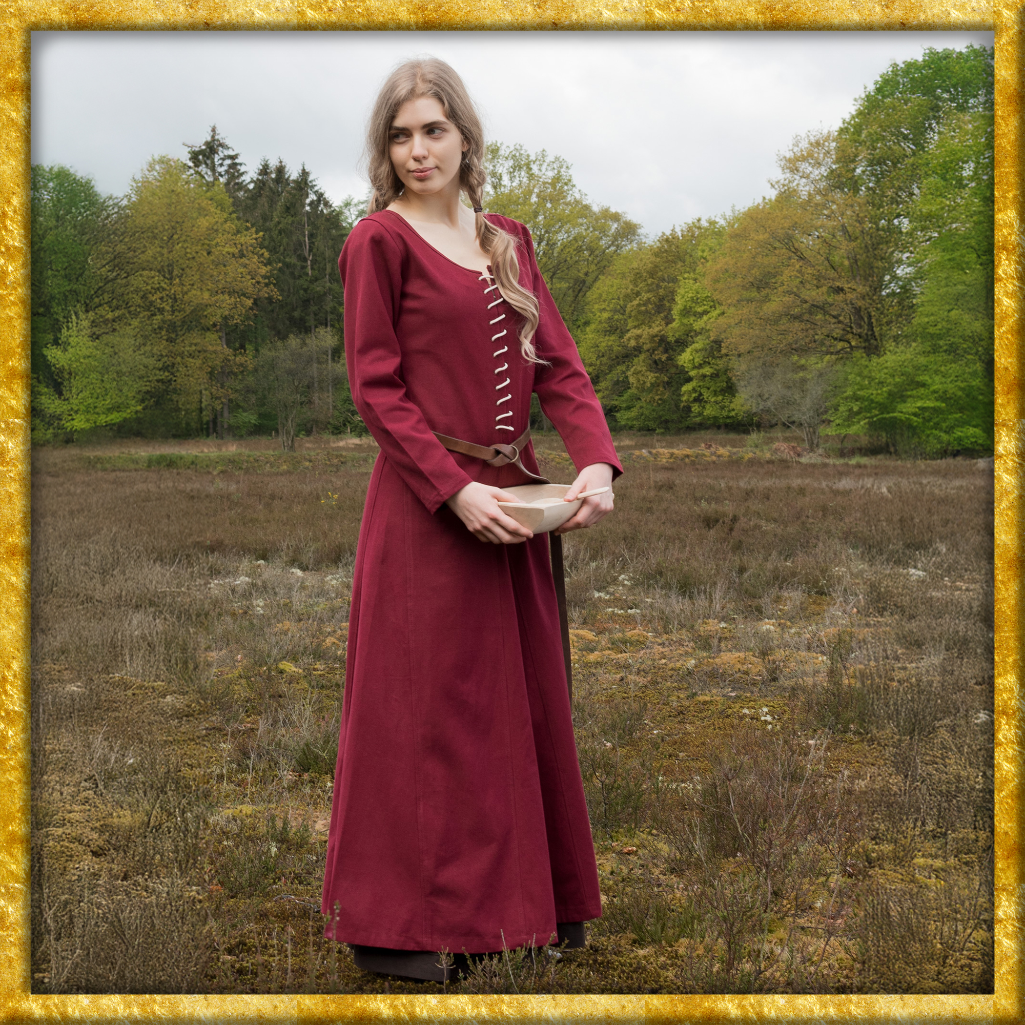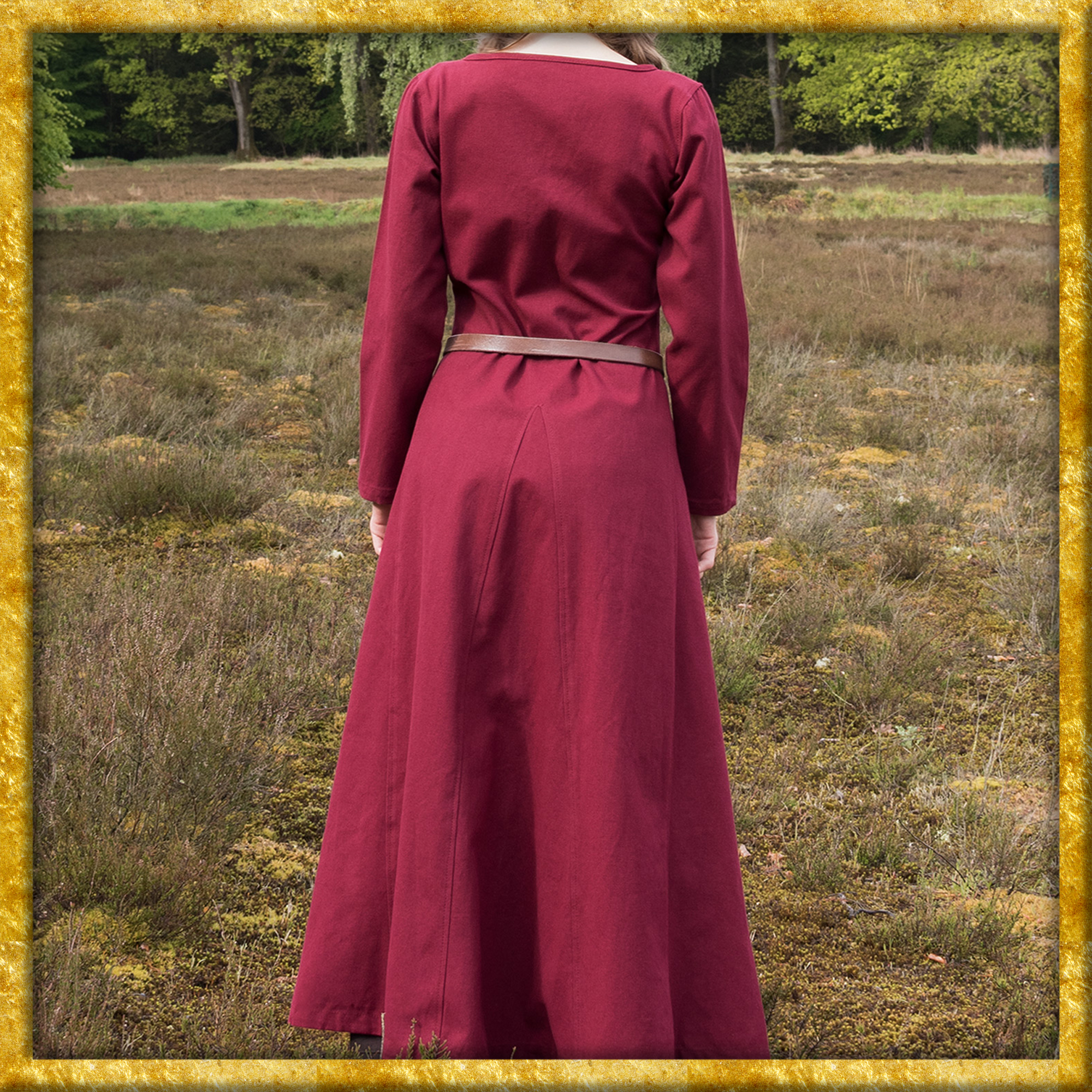 Das lange mittelalterliche Kleid in Weinrot ist eng geschnitten und aus festem Baumwollstoff (Canvas) gefertigt. Im Rockteil sind Gehren (Stoffkeile) eingesetzt, die eine grosszügige Saumweite erzeugen. Die vordere Mitte wird mit einem festen Baumwollband geschnürt und lässt sich so, individuell dem Körper anpassen. Die Bandenden sind mit einer Nestelspitze versehen, so lässt sich das Band einfach durch die gestickten Ösen ziehen.