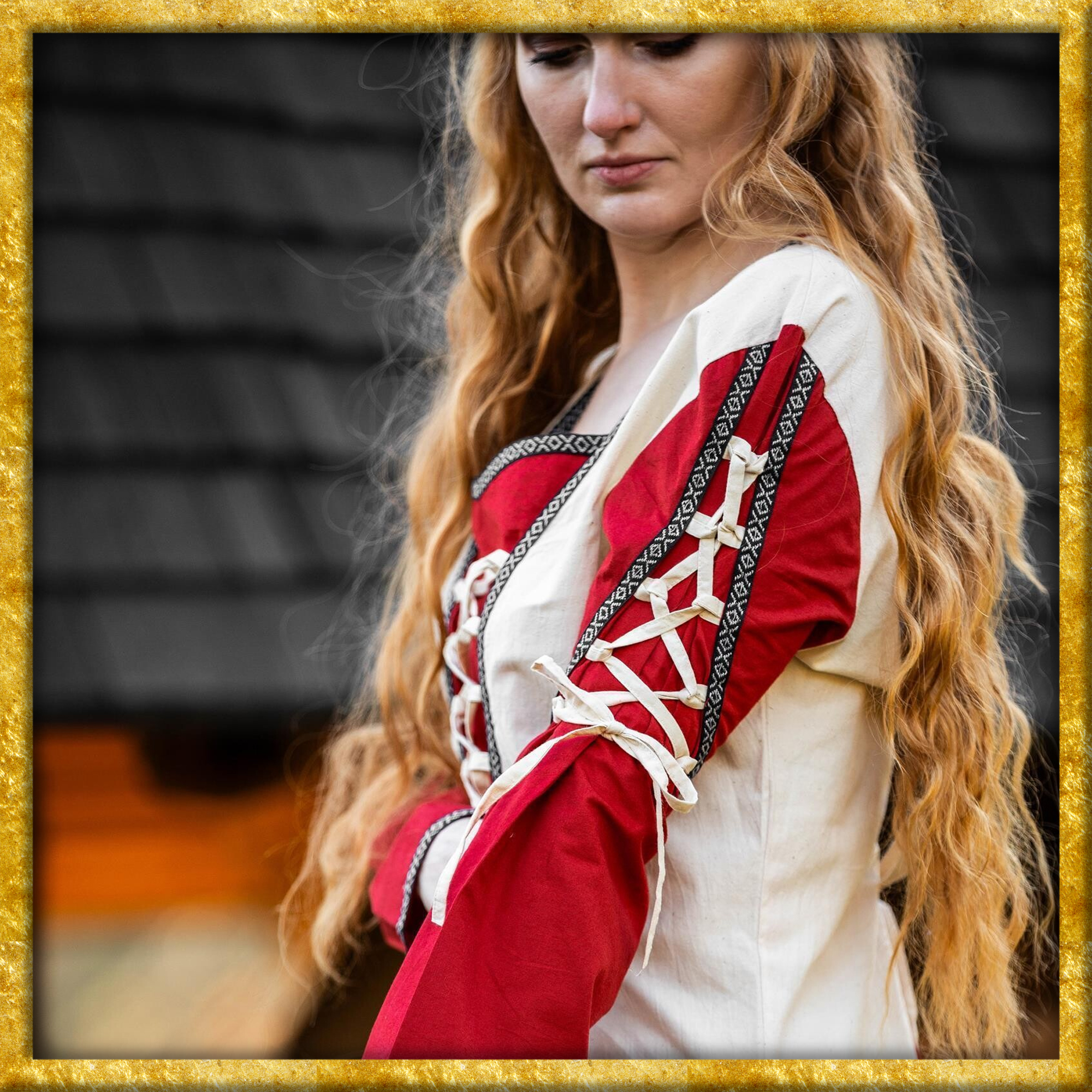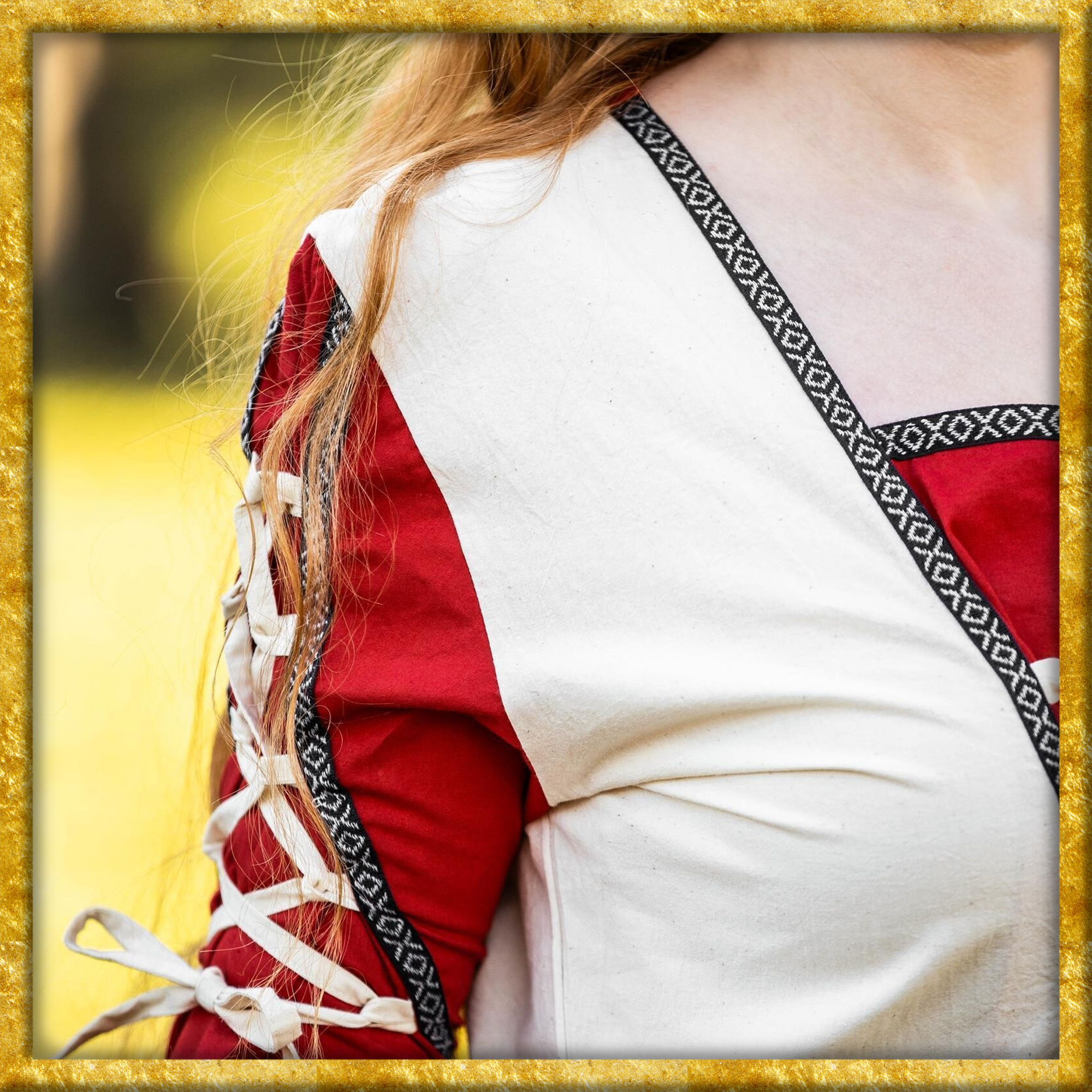 Das Amalia Mittelalter Kleid ist ein echter Blickfang für jeden, der den historischen Stil liebt. Mit seiner zweifarbigen Gestaltung, der feinen Bordüre sowie der Schnürung die den Vorderbereich, Rücken und die oberen Ärmel ziert, besticht dieses Kleid durch seine Eleganz und Weiblichkeit. Die Schnürung ist nicht nur ein attraktives Detail, sondern sorgt auch für eine perfekte Passform. Die Schnürung ist bewusst lang gehalten, so dass Du sie um Dich herum schnüren kannst, ähnlich einem Gürtel, was dem Kleid eine zusätzliche stilvolle Note verleiht.