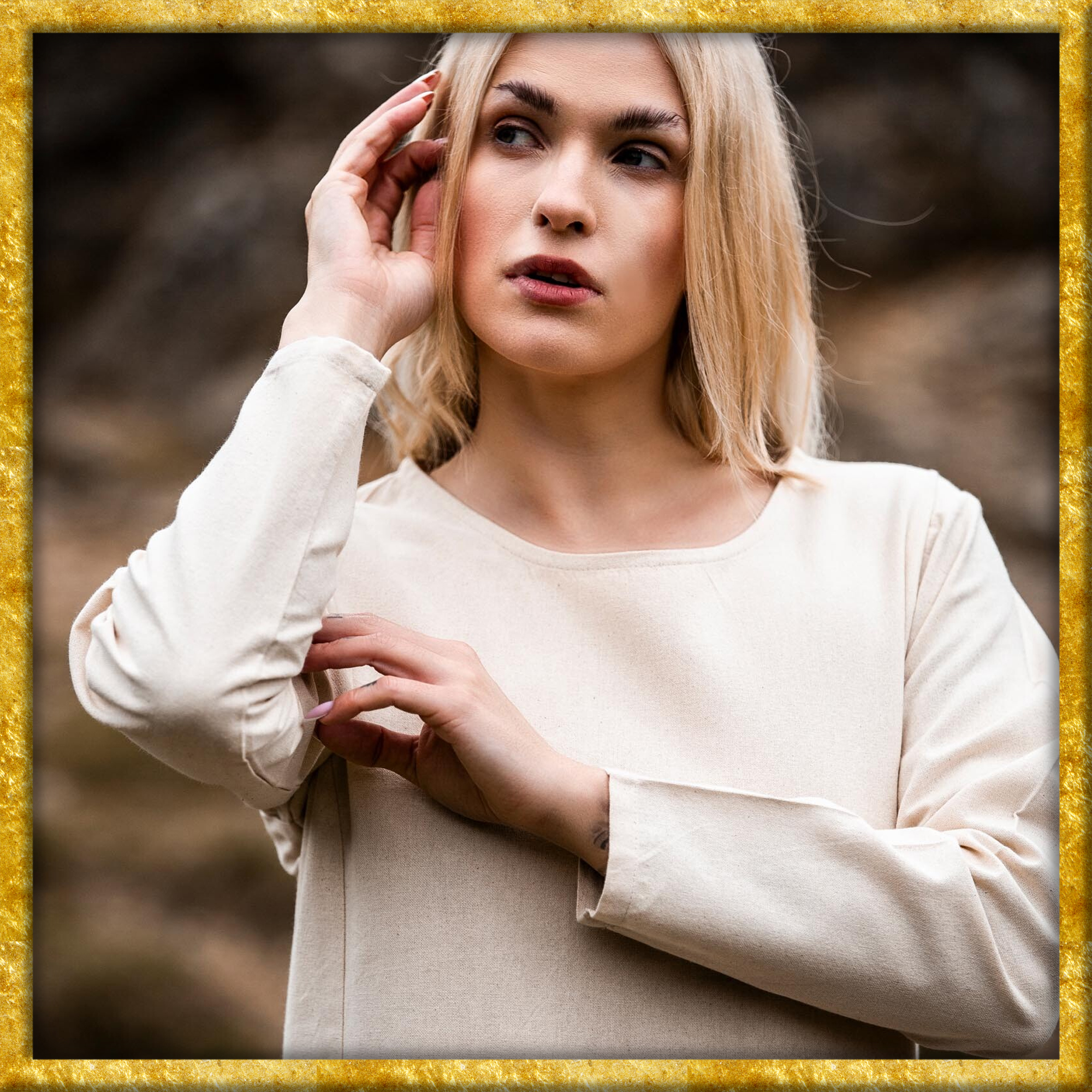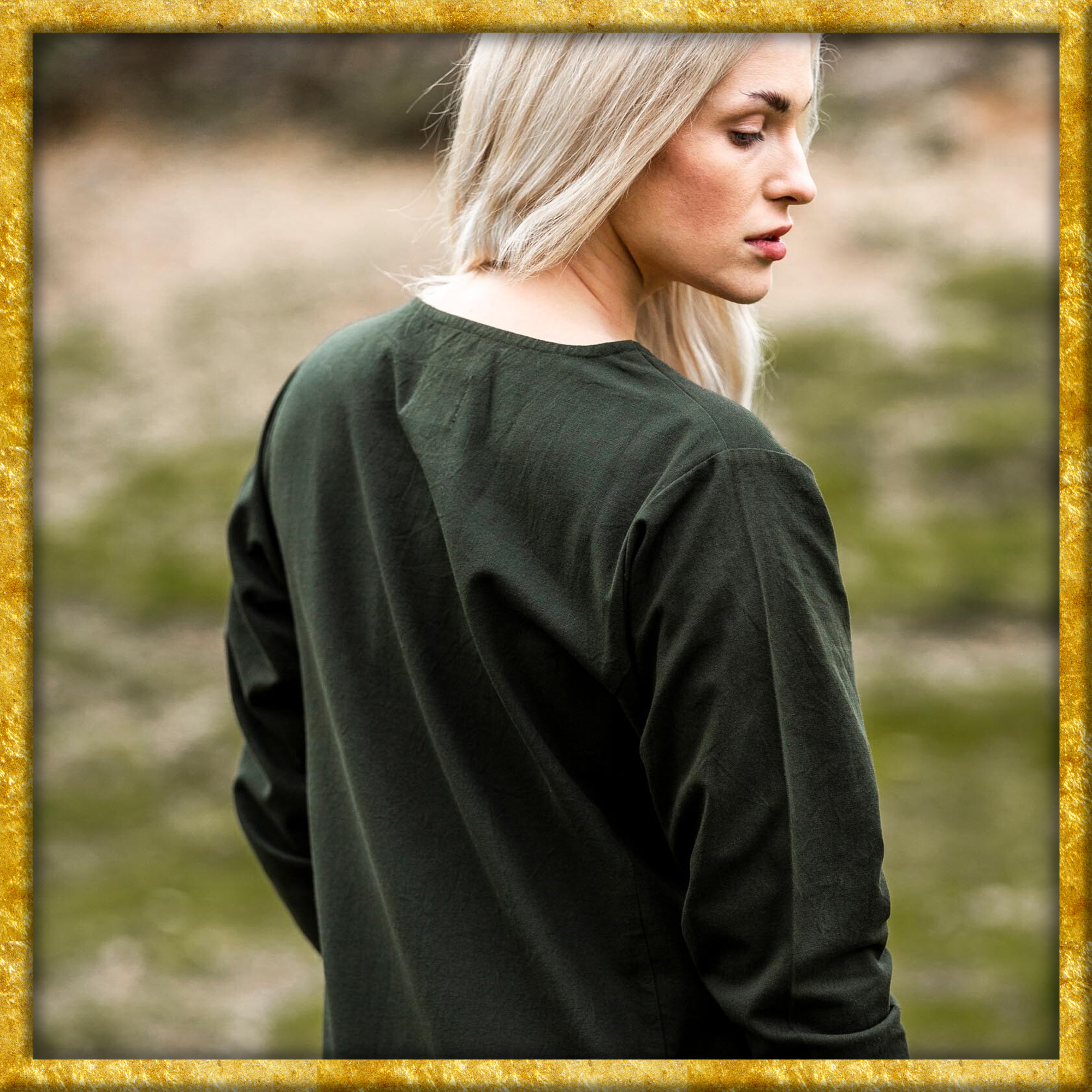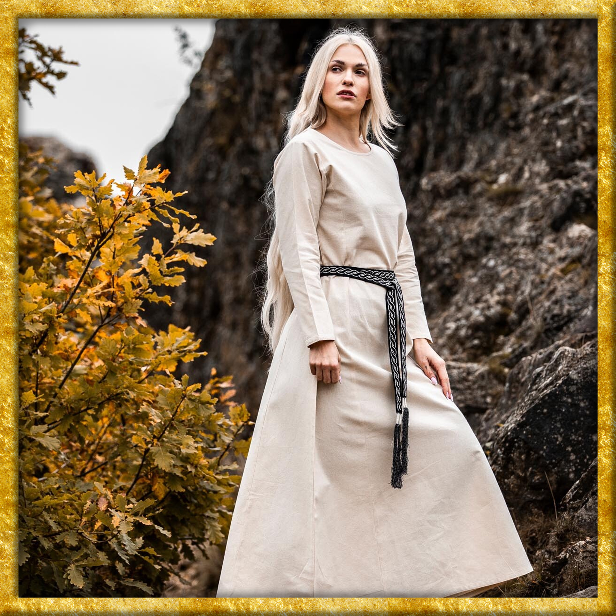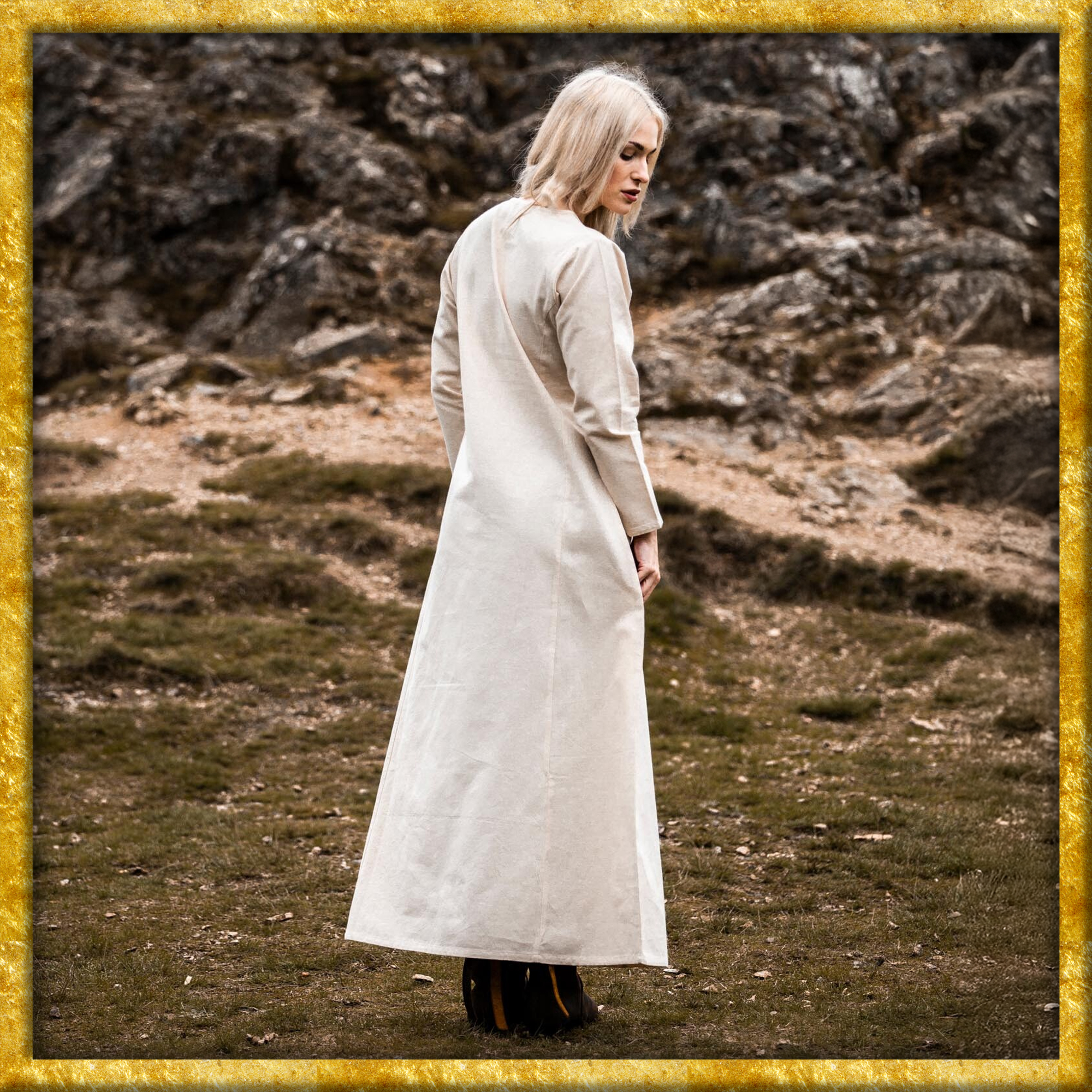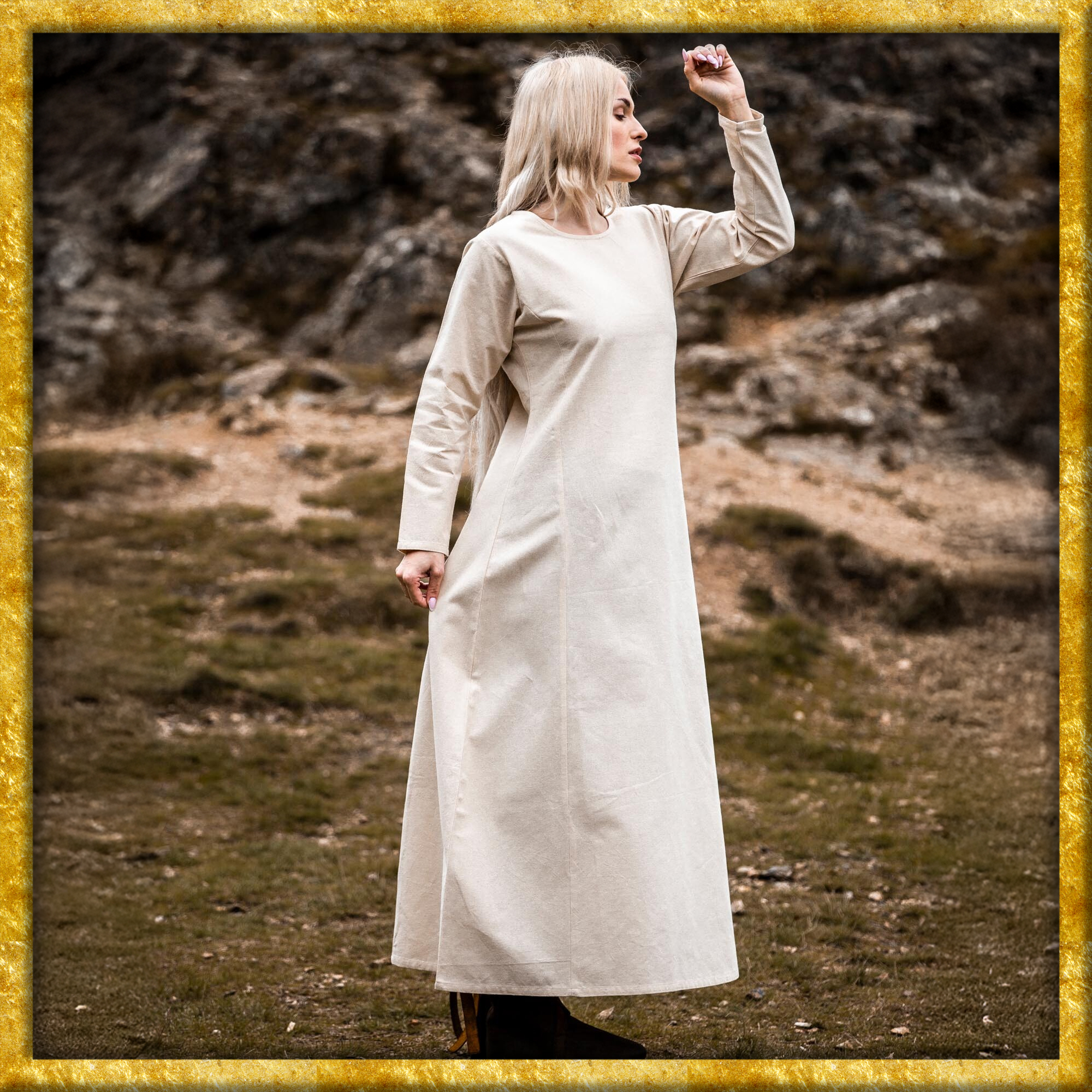 Unser Kleid Alvilda ist inspiriert von der schlichten Schönheit mittelalterlicher Gewänder, die Frauen in einer Zeit trugen, in der Eleganz und Funktionalität Hand in Hand gingen. Diese Kleider waren bekannt für ihren praktischen Nutzen und ihre anmutige Erscheinung, ideal für jede Frau, die sich im Alltag frei bewegen wollte. Durch seine gewebte Struktur und das Fehlen eines Kragens bleibt das Kleid dem minimalistischen Stil treu, der so typisch für das Mittelalter war.