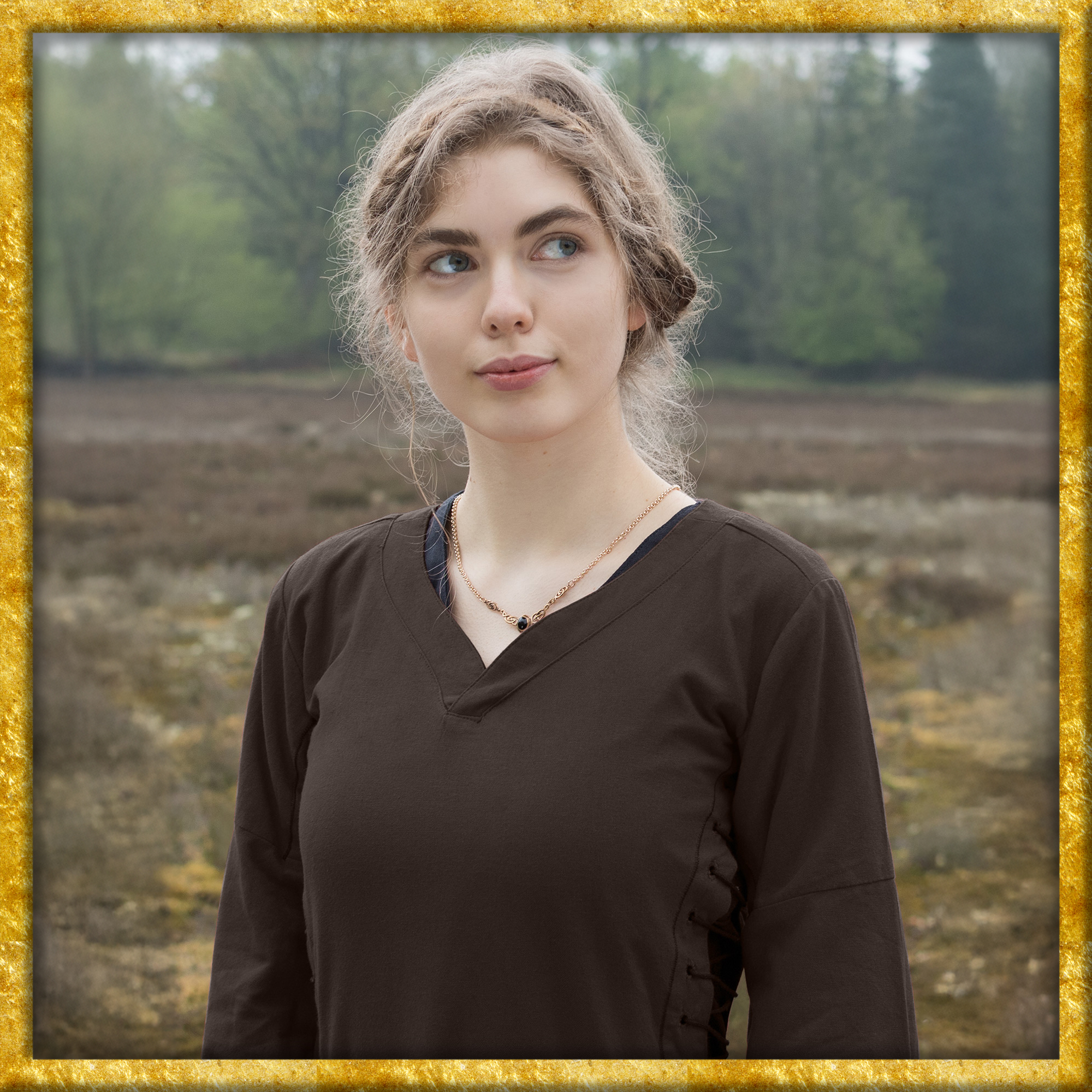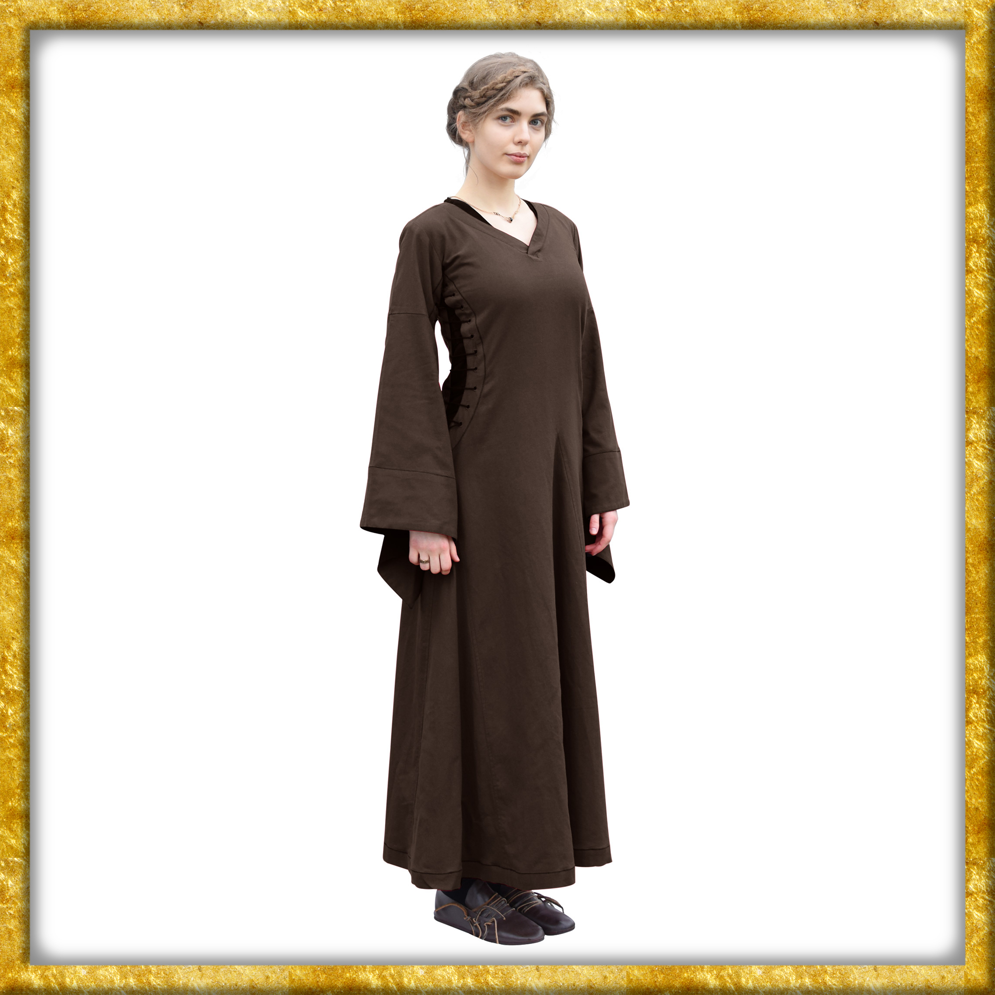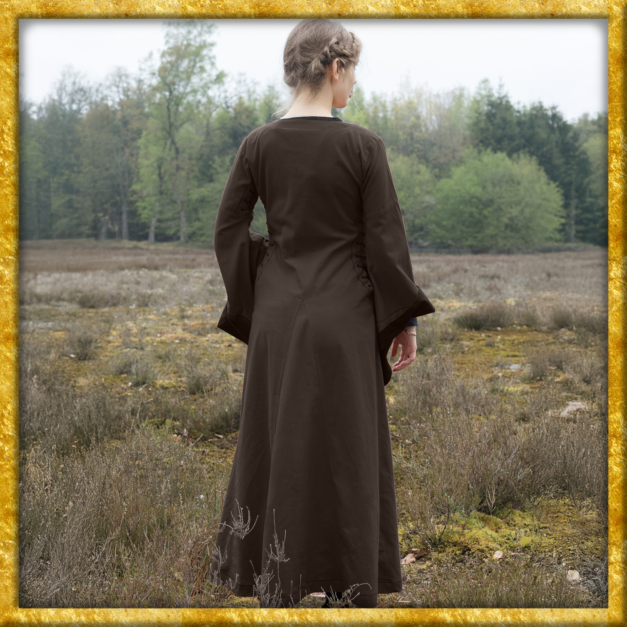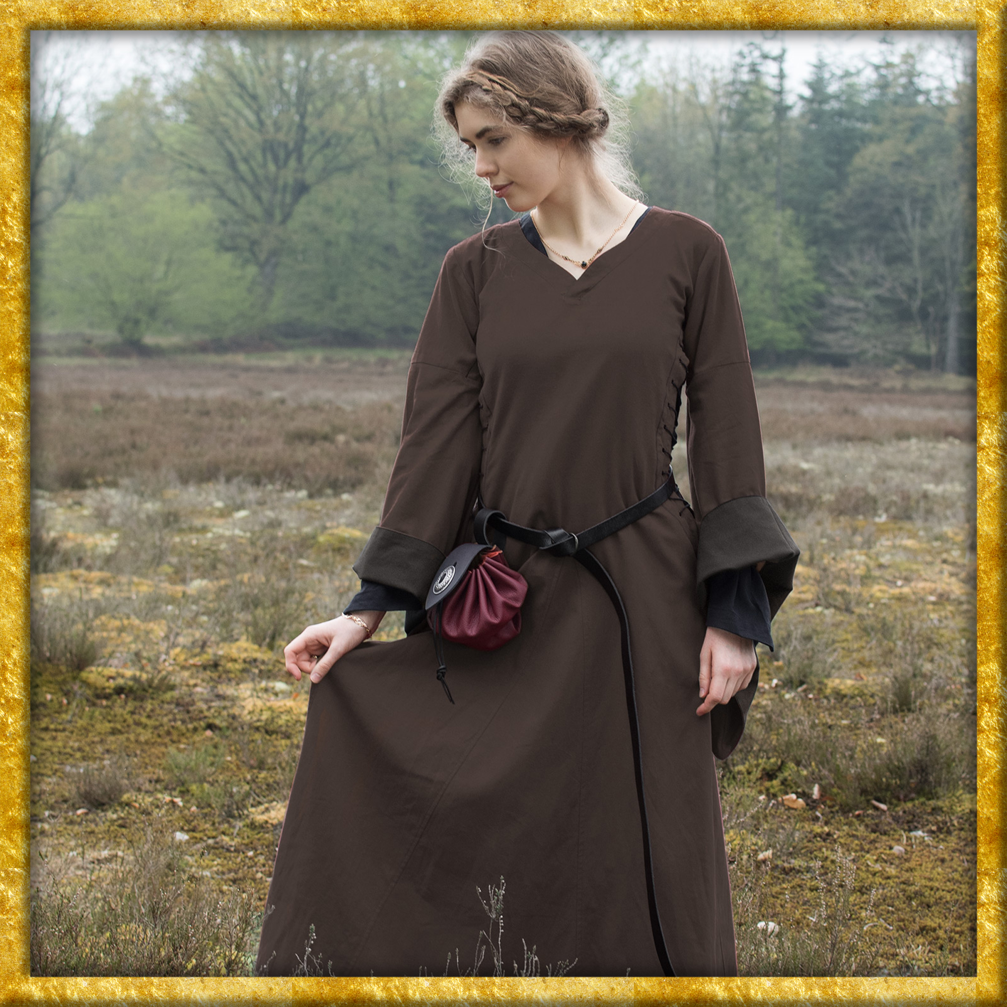 Dieses lange mittelalterliche Kleid aus Baumwollstoff ist tailliert geschnitten und hat farblich abgesetzte Details. Die Seitennähte sind ab der Hüfte bis zum Oberarm offen und mit einer Schnürung versehen - so lässt sich das Damenkleid individuell dem Körper anpassen. Diese seitlichen Öffnungen nennt man Höllenfenster, da sie den Blick auf das Untergewand freigeben und von der Kirche gar nicht gern gesehen war. Die Schnürbänder sind mit Nestelspitzen aus Metall versehen und lassen sich problemlos durch die gestickten Ösen fädeln. Im Rockteil sind seitlich und mittig sogenannte Geren (Stoffkeile) eingesetzt, die eine großzügige Saumweite erzeugen. Die ausgestellten Trompetenärmel und die Ziernähte am Ärmelsaum und um die Höllenfenster geben dem Kleid einen noblen Charakter.