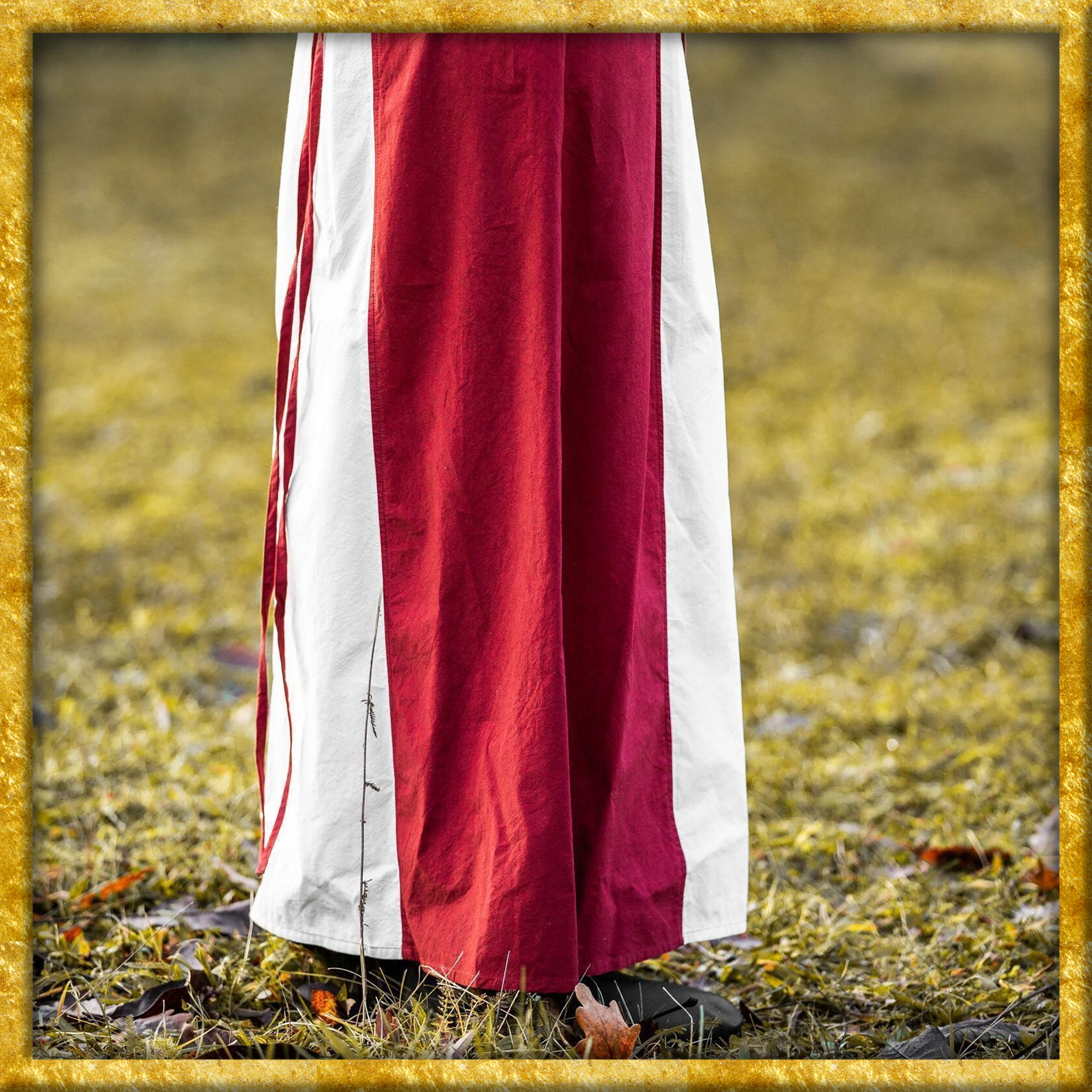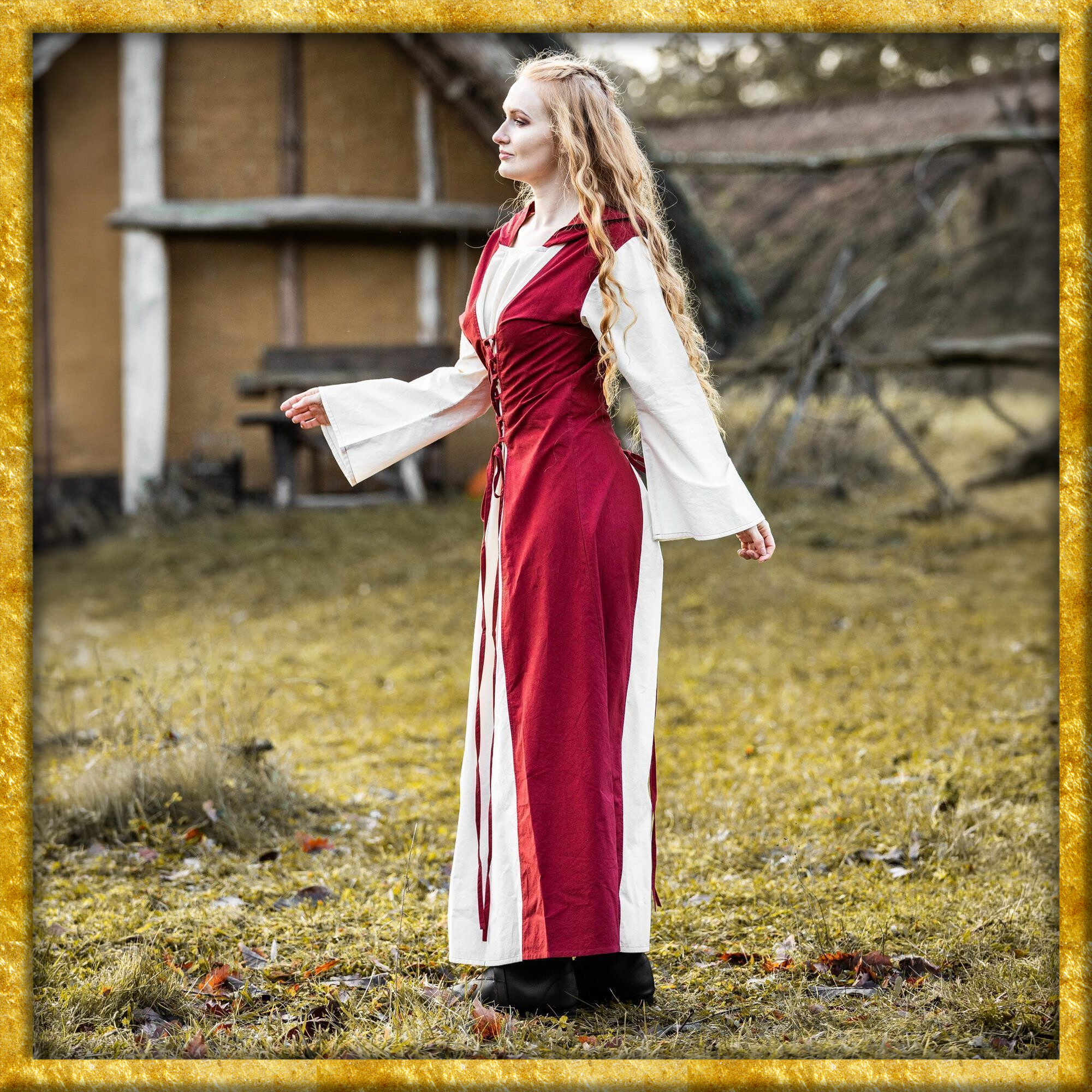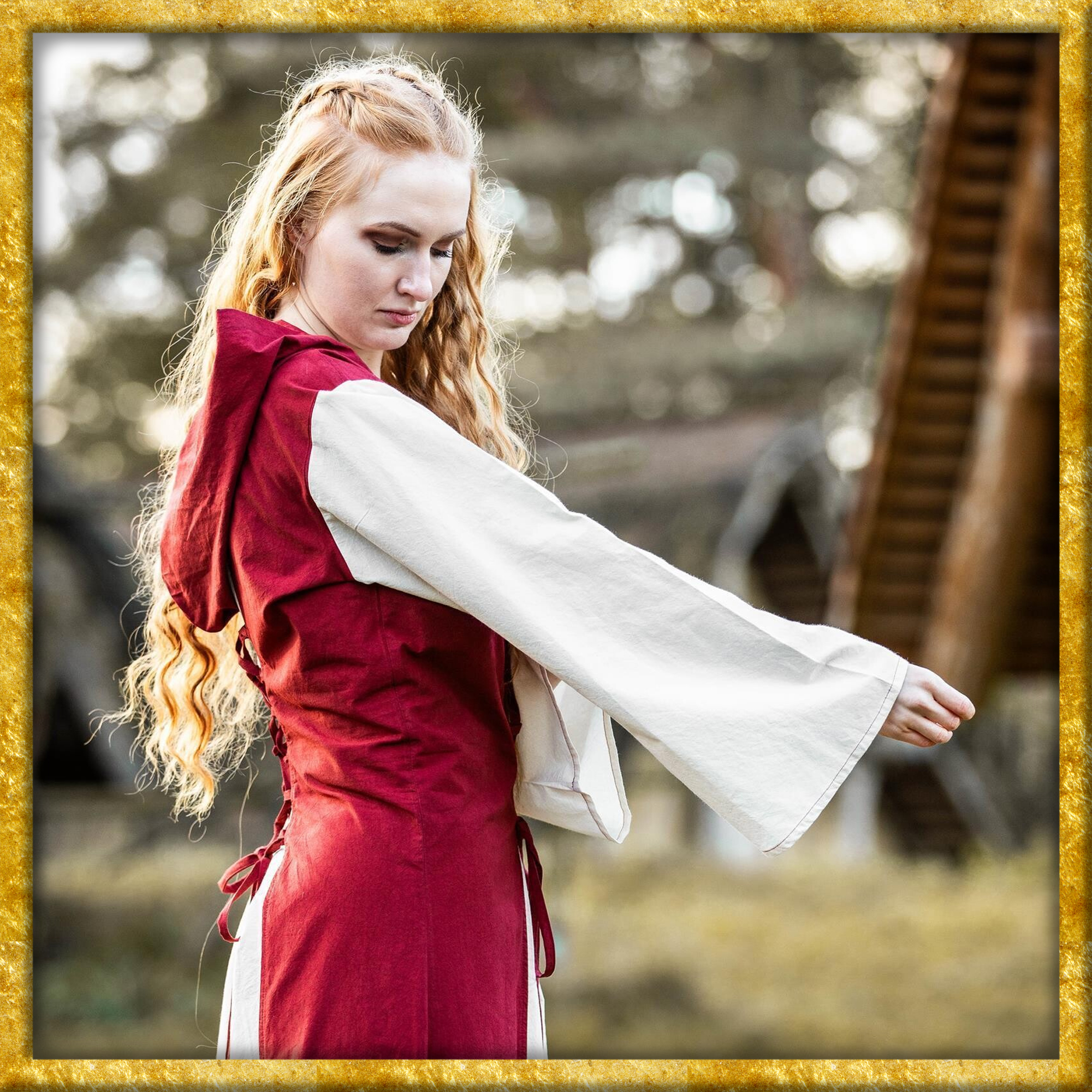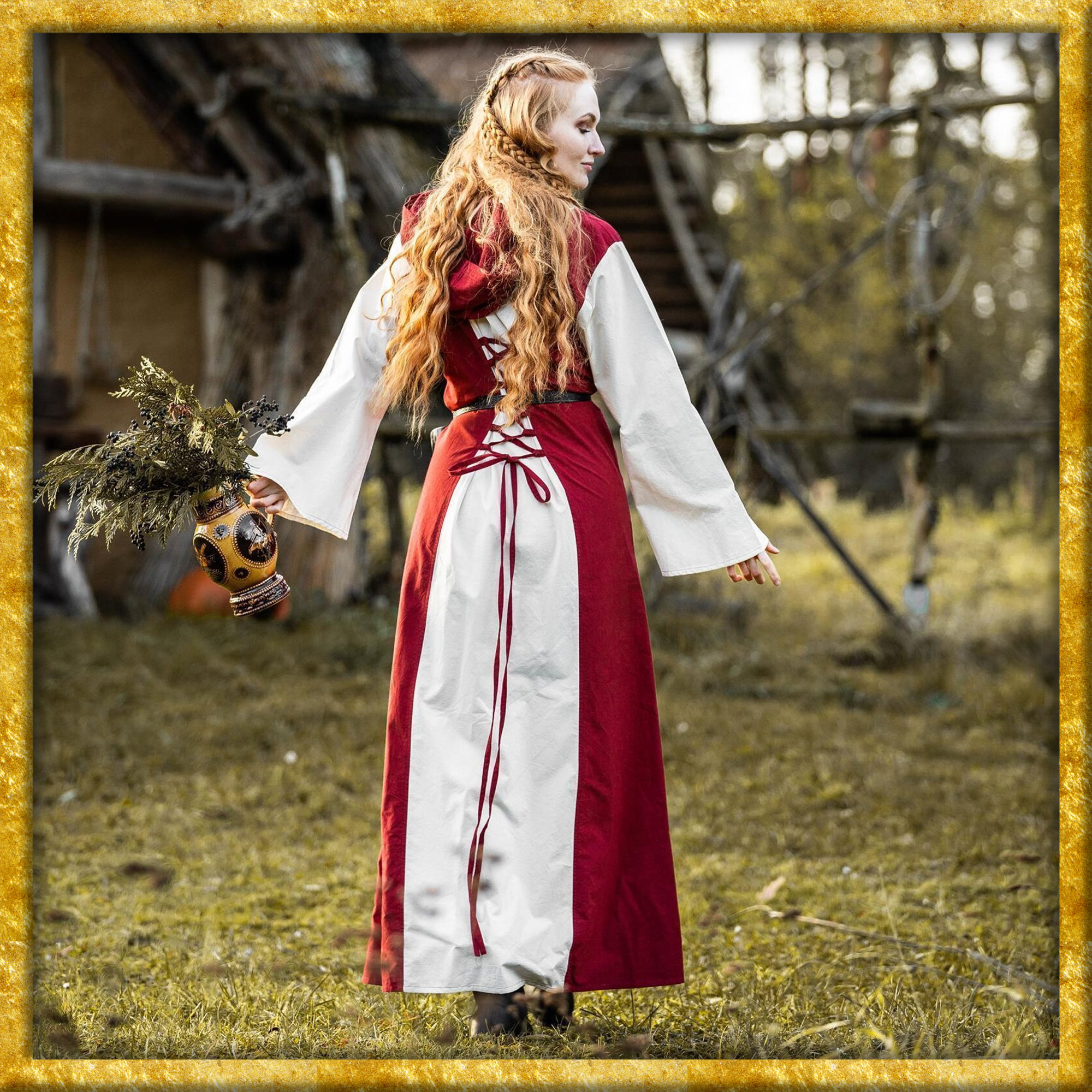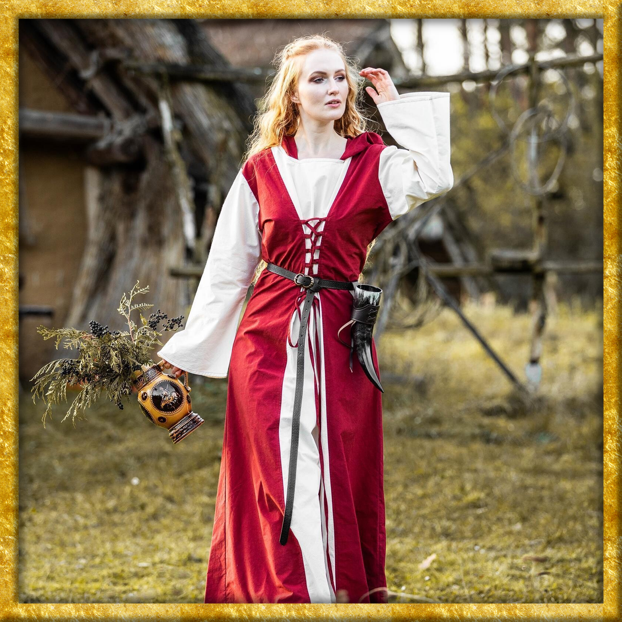 Unser Mittelalter Kleid Genefe bringt Dich mit seinem eleganten und dennoch funktionalen Design direkt in die Welt der Legenden. Die bodenlange, fliessende Silhouette verleiht Dir Anmut und Eleganz, während die stilvolle Kapuze geheimnisvolle Akzente setzt. Dank der Schnürung vorn und hinten kannst Du das Kleid perfekt an Deine Figur anpassen – ganz gleich, welche Abenteuer auf Dich warten. Das einzigartige Design mit dem tiefen V-Ausschnitt und den vertikalen Farbpaneelen sorgt für einen besonders eindrucksvollen Auftritt.