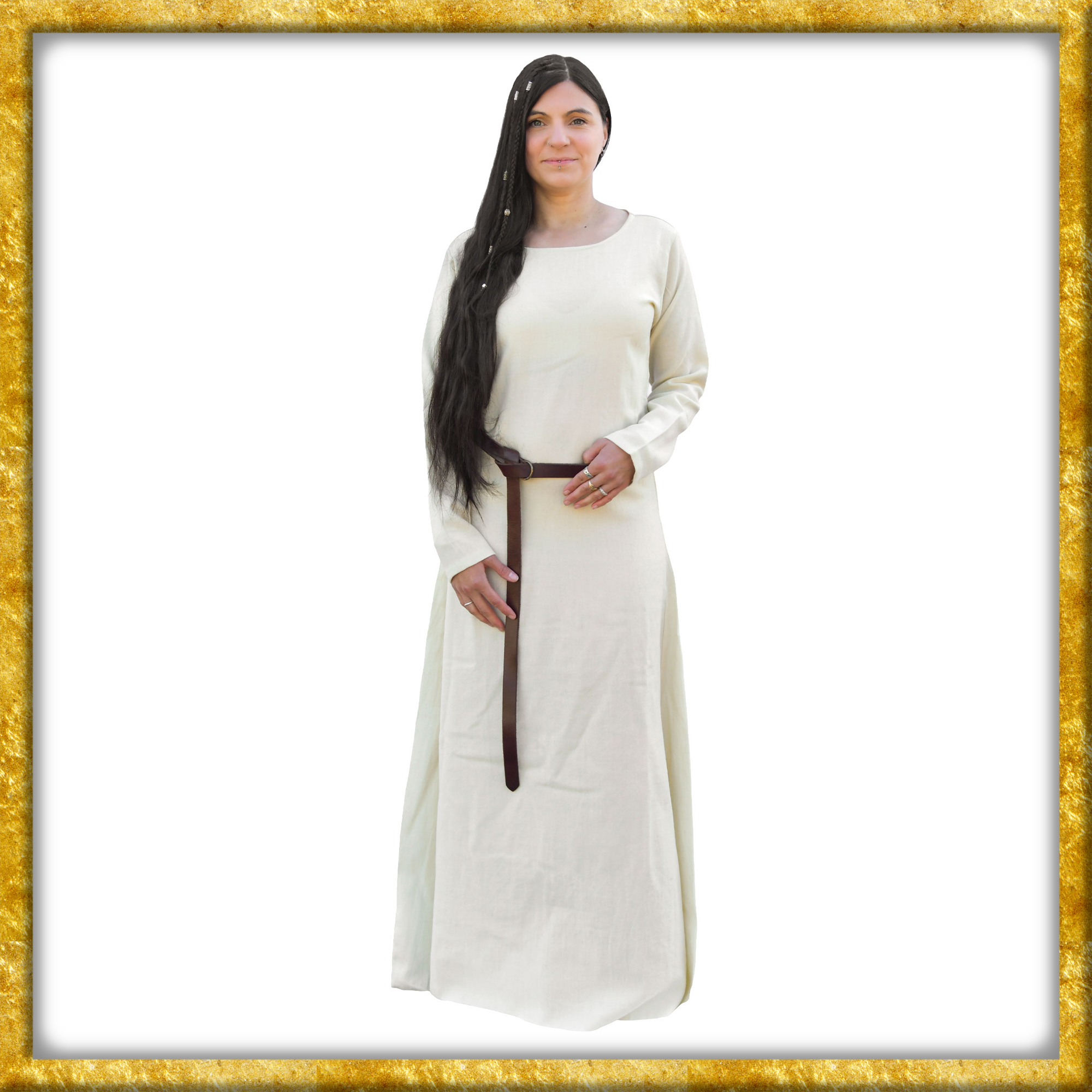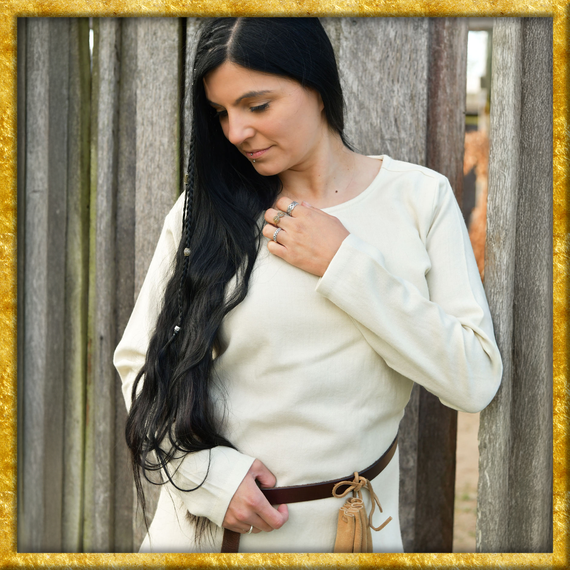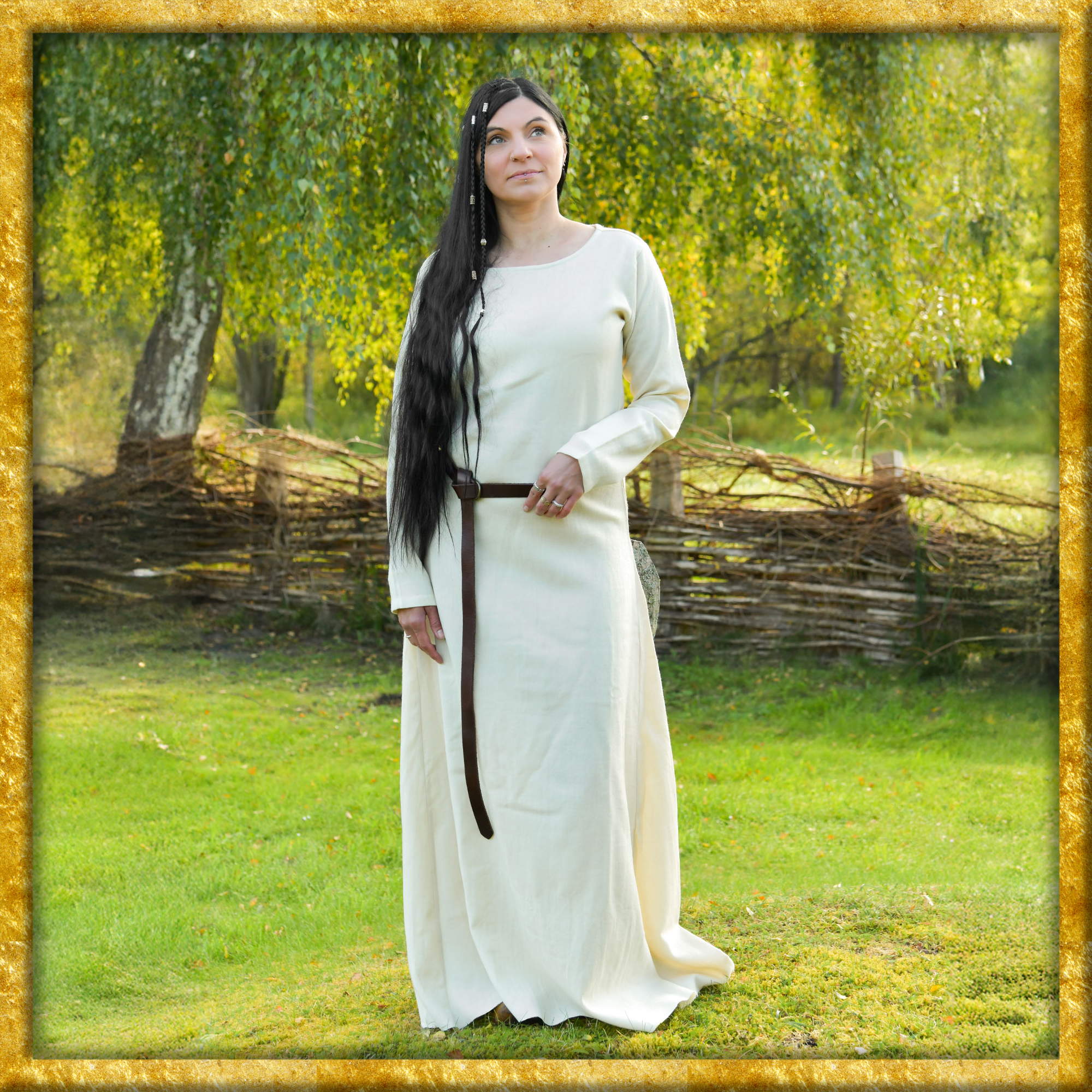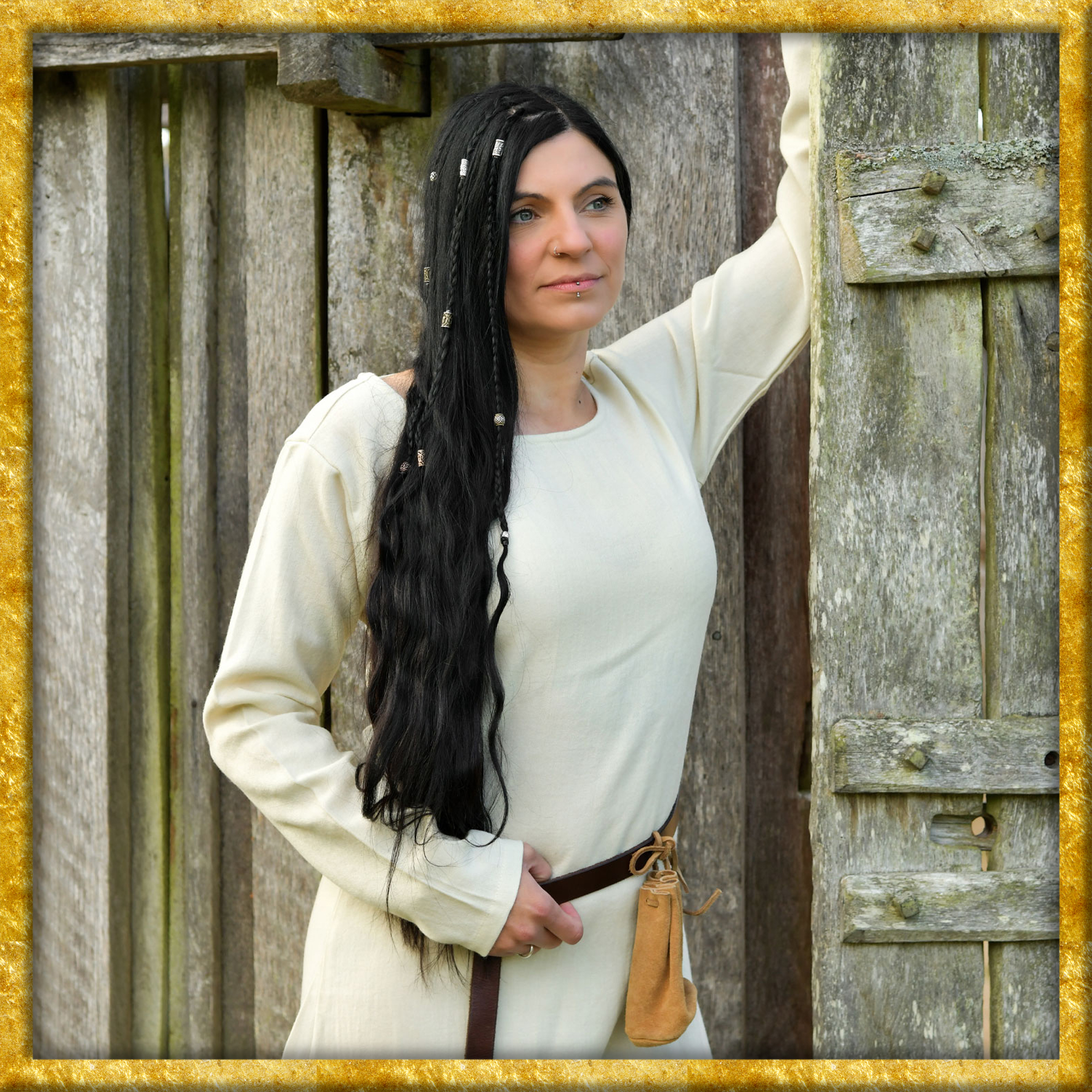 Durch seine schlichte Gestaltung ist das Wikingerkleid vielseitig einsetzbar. Da der Stoff leicht transparent ist, eignet es sich besonders gut als Unterkleid, beispielsweise unter einem aufwendig gearbeiteten Überkleid. In dieser Kombination spendet es zusätzliche Wärme und schafft zugleich einen authentischen Lagenlook. Mit einem robusten Ledergürtel und passenden Accessoires kann es aber auch als schlichtes Obergewand getragen werden.