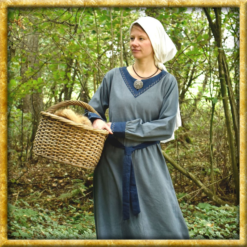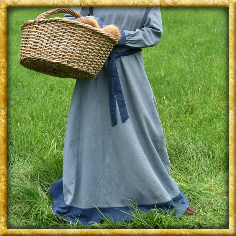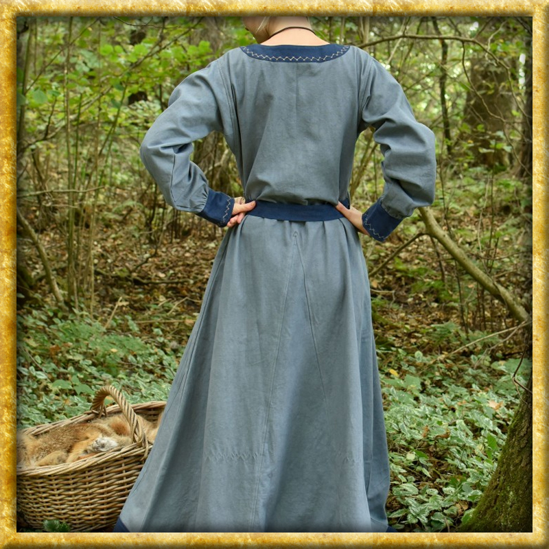 Das bodenlange, blaue Wikinger Kleid ist locker geschnitten und aus festem Baumwollstoff gefertigt und wird mit einem Stoffgürtel geliefert. Farblich abgesetzte Details mit handgefertigten Hexenstichstickereien machen aus diesem Kleid etwas Besonderes. Der geschlitzte Ausschnitt wird offen getragen oder mit einer Fibel verschlossen. Vorder- und Rückteil bestehen aus rechteckigen Stoffbahnen, mittig und seitlich sind sog. Geren (Keile) eingesetzt, die dem Saum genügend Weite geben. Unter dem Arm ist ein Zwickel, ein rechteckiges Stoffstück, eingesetzt. Der feste Canvas-Stoff (Segeltuch) macht das Kleid robust und schwer und ist daher geeignet für das Frühjahr und den Herbst.