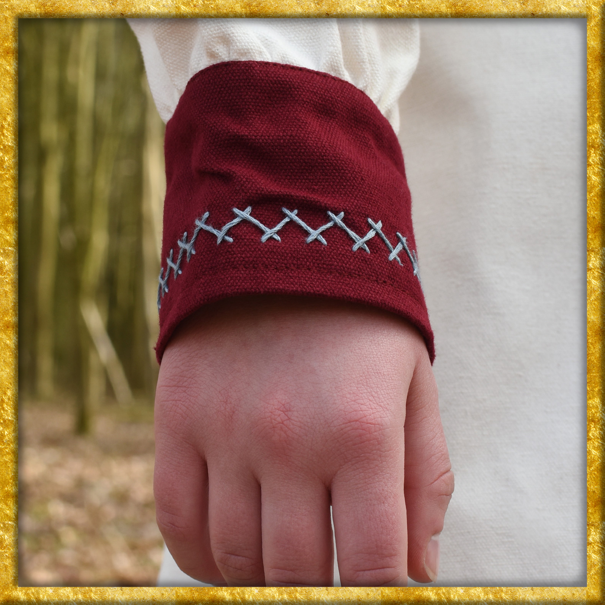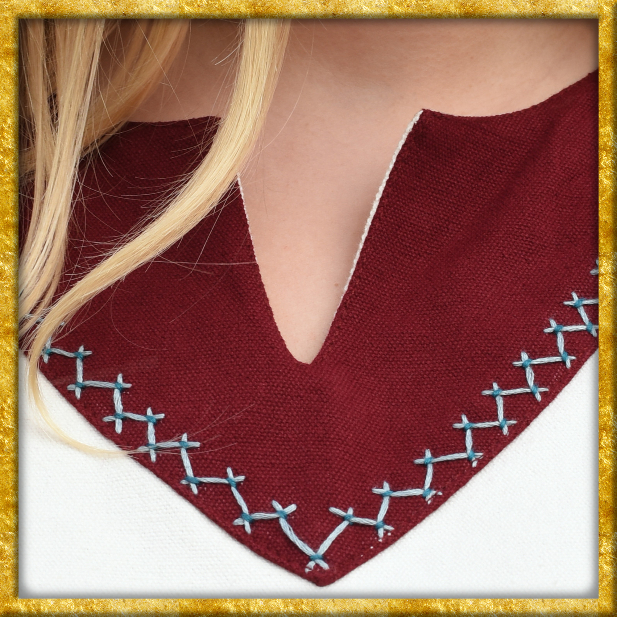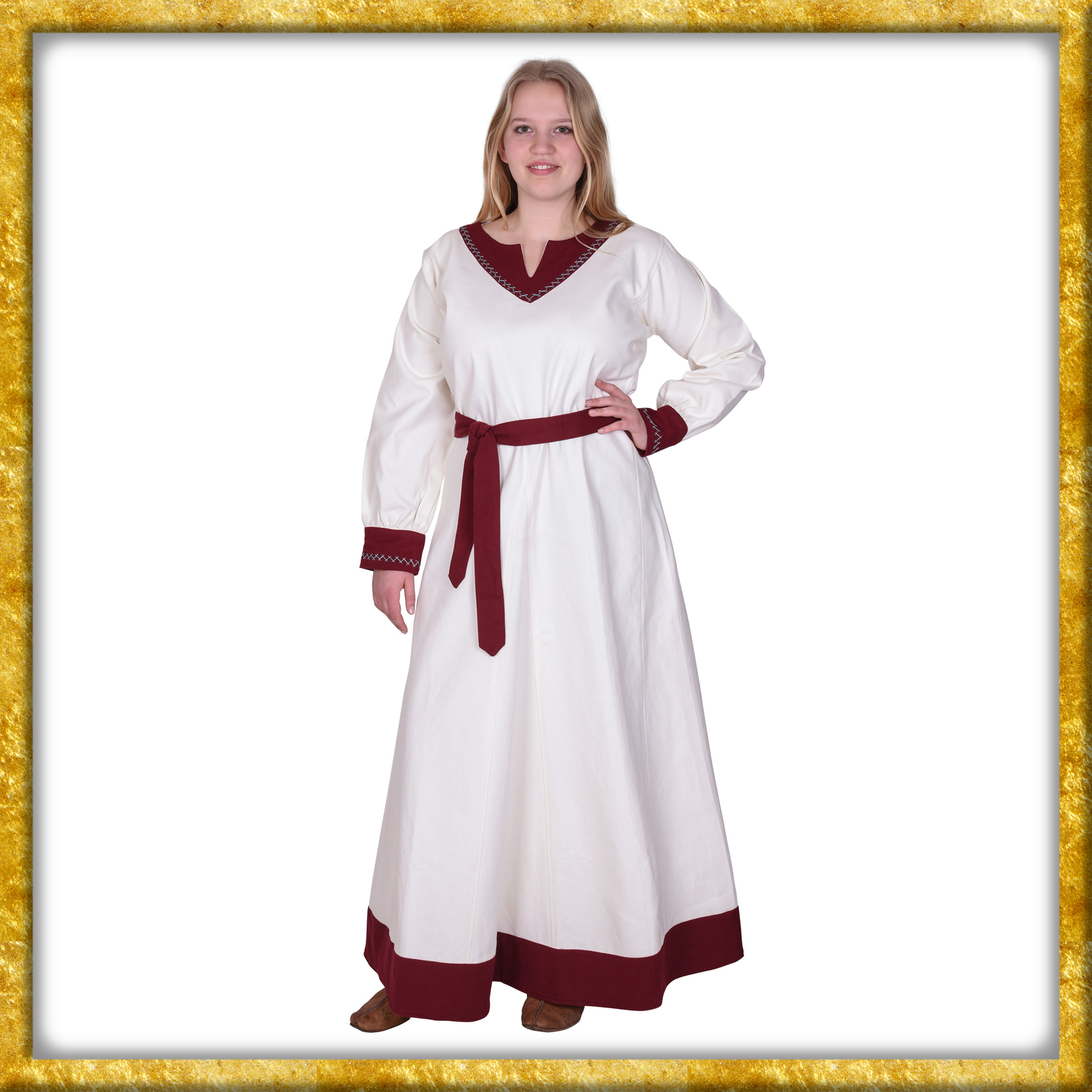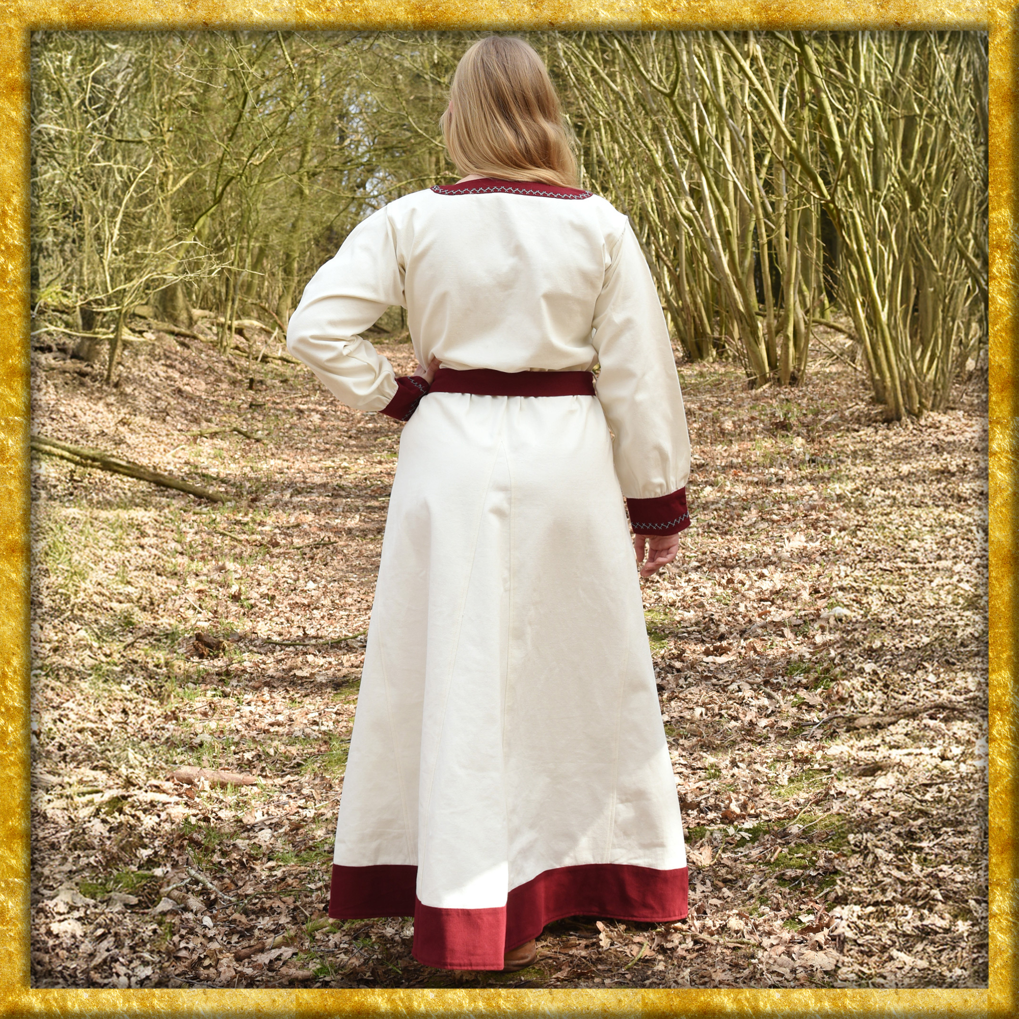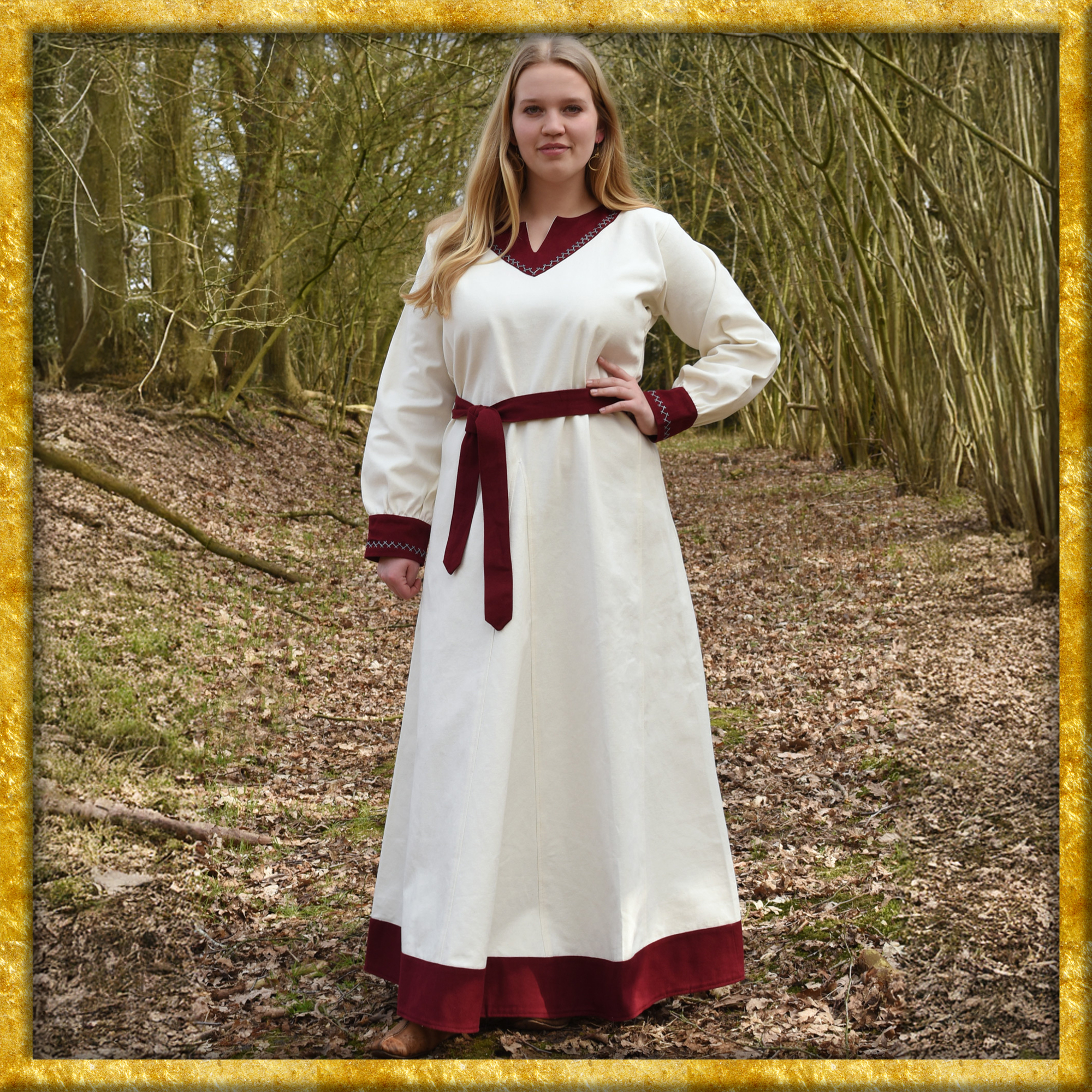 Dieses bodenlange Wikingerkleid aus naturfarben/weinrotem Baumwollstoff (Canvas) ist locker geschnitten und wird mit einem passenden Stoffgürtel geliefert. Farblich abgesetzte Details mit handgefertigten Hexenstichstickereien machen aus diesem Kleid etwas Besonderes. Der geschlitzte Ausschnitt wird offen getragen oder mit einer Fibel verschlossen. Vorder- und Rückteil bestehen aus rechteckigen Stoffbahnen, mittig und seitlich sind sog. Geren (Keile) eingesetzt, die dem Saum genügend Weite geben. Unter dem Arm ist ein Zwickel (rechteckiges Stoffstück) eingesetzt. Der feste Canvas-Stoff (Segeltuch) macht das Kleid robust und schwer und ist daher geeignet für das Frühjahr und den Herbst.