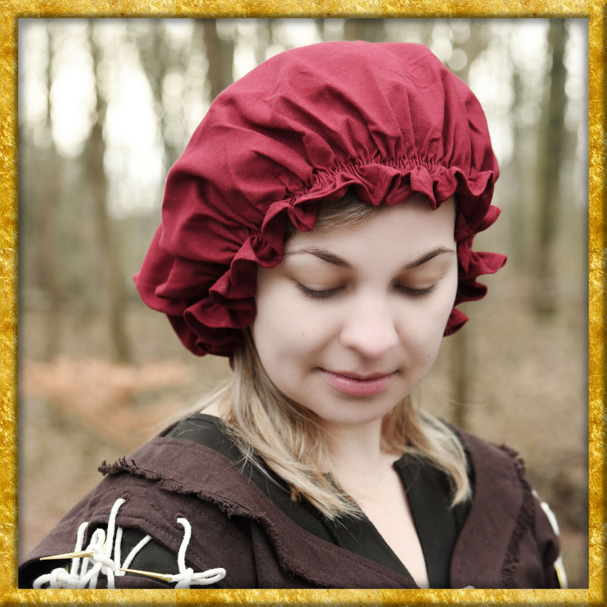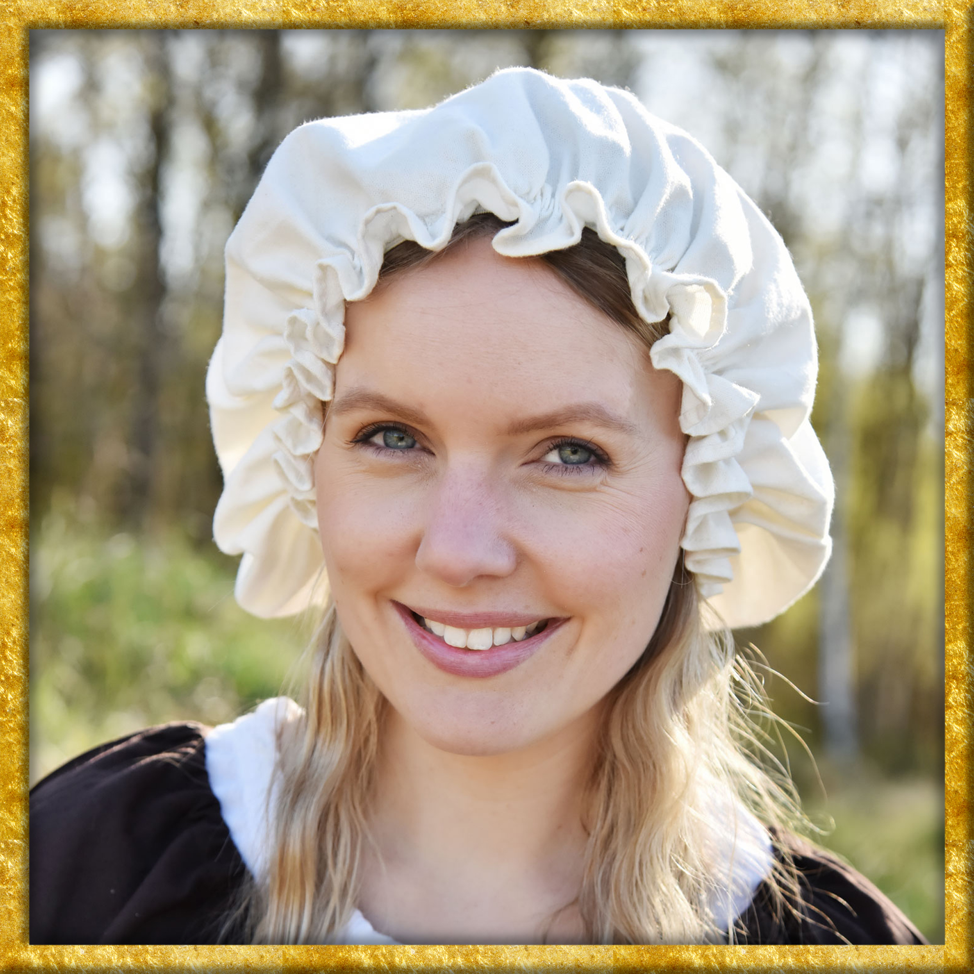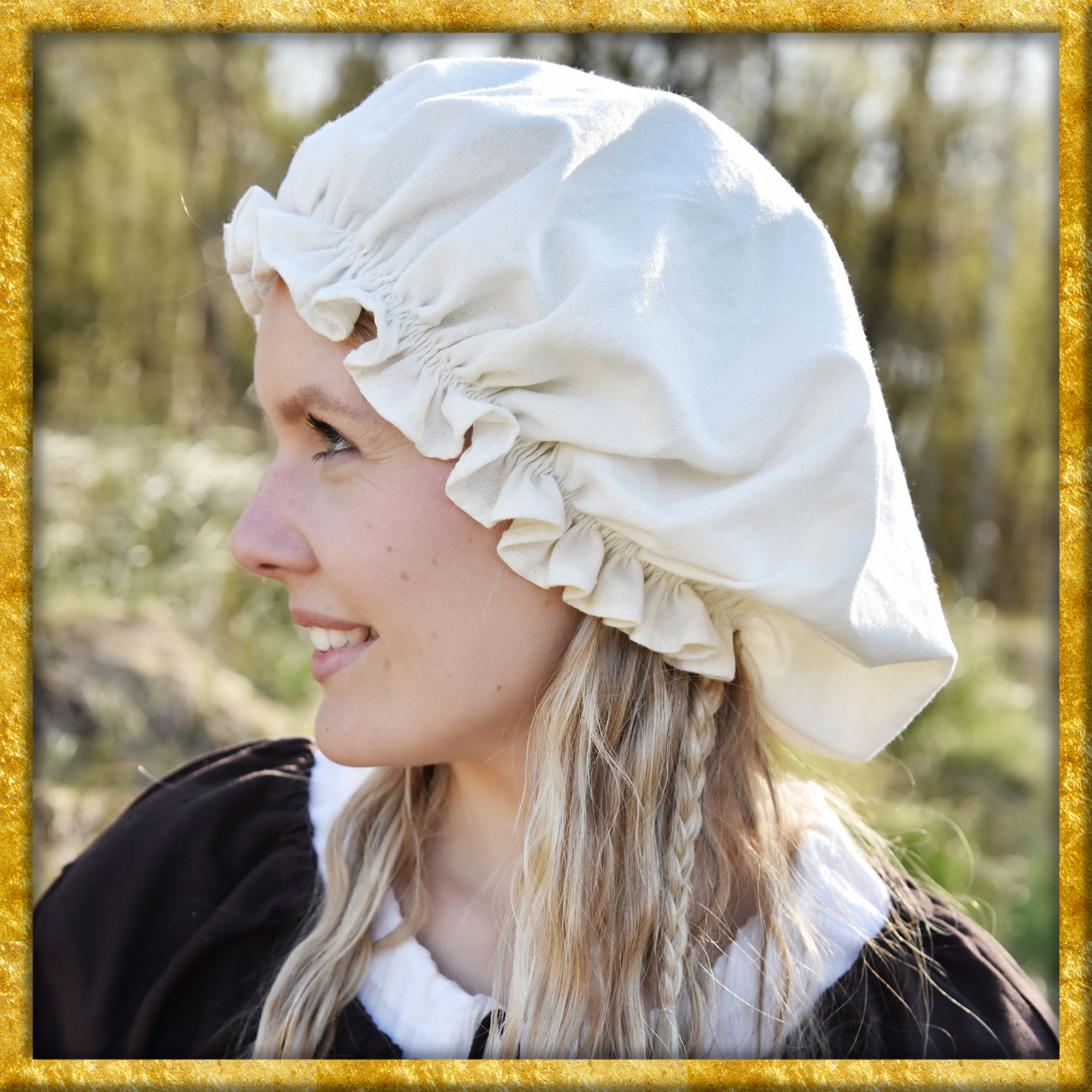 Diese Haube ist aus einem leichten Baumwollstoff gefertigt. Ein verdeckter Gummizug sorgt für einen guten Sitz und kreiert eine schöne Rüsche am Saum.