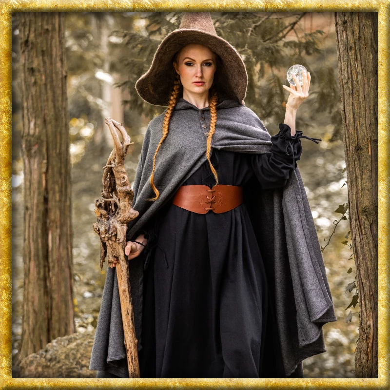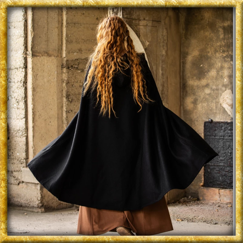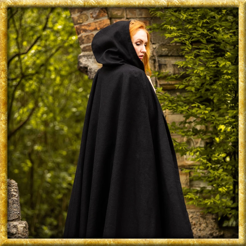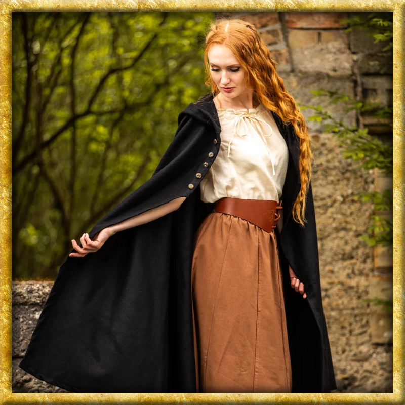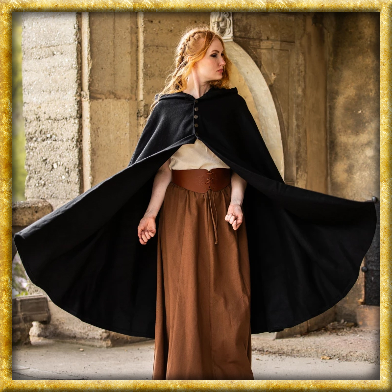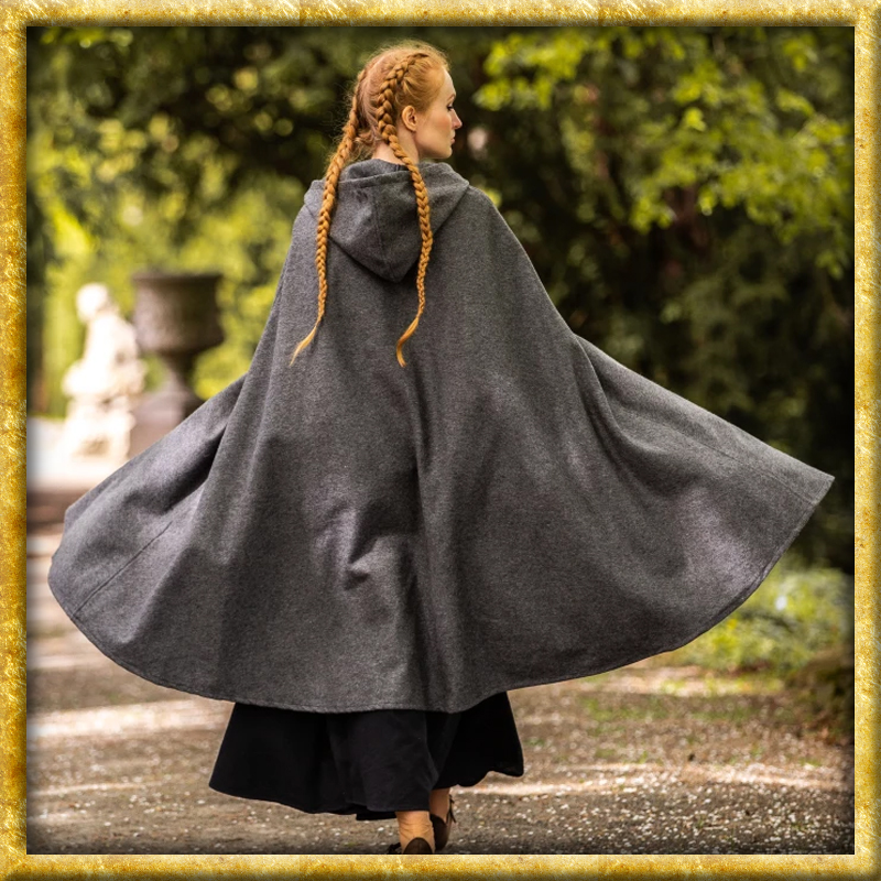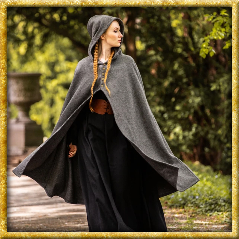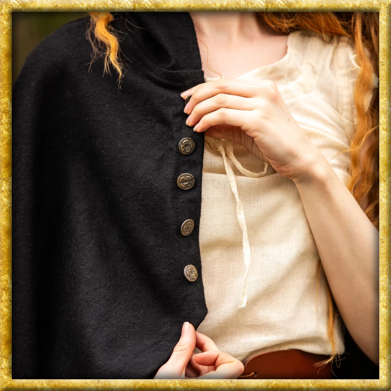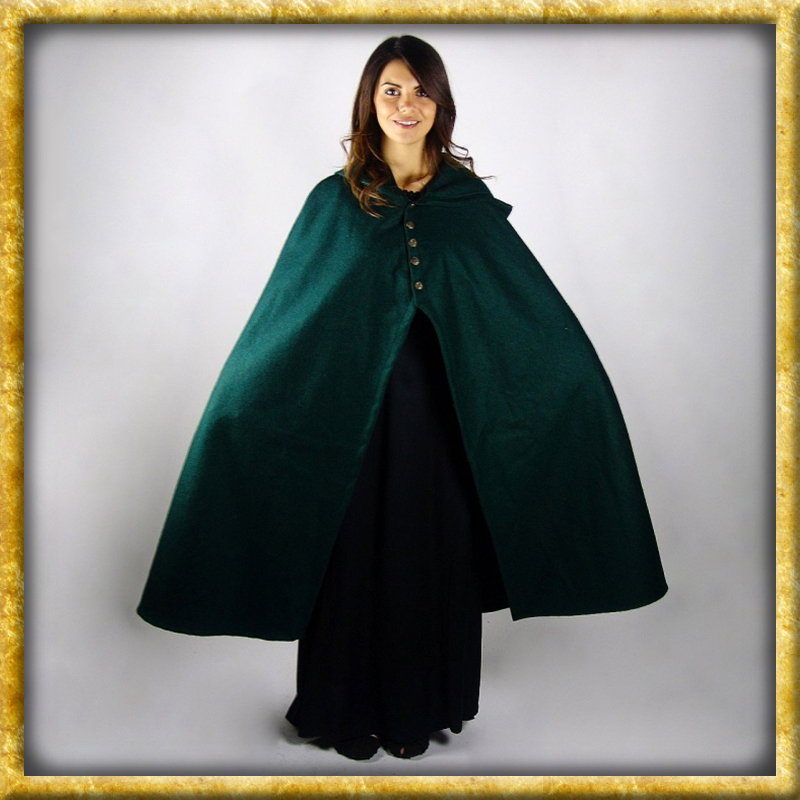 Dieser hochwertige Mittelalter Damenumhang besteht aus schwerem Wollgemisch und verfügt über Metallknöpfe an der Vorderseite. Durch seine schützende, kurze Kapuze und durch seine hochwertige Verarbeitung wirkt er bei leichtem Regen wasserabweisend.