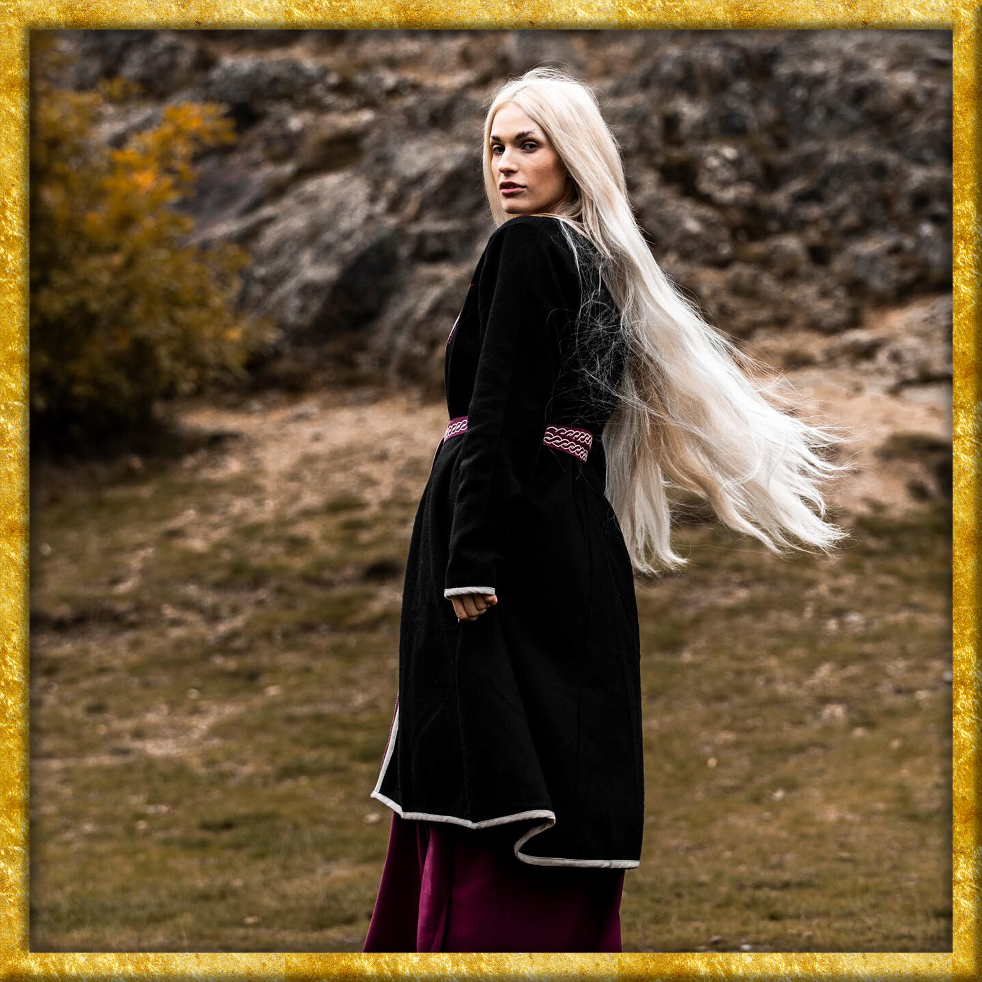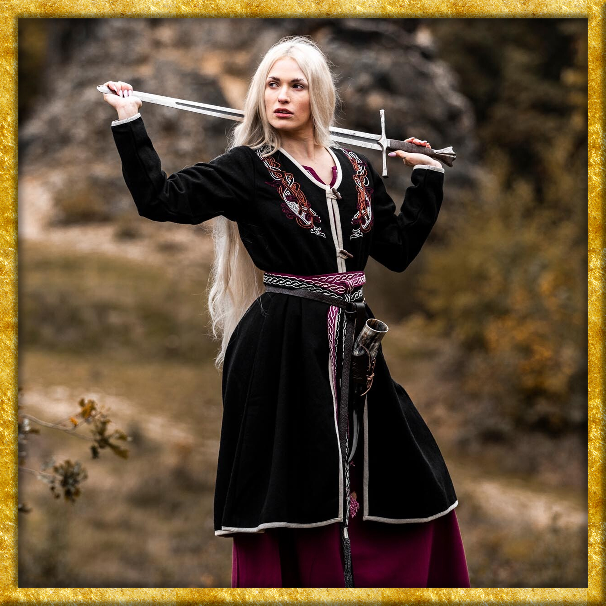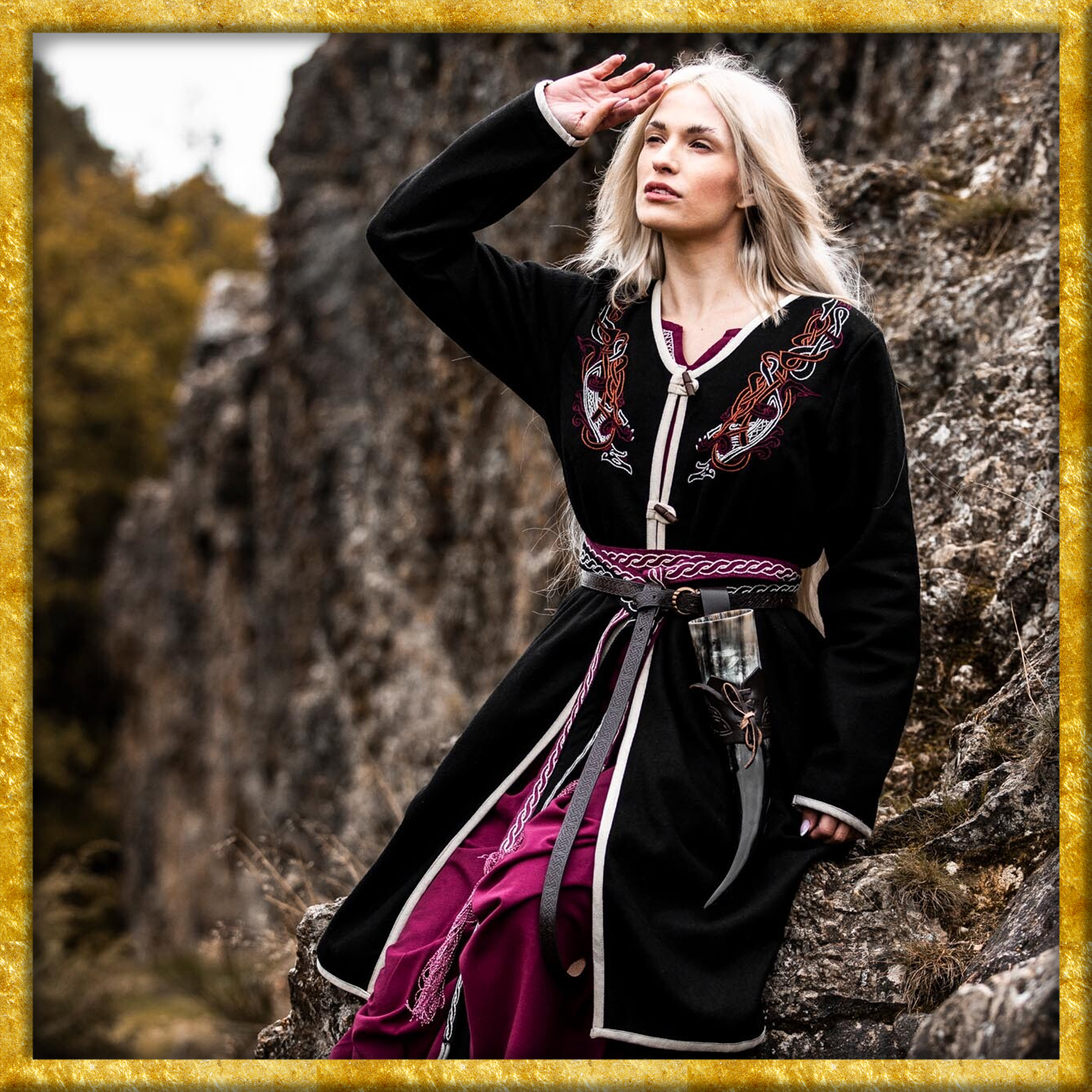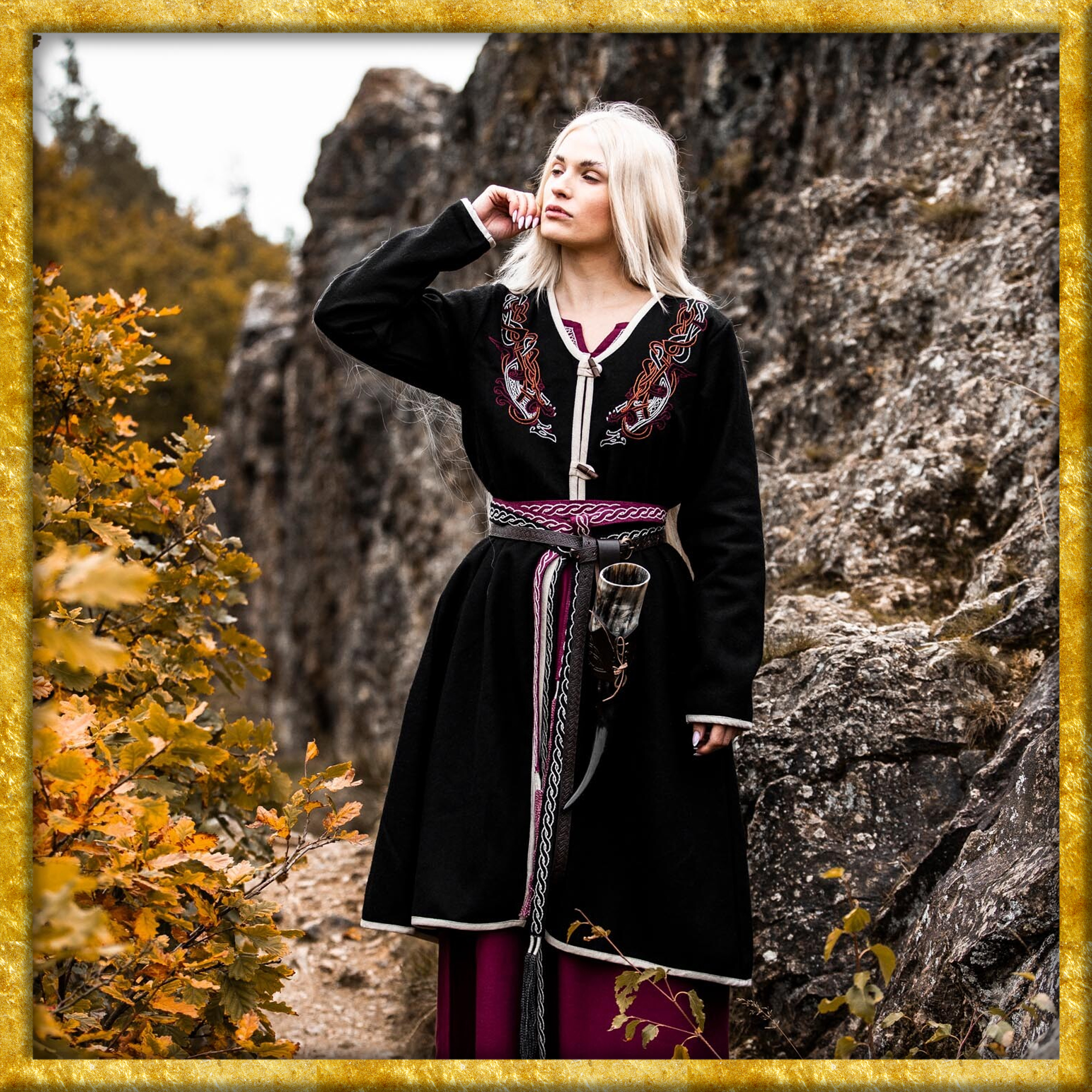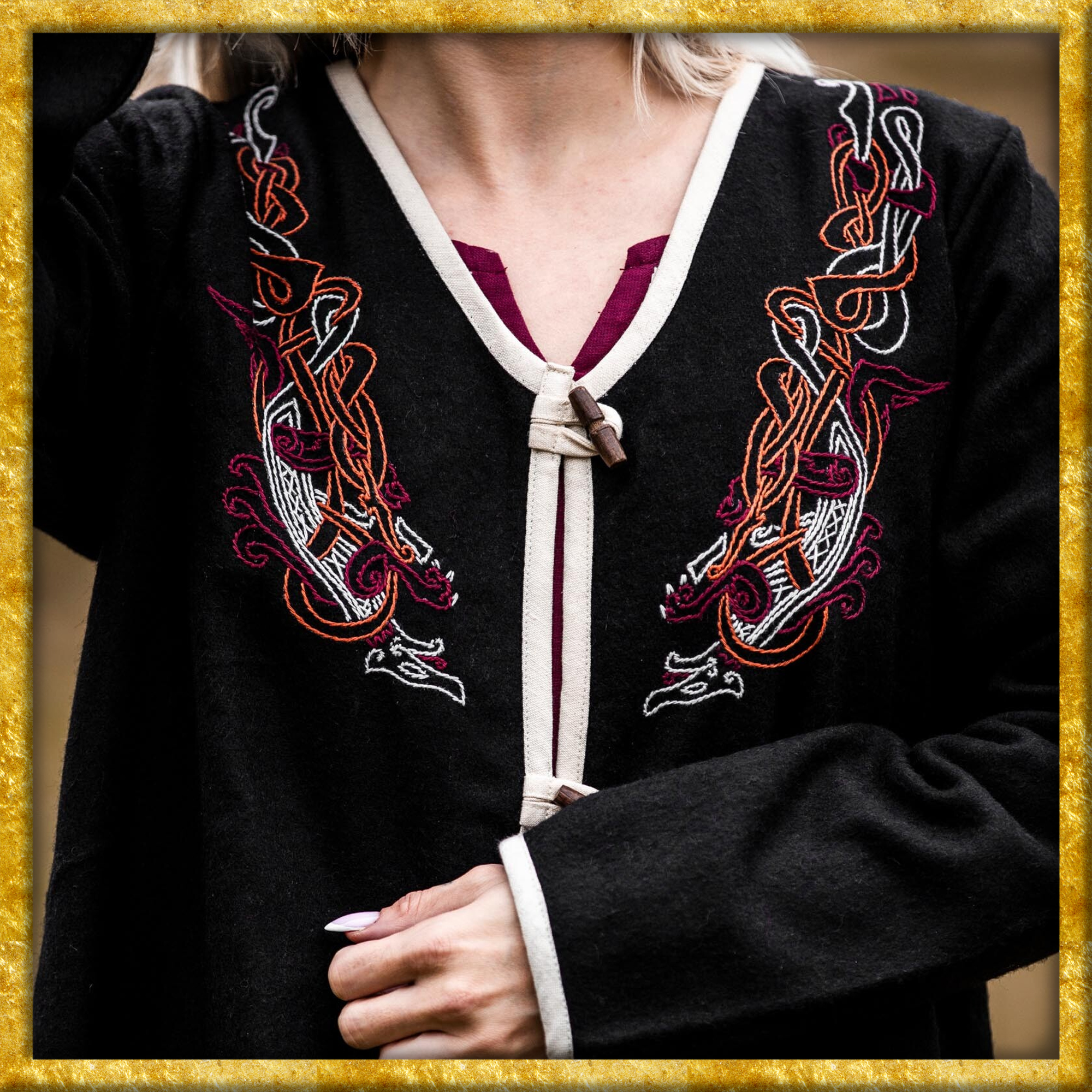 Ein besonderes Highlight ist die aufwändige Handstickerei im original Urnes-Stil, die am Halsbereich angebracht ist. Diese Stickerei verleiht dem Mantel eine unverwechselbare Identität und zeigt die beeindruckende Handwerkskunst der Wikingerzeit. Der Wikinger Birkamantel ist nicht nur für historische Reenactments und LARP-Veranstaltungen ideal, sondern auch für alle, die ein einzigartiges Kleidungsstück mit historischem Flair suchen.