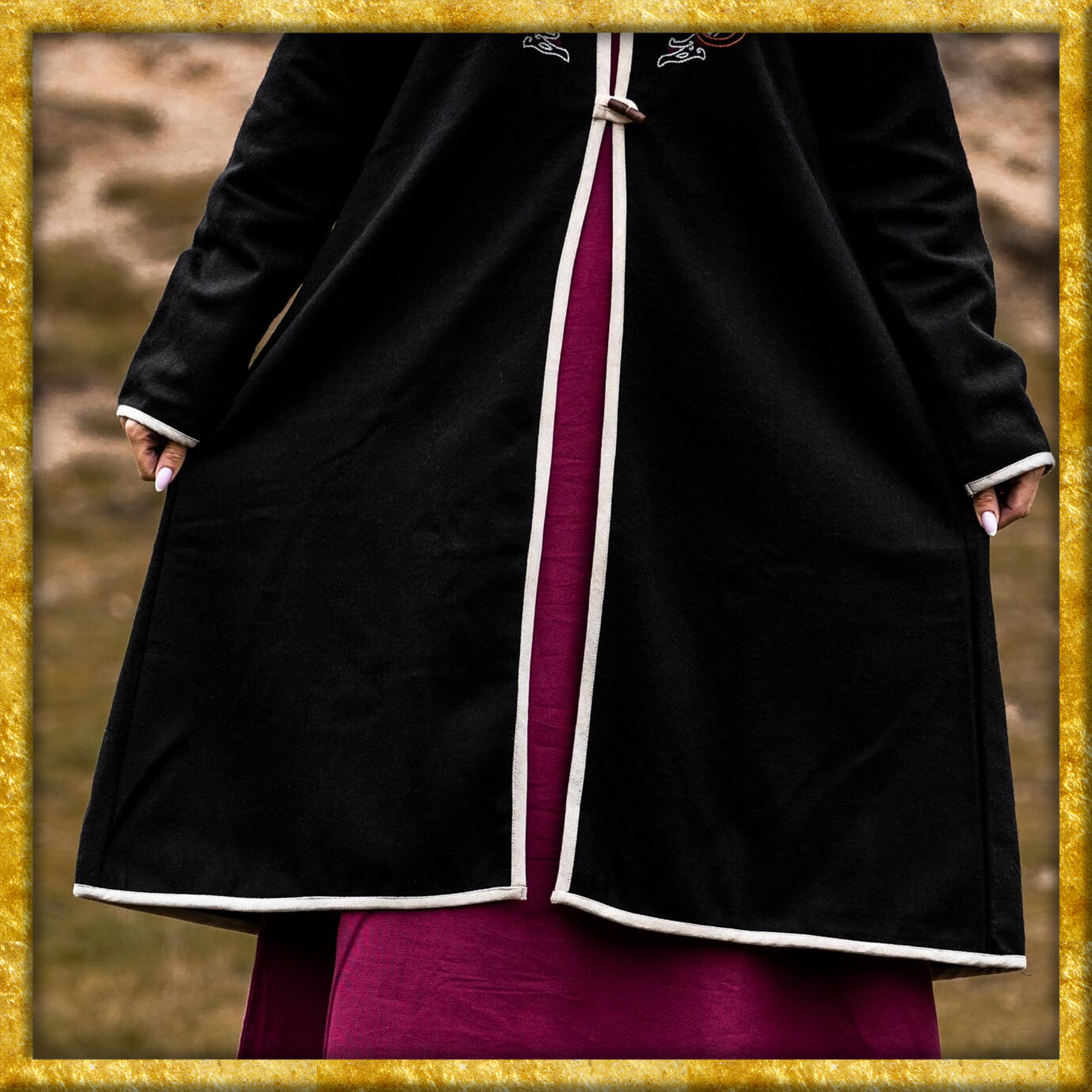 Entdecke mit dem Wikinger Birkamantel eine exzellente Replikation eines historischen Kleidungsstücks aus der Zeit der Wikinger. Gefertigt aus einem hochwertigen Wollgemisch, bietet dieser Mantel sowohl Wärme als auch authentische historische Eleganz. Die vorderen Holzknöpfe fügen dem Mantel eine rustikale und traditionelle Note hinzu. Die einfarbige Baumwollbordüre, die den Mantel ziert, unterstreicht seine Einfachheit.