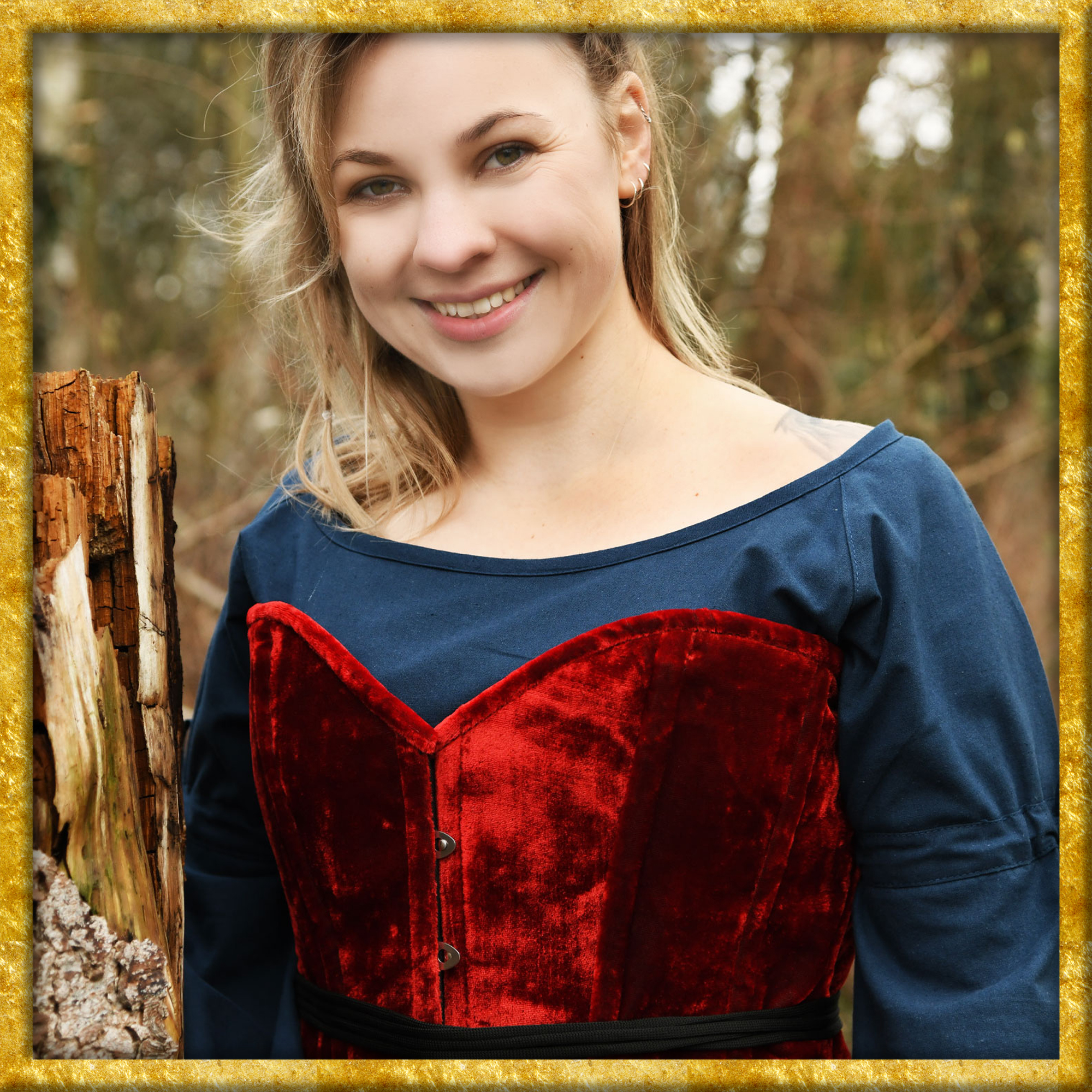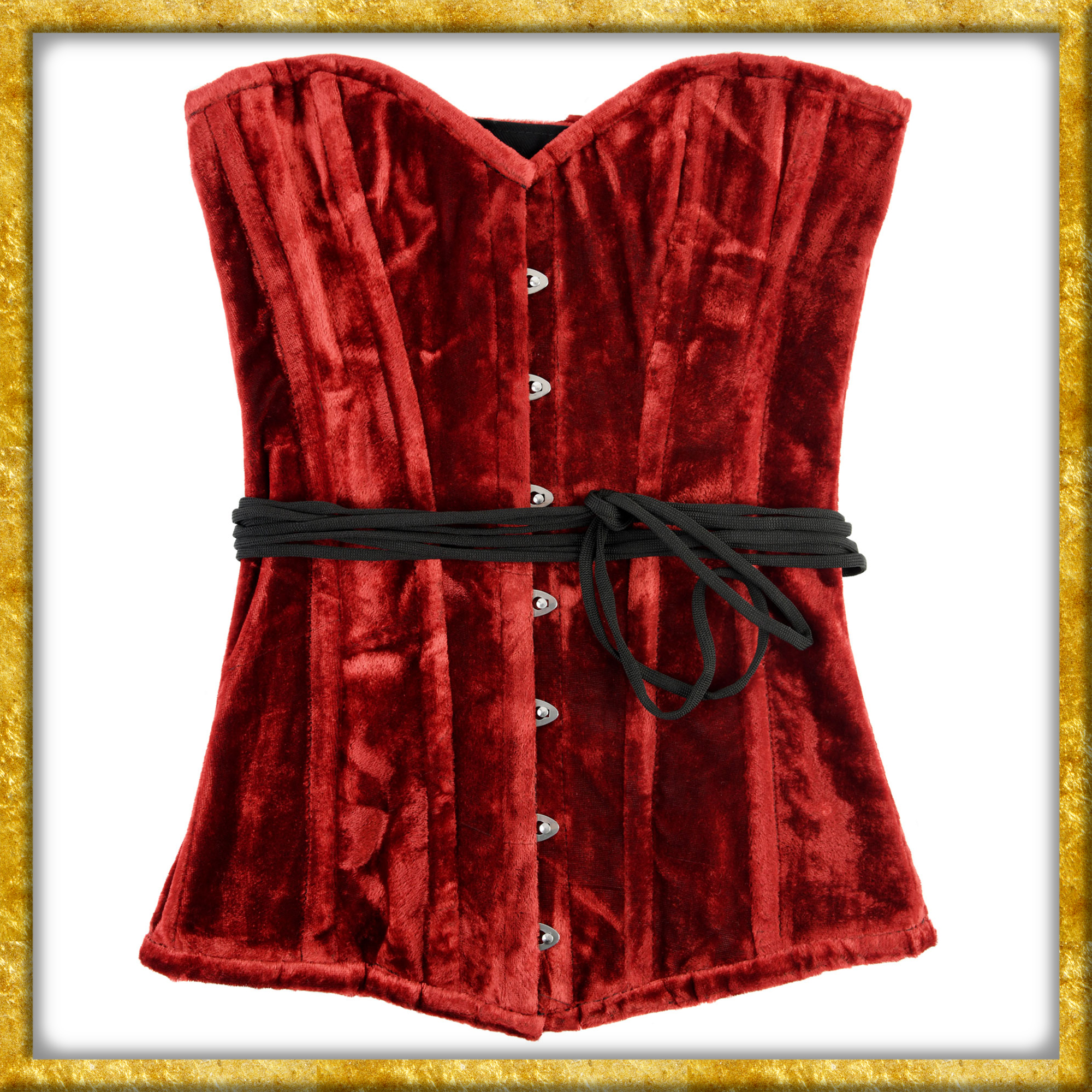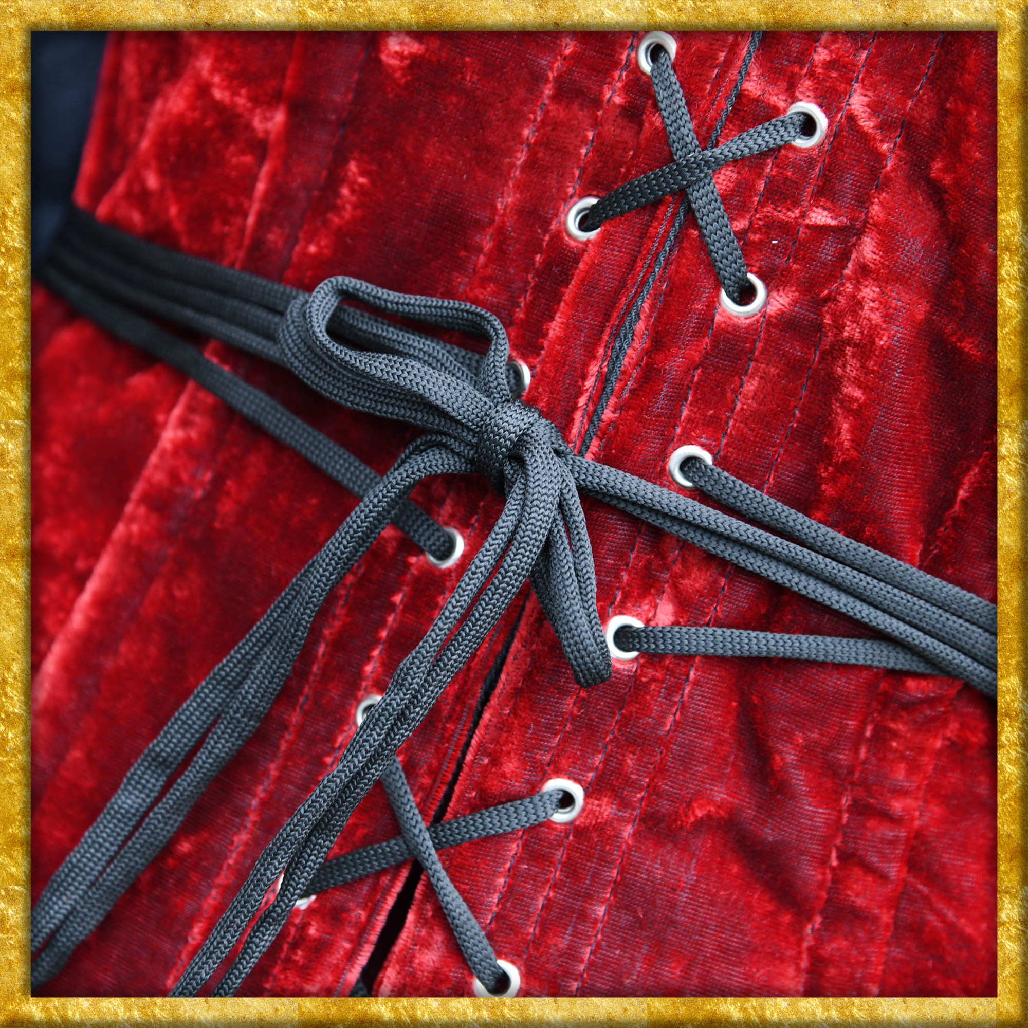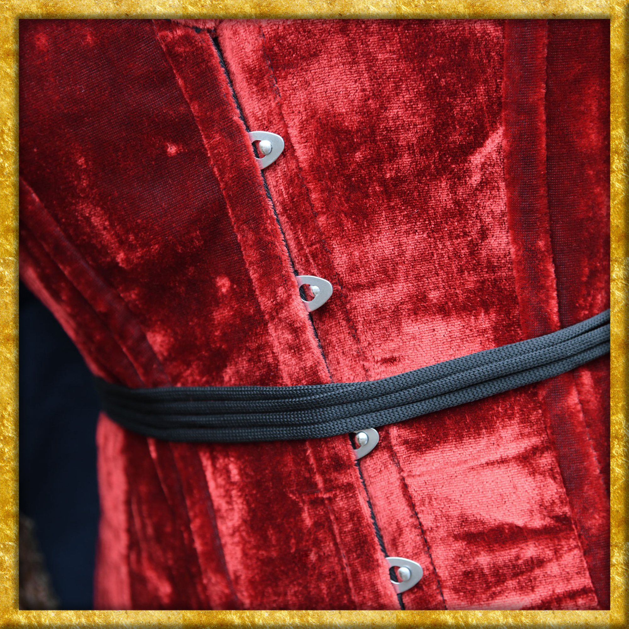 Diese mittelalterliche Corsage ist aus rotem Samt gefertigt und mit einem Baumwollfutter versehen. Die Längsnähte sind mit Stäben verstärkt. Diese kreieren beim Schnüren eine wunderbar weibliche Silhouette. Die Corsage ist vorne mit Metallhaken und hinten mit einer Schnürung versehen, was das Anziehn enorm erleichtert. Erst wird die Schnürung gelockert, dann die Haken geschlossen und nun wird die Schürung in der Taille festgezogen. Ein Untertritt an der hinteren Mitte verdeckt den Spalt der bei der Schnürung sonst freibleiben würde. Das Schnürband ist leicht elastisch, was dem Schnüren und dem Tragekomfort sehr zugutekommt. Die Corsage ist sehr hochwertig gearbeitet und ungewöhnlich bequem, ihr werdet überrascht sein.