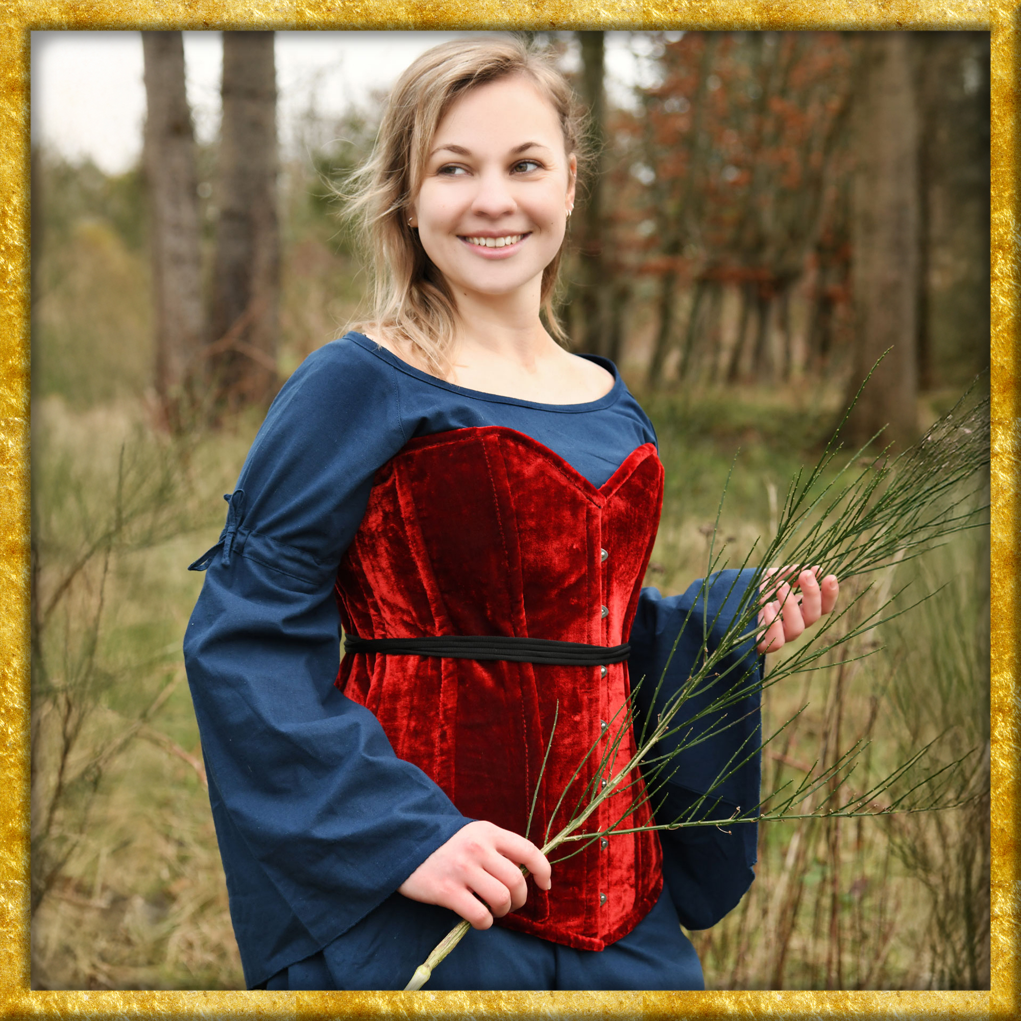 Die Samtcorsage lässt sich gut zur Bluse und zum Rock kombinieren oder über ein lockeres Kleid. Wer nicht auf einen authentischen Look pocht, kann mit dieser Corsage sein Kostüm für eine Piratin, Schildmaid, Hexe oder Edeldame vervollständigen.