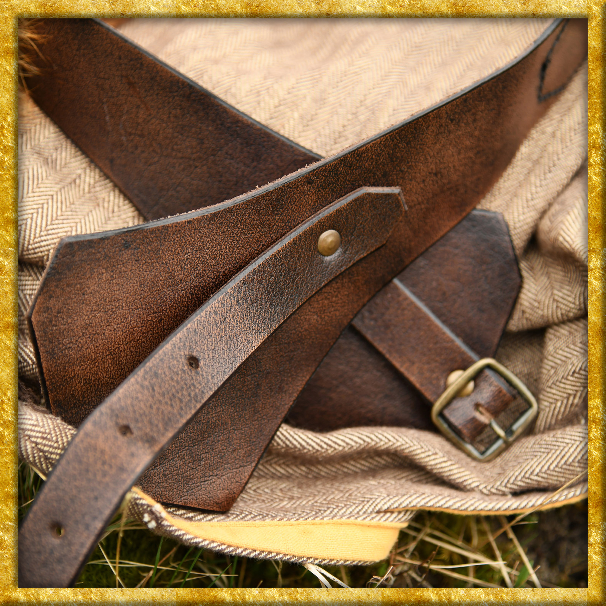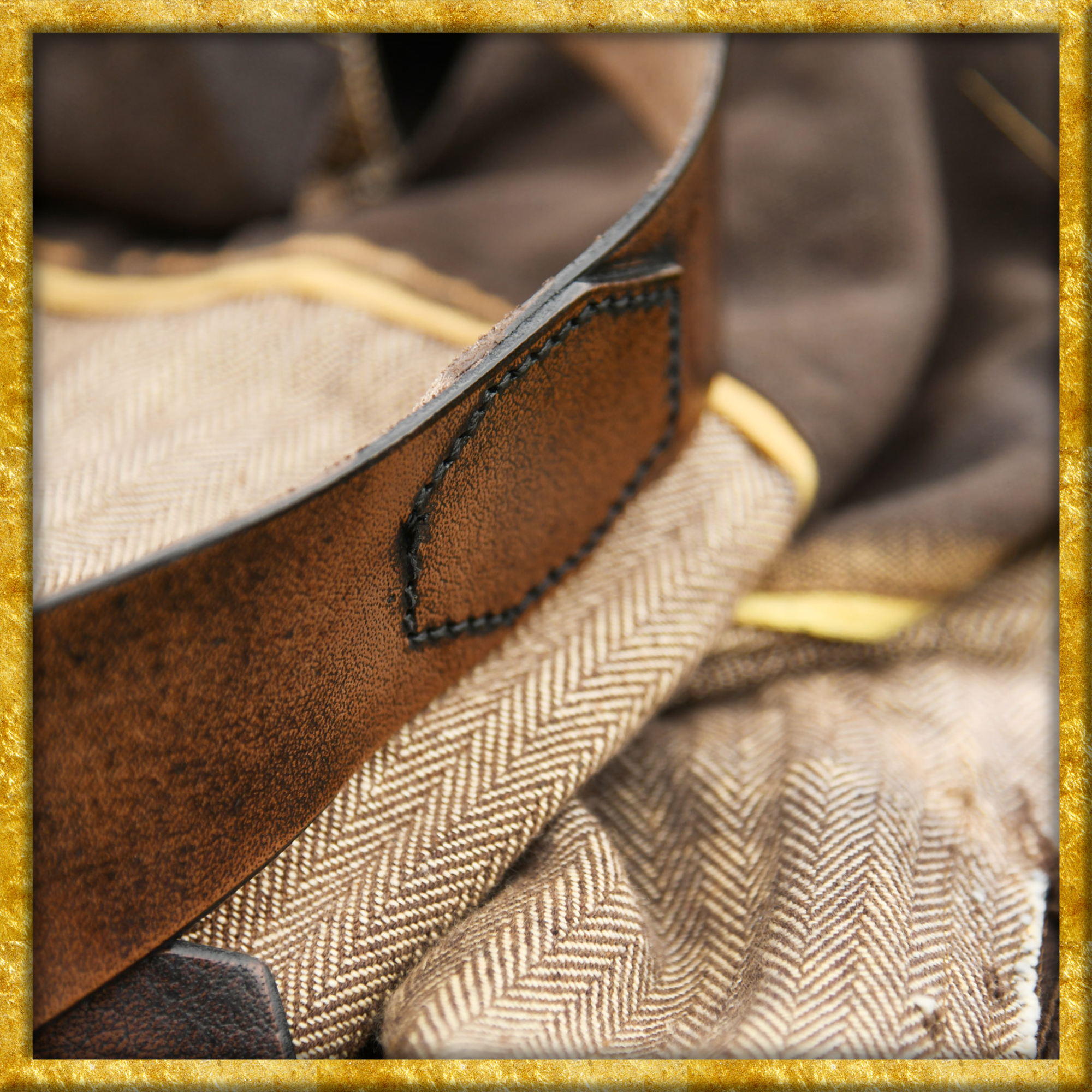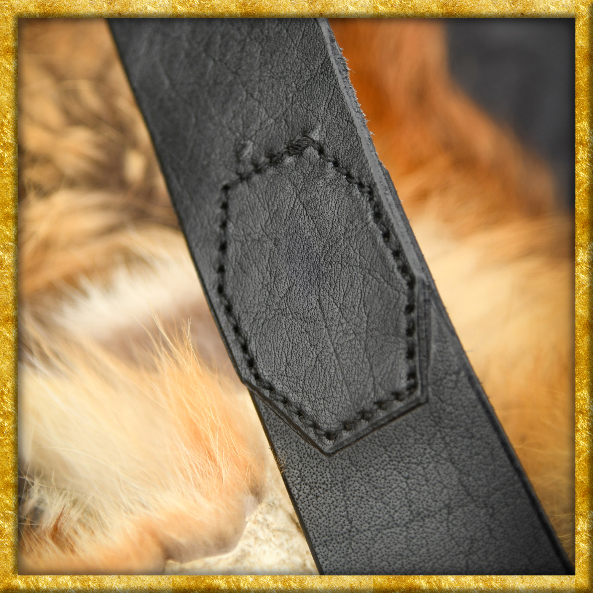 Dieser formschöne Mittelalter-Gürtel ist aus dickem Büffelleder gefertigt und pflanzlich gegerbt. Die Oberfläche und die Kanten sind poliert und mit einem leichten Farbfinish versehen. Der Gürtel wird mittels eines aufgesetzten Riegels mit einer Schnalle geschlossen.