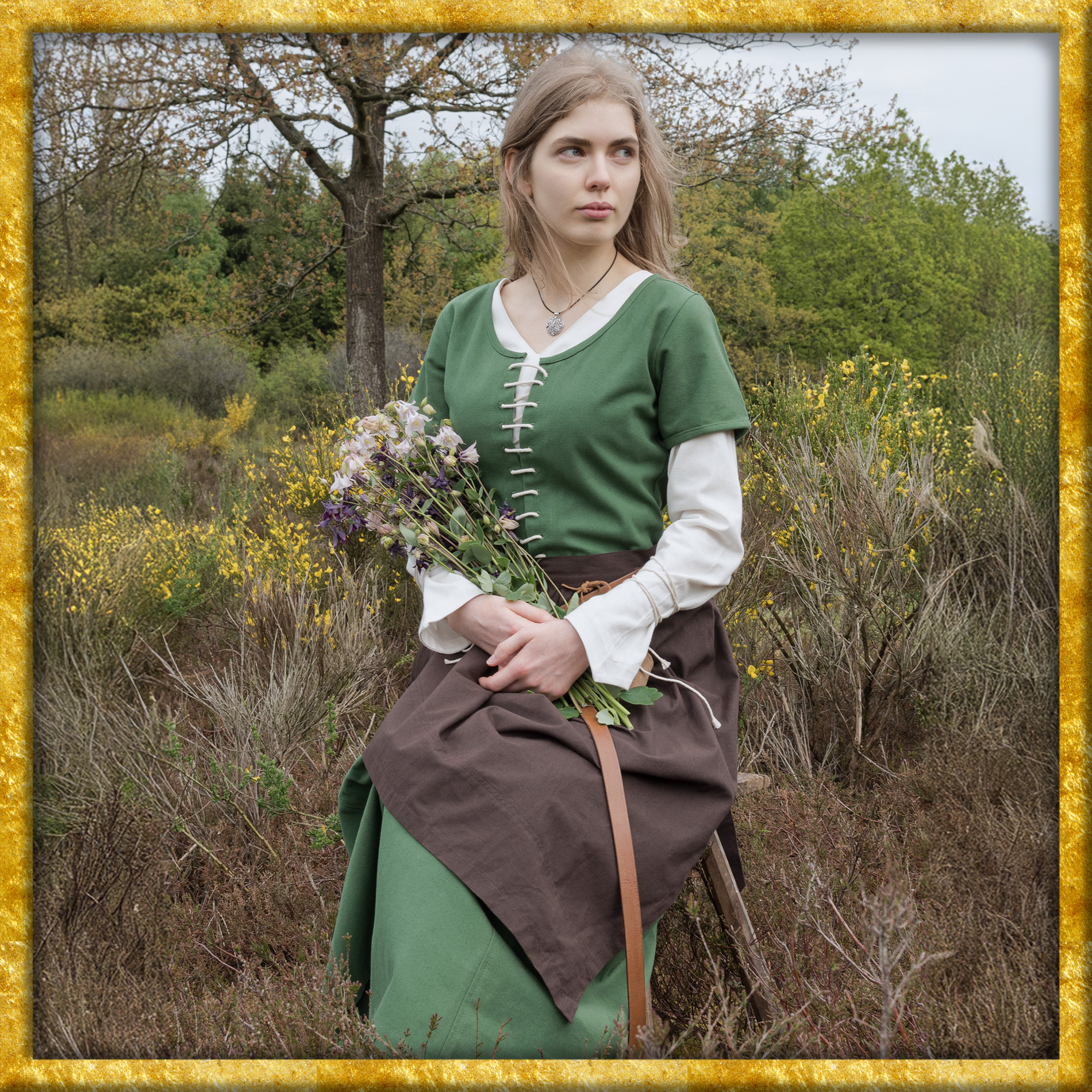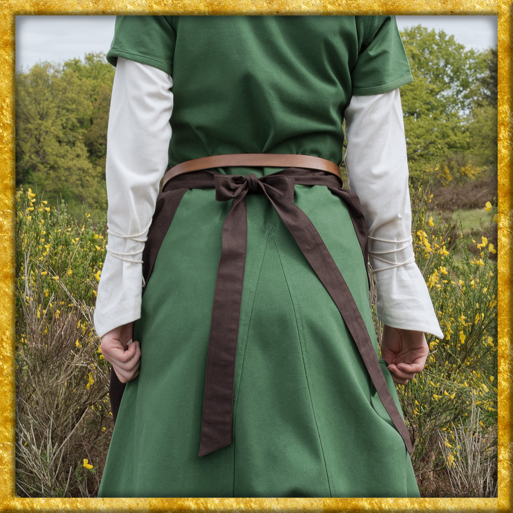 Diese braune Mittelalter Schürze ist im oberen Bereich gerafft. Die Schürze kann mittels 220cm langem Band einfach gebunden werden. Sie ist ideal zur Darstellung vieler Charaktere des Mittelalters an Märkten und LARP's.