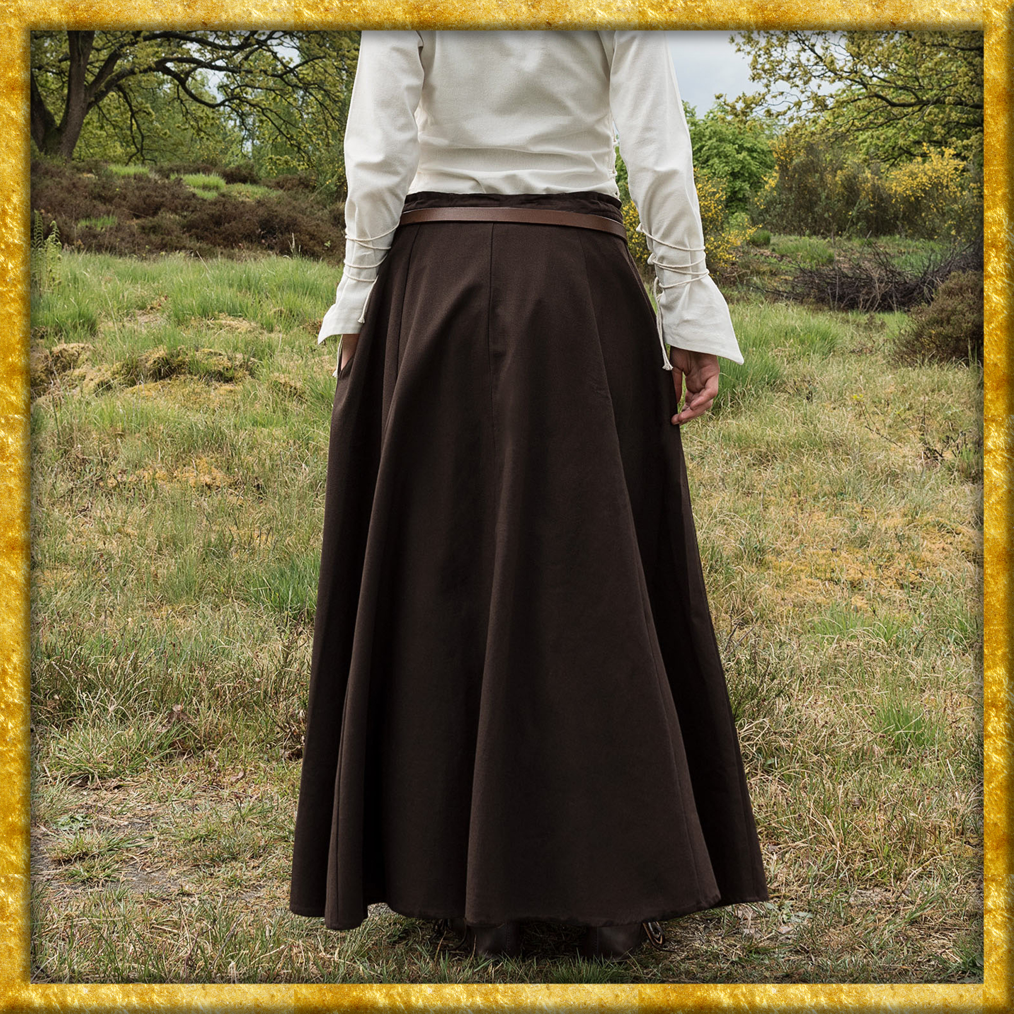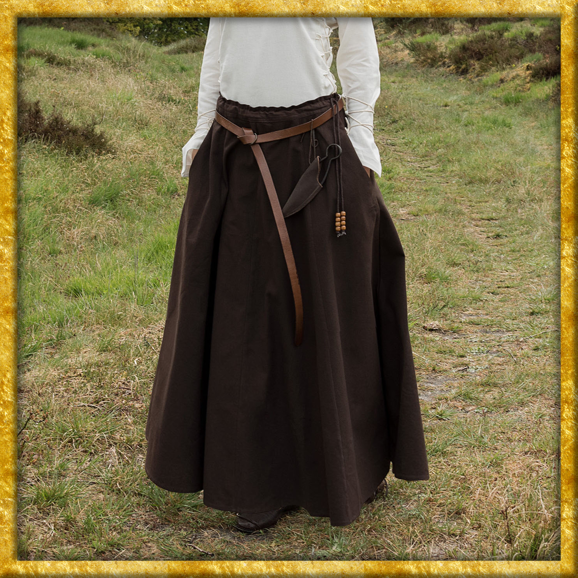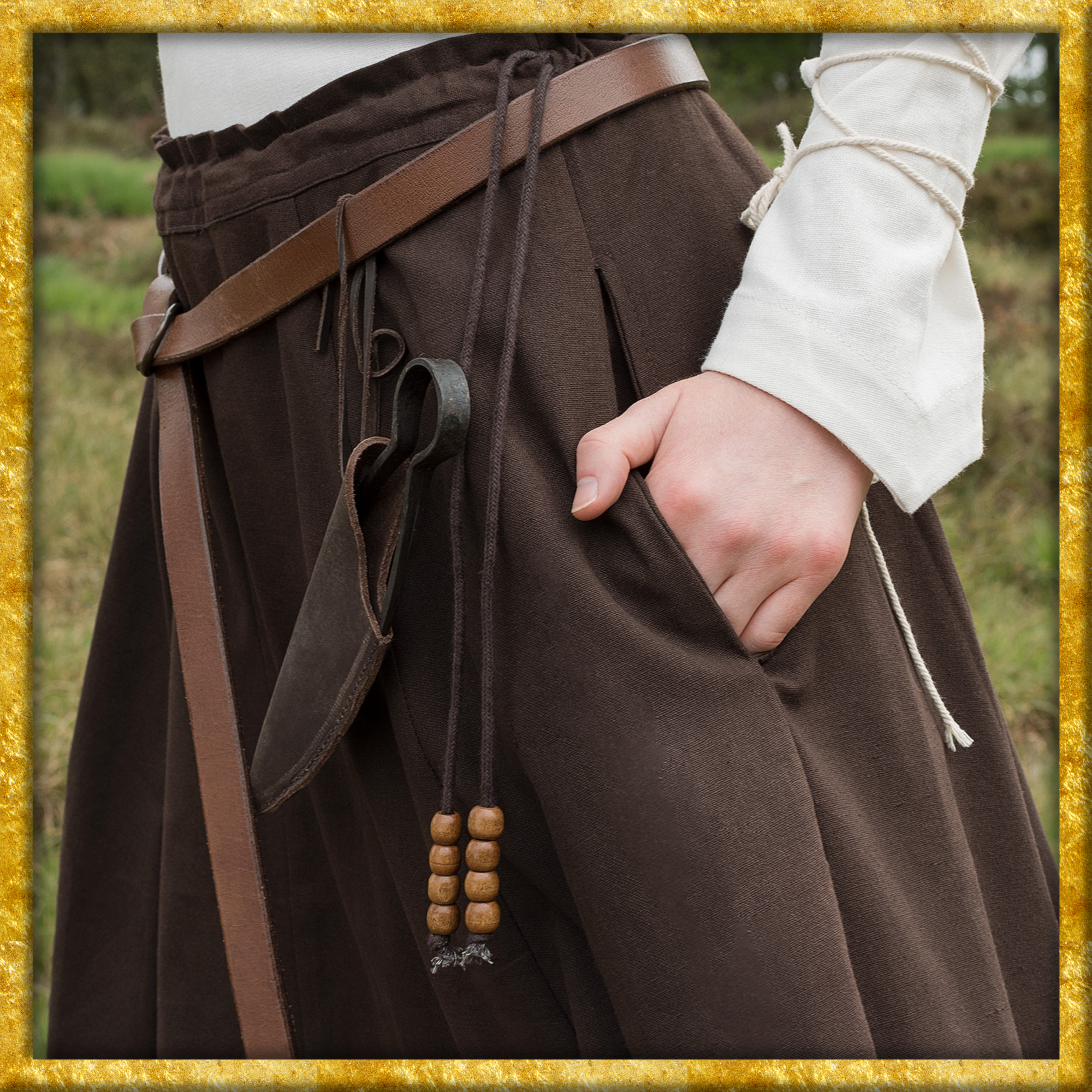 Wunderschöner Mittelalter-Rock aus dunkelbrauner Baumwolle. Der Rock besitzt einen Taillenbund mit eingezogenem Kordelzug. Beide Enden der Kordel sind mit dekorativen Holzperlen versehen. Der Bund sitzt bequem über der Hüfte. Aufgrund seiner weiten Schnittform und grosszügigen Länge fällt dieser Rock sehr elegant. Die zwei nach innen genähten Taschen sind praktisch und unterstreichen die schöne Passform dieses mittelalterlichen Rockes.