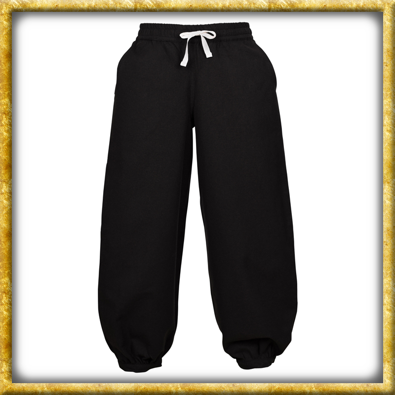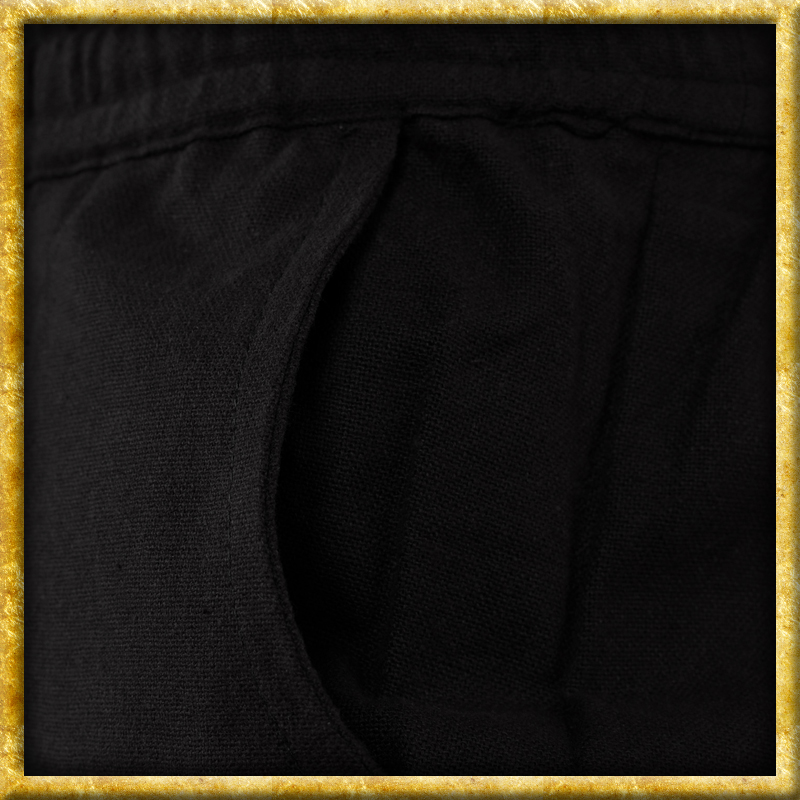 Diese locker sitzende Mittelalter Hose in Schwarz für Kinder ist ein echter Allrounder. Durch angesetzte Bündchen am Saum erhält sie ihre voluminöse Passform. Der Bund dieser Hose ist mit einem Gummiband versehen und zusätzlich noch mit einem Band regulierbar, so ist ein optimaler Sitz garantiert. Seitlich sind Eingriffstaschen eingearbeitet. Die Hose ist aus Baumwollstoff gefertigt.