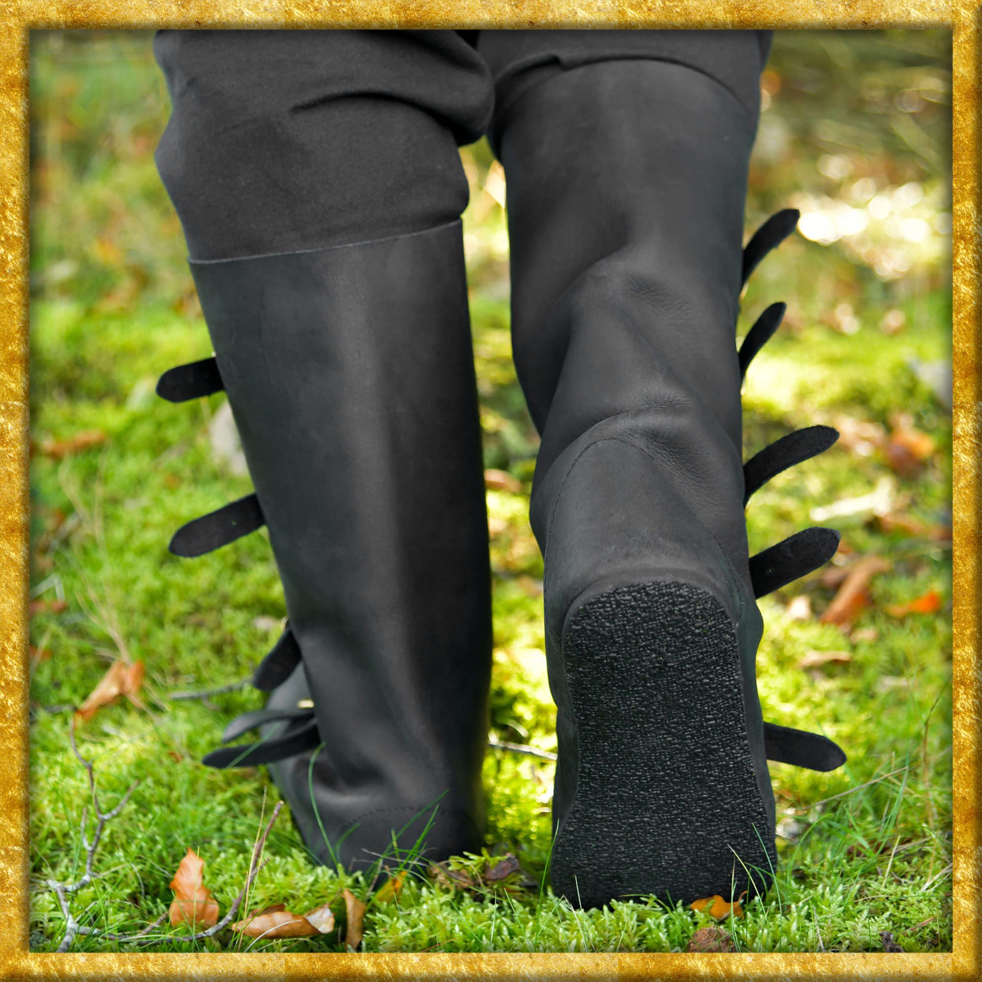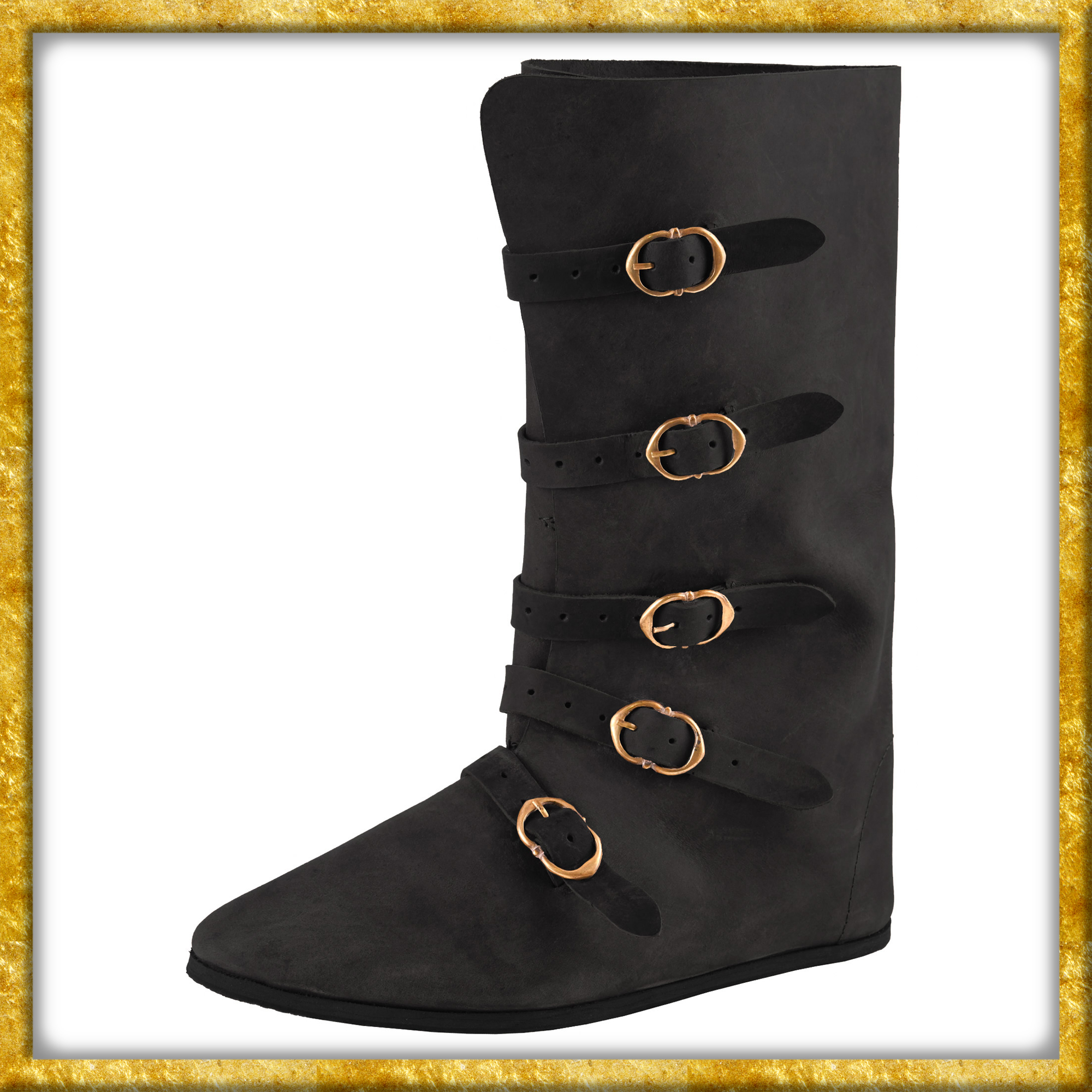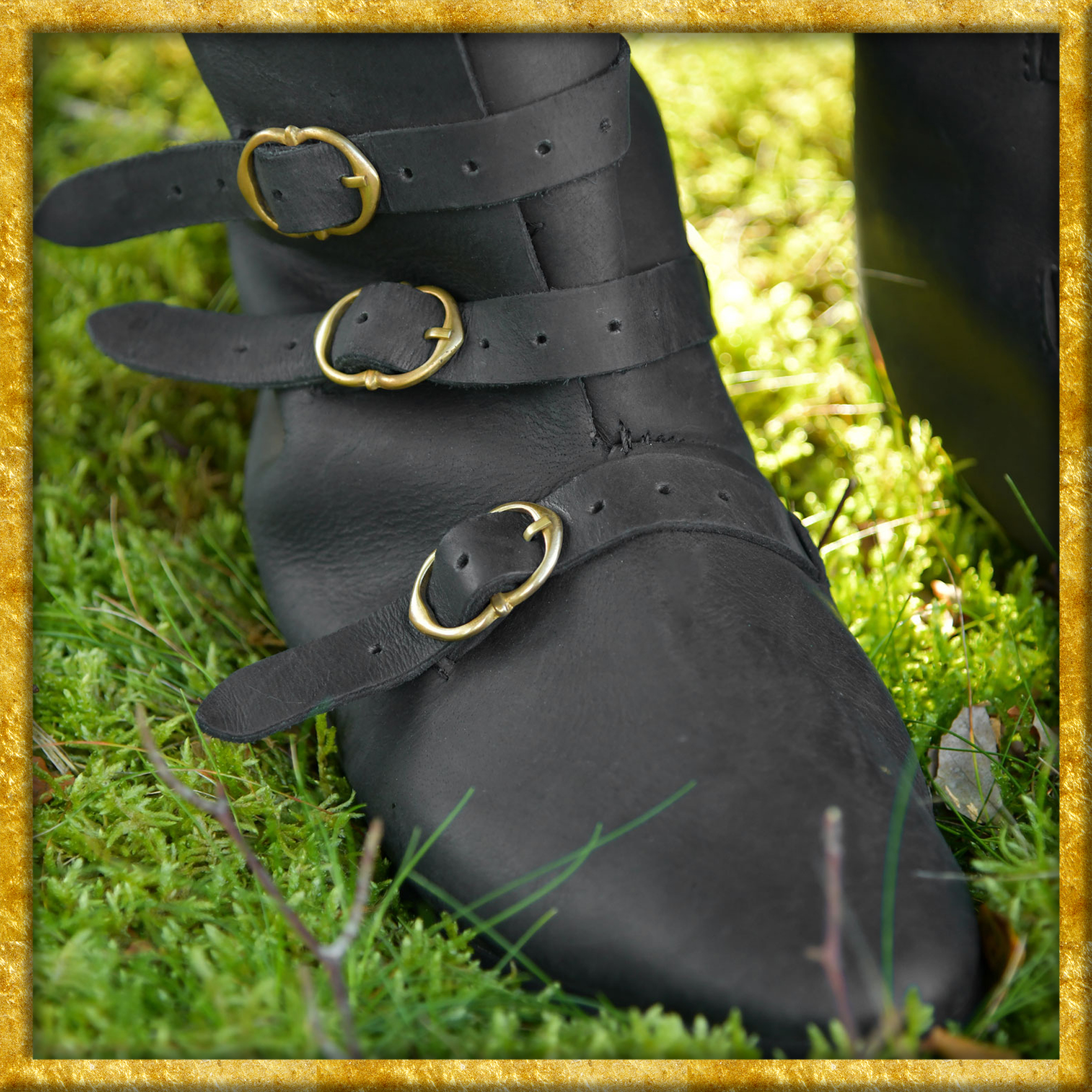 Dieser spätmittelalterliche Stiefel aus wunderschönem Rauleder ist am Vorderfuss geschlossen und wird am Schaft mit fünf Messingschnallen geschlossen. Bei der Sohle haben wir uns für einen sicheren Tritt und Langlebigkeit entschieden und somit eine 7mm dicke Gummisohle gewählt. Gummisohlen sind die beste Entscheidung, wenn ihr euch auf Asphalt, Beton oder Schotter bewegt.