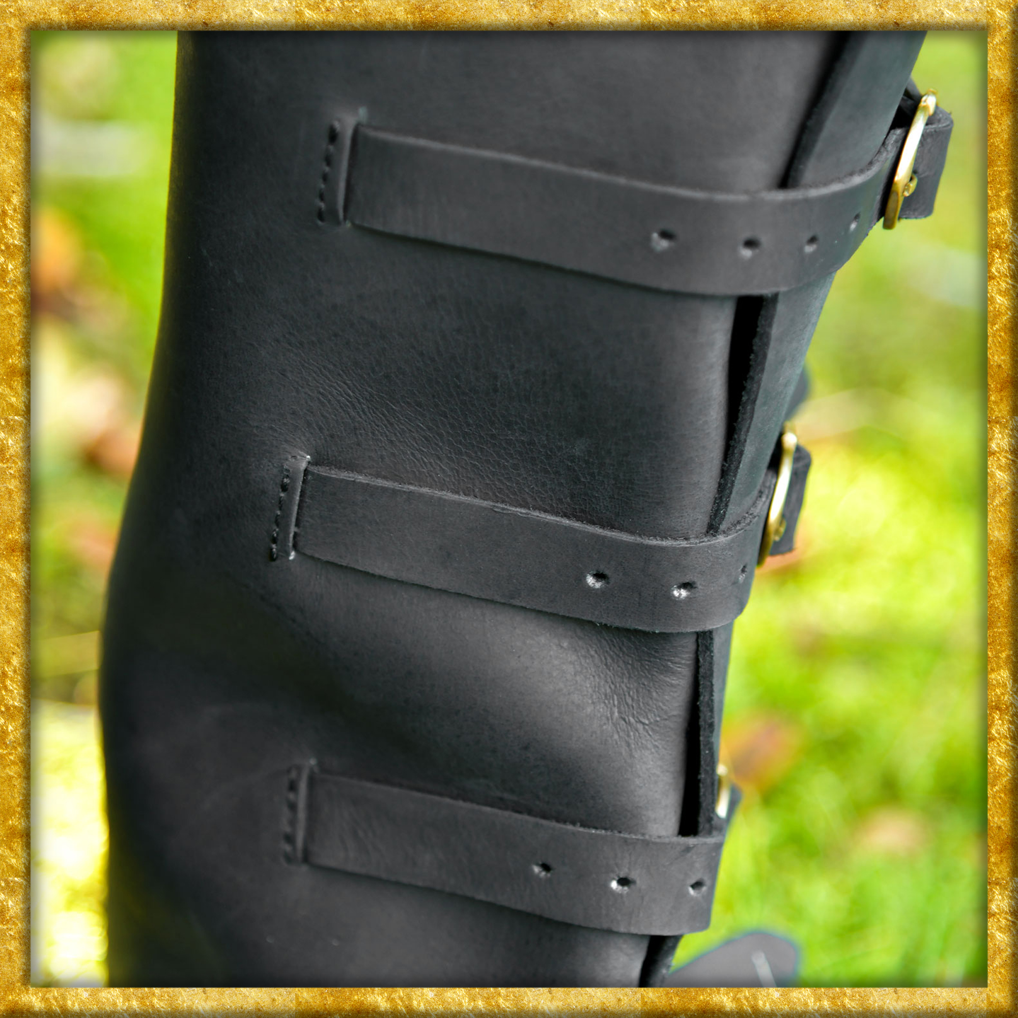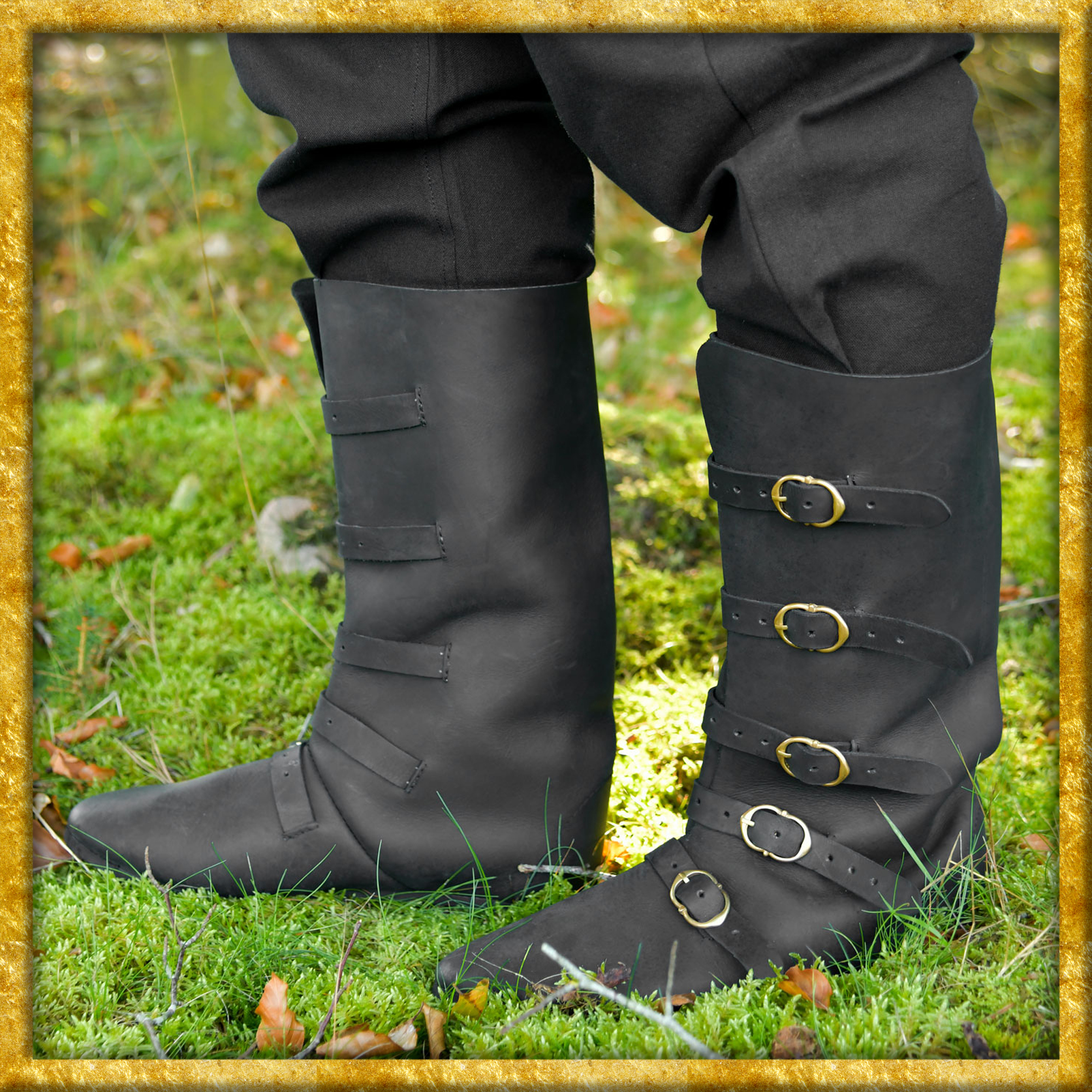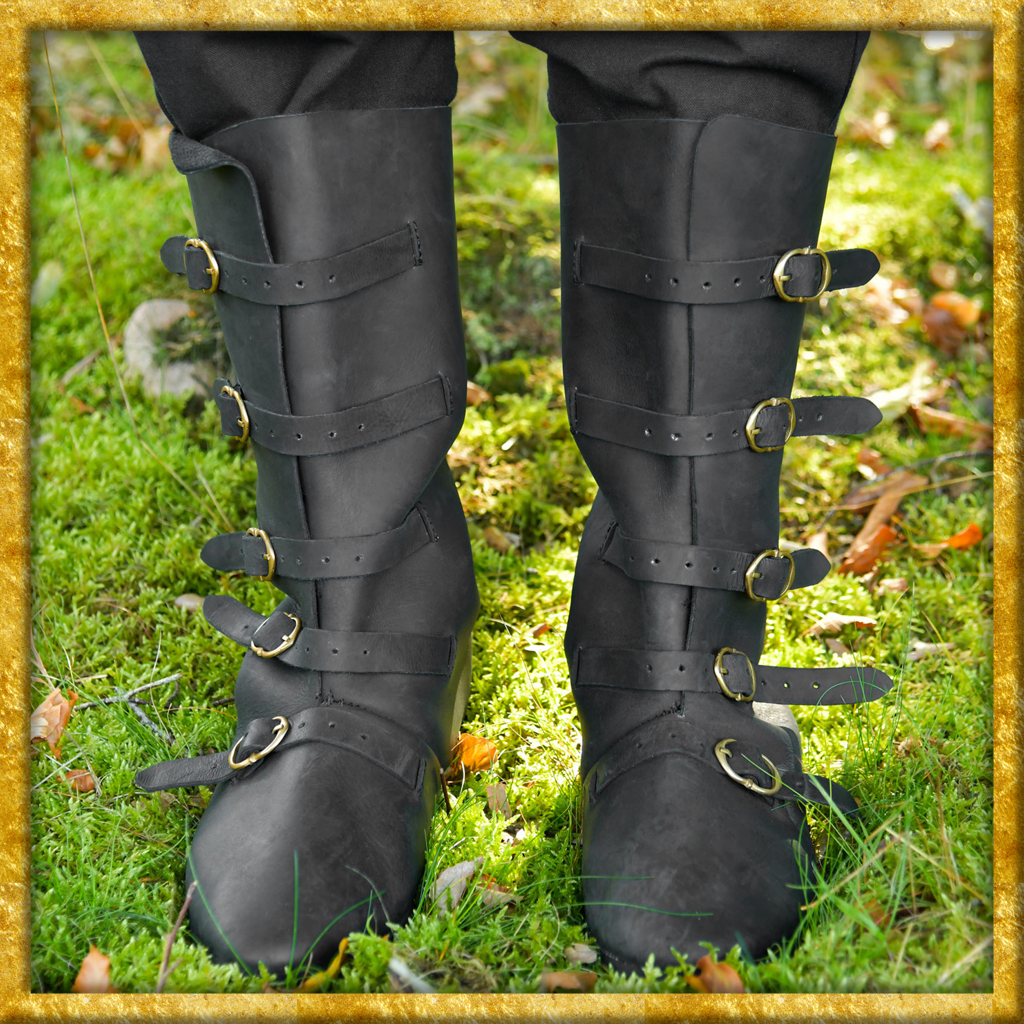 Dieser spätmittelalterliche Stiefel aus wunderschönem Rauleder ist am Vorderfuss geschlossen und wird am Schaft mit fünf Messingschnallen geschlossen. Bei der Sohle haben wir uns für einen sicheren Tritt und Langlebigkeit entschieden und somit eine 7mm dicke Gummisohle gewählt. Gummisohlen sind die beste Entscheidung, wenn ihr euch auf Asphalt, Beton oder Schotter bewegt.