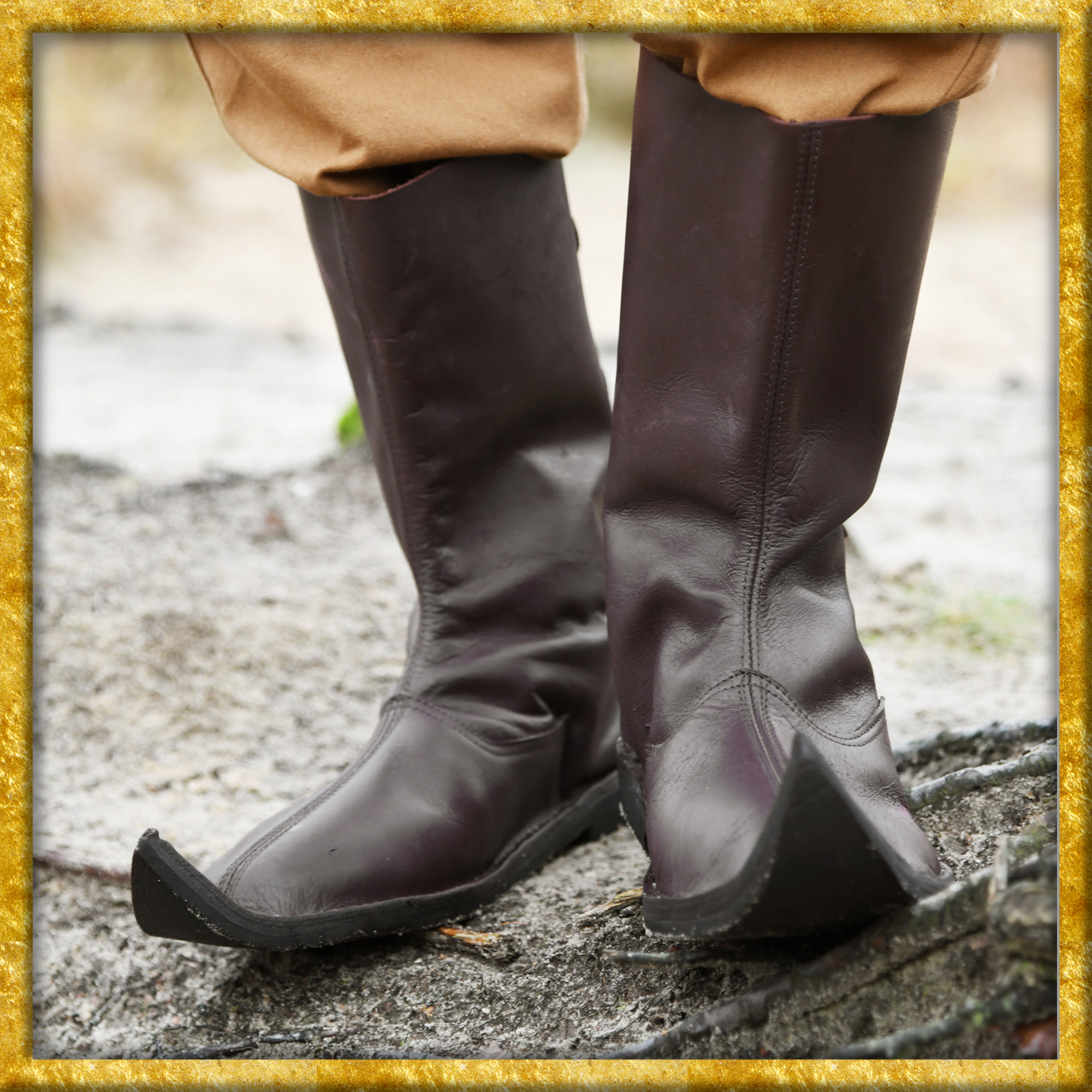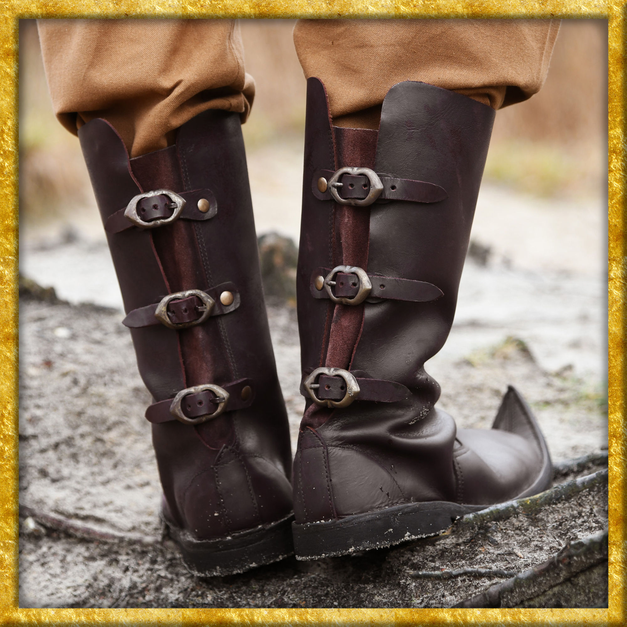 Diese spätmittelalterlichen Schnabelstiefel aus dunkelbraunem Rindsleder verfügen über 3 Schnallen und angenietete Riemen zum individuellen Anpassen und Schliessen. Anders als Ihre mittelalterlichen Vorbilder haben diese Mittelalterstiefel eine Sohle aus anthrazitfarbenem Hartgummi.