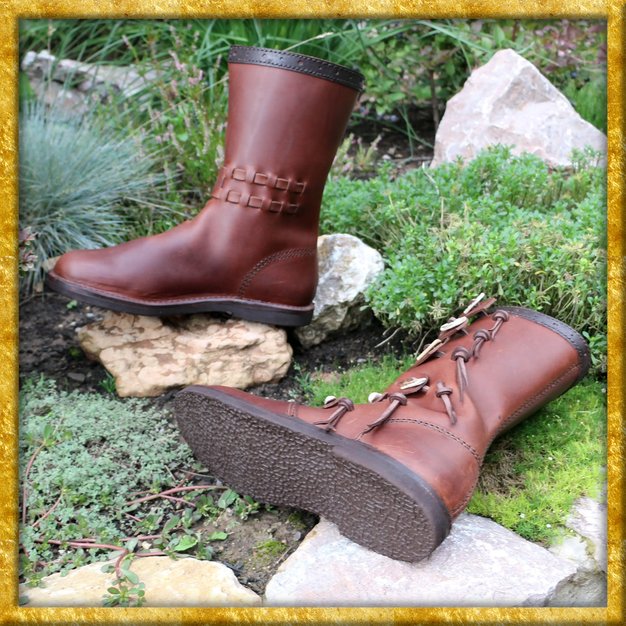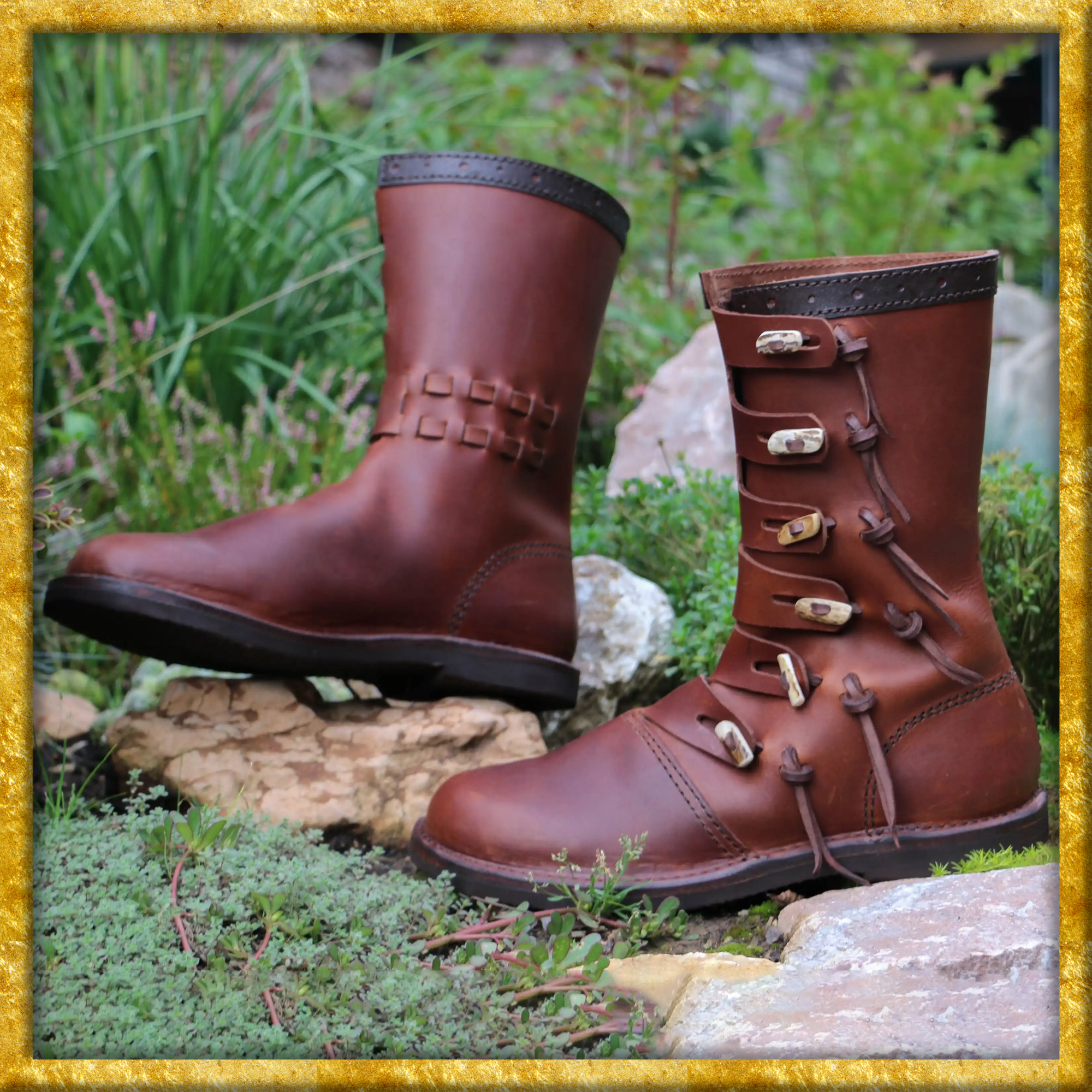 Diese authentischen und robusten Wikingerstiefel sind mit Knöpfen aus Horn und Lederriemen verziert. Diese Stiefel wurden in handarbeit in höchster Qualität gefertigt und genügen auch höchsten Ansprüchen wie z.B. Reenactment. Die Stiefel sind aus echtem Rindsleder gefertigt und wurdne mit Balsam aus Bienenwachs behandelt. Durch die Lederschnürung lässt sich die Weite noch etwas anpassen. Ist der Stiefelschaft oder Spann zu locker oder zu eng? Wenn ja, lösen Sie die Knoten an den das Riemen der Knöpfe und passen Sie die Länge der Riemen entsprechend an.