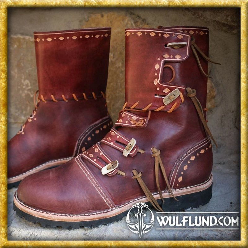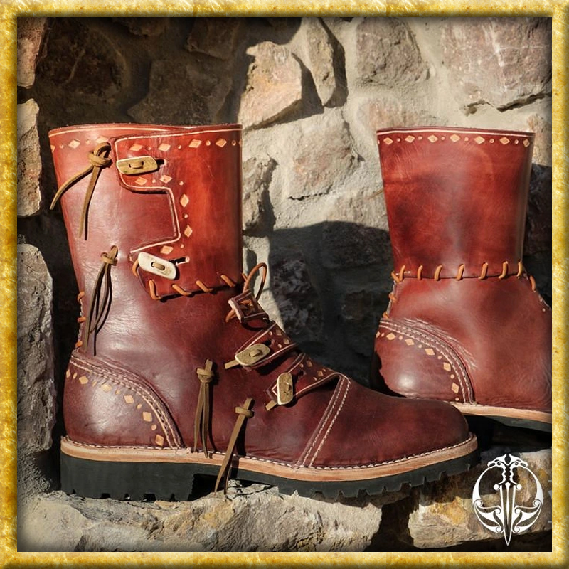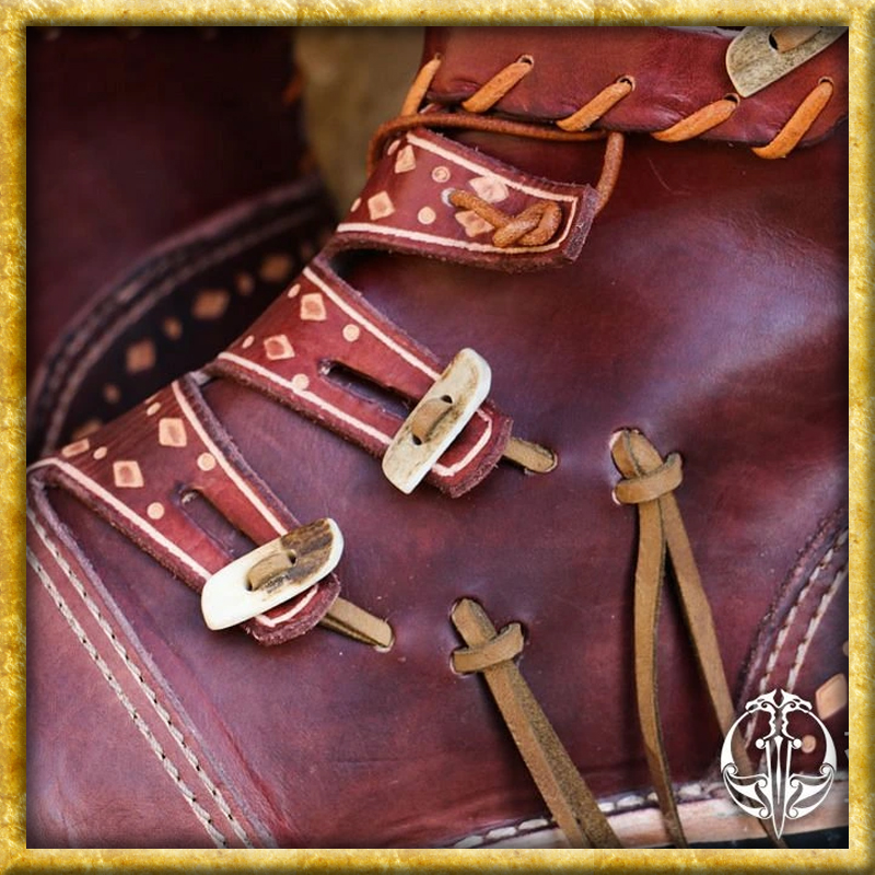 Hochwertige und in Handarbeit hergestellte Wikingerstiefel mit authentischem Schnürsystem, wie es die nordischen Krieger einsetzten. Die Laschen sind bequem zu Schliessen und verfügen über Knochenknöpfe aus Hirschgeweih. Die Wikingerstiefel sind sehr hochwertig verarbeitet. Um modernen Strassen gerecht zu werden, wurde eine Gummisohle verwendet. Dies entspricht nicht historischen Vorlagen, dafür halten die Schuhe länger und bieten angenehmen Halt.