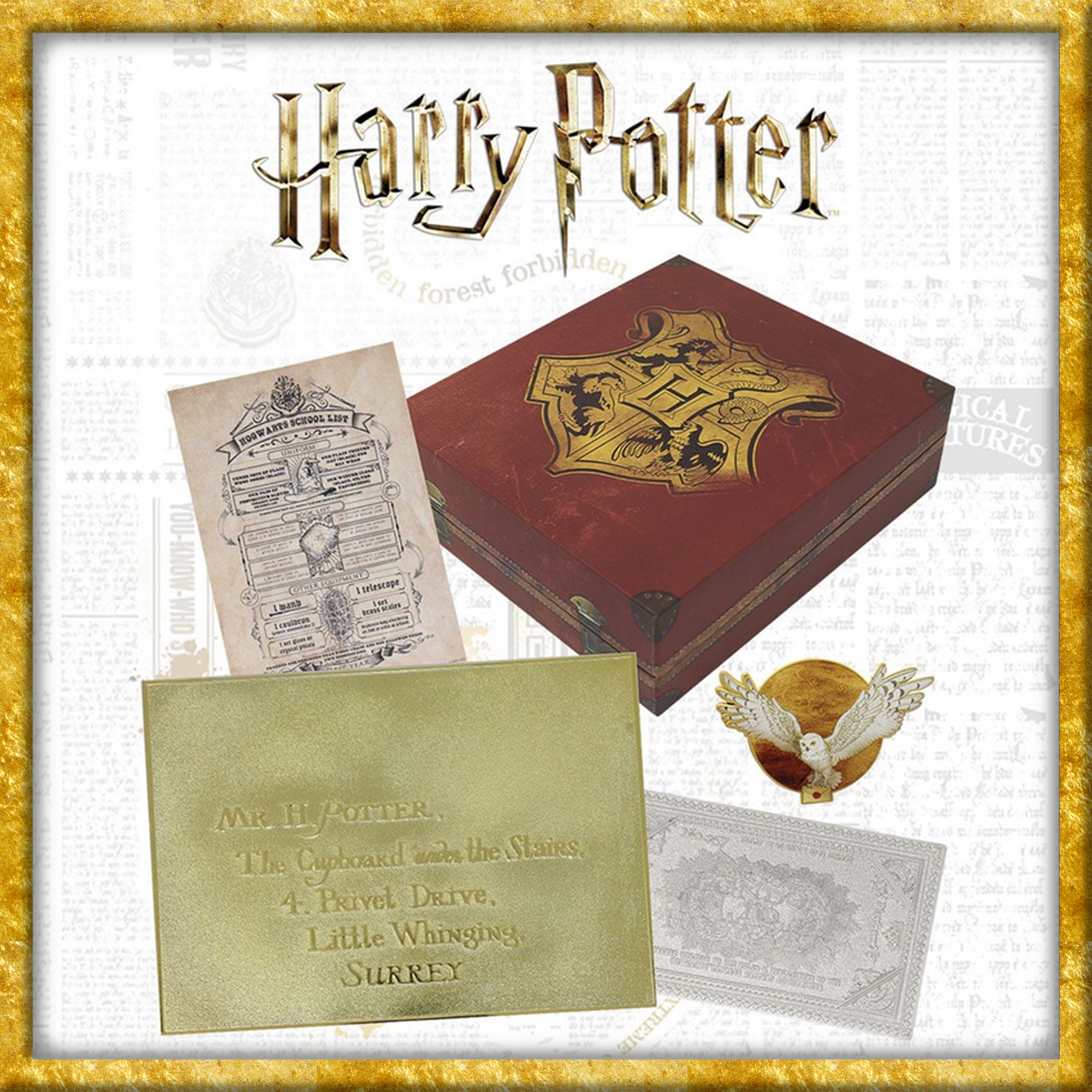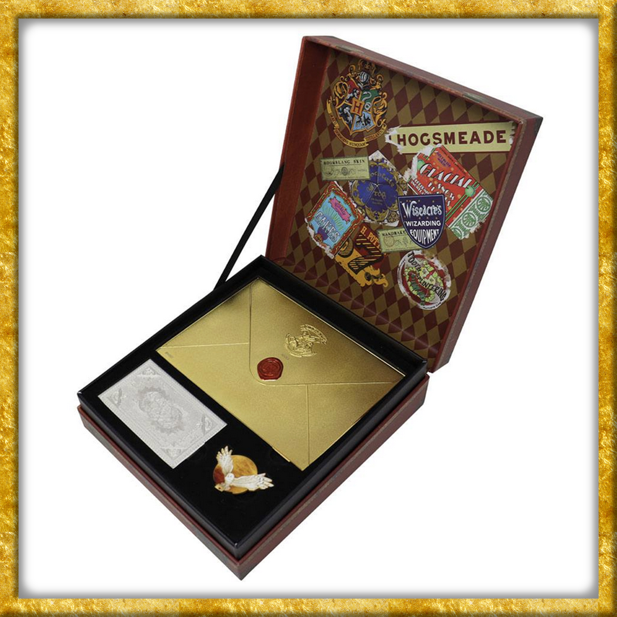 Diese offiziell lizenzierte und limitierte Harry Potter Geschenkbox enthält ein versilbertes aus Metal hergestelltes Hogwarts-Express Ticket, einen vergoldeten, ebenfalls aus Metal hergestellten Hogwarts Umschlag, eine Kunstkarte sowie einene vergoldeten Hedwig Ansteck-Pin. Alle diese magischen Artikel werden in einem individuell nummerierten Reisekoffer geliefert. Ein Must-have für jeden Harry Potter-Fan.