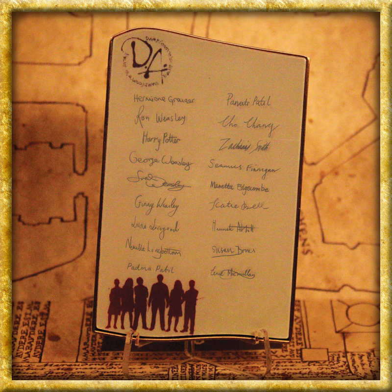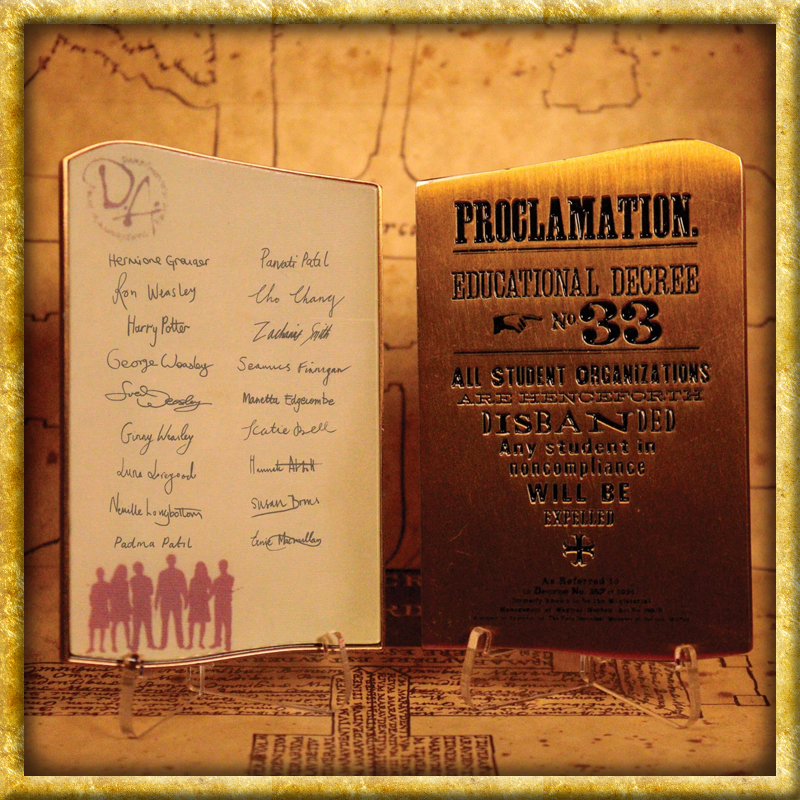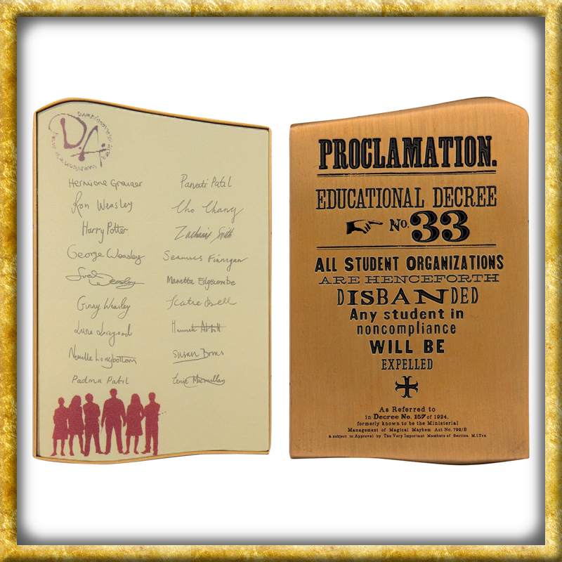 Aus Harry Potter und der Orden des Phönix erscheint dieses offiziell lizenzierte Sammlerstück aus Metall in Form eines doppelseitig gestalteten Barren. Da es sich bei Dumbledores Armee um eine so geheimnisvolle Gruppe handelt, weist die Vorderseite dieses Barrens ein spezielles Linsenraster auf, so dass die Unterschriften nur aus einem bestimmten Blickwinkel zu sehen sind. Jeder Barren, der weltweit auf 2007 limitiert ist, ist einzeln nummeriert und wird mit einem Ständer geliefert. Schliesst Euch dieser Untergrund-Rebellengruppe an und lernt, Euch gegen die Dunklen Künste zu verteidigen. Gegründet, um die strengen Regeln von Dolores Umbridge zu bekämpfen, zeigt dieses Metall-Sammelstück den Pakt, den die Mitglieder von Dumbledores Armee unterzeichnet haben. Dies ist Eure Chance, Euch der streng geheimen DA anzuschliessen!
