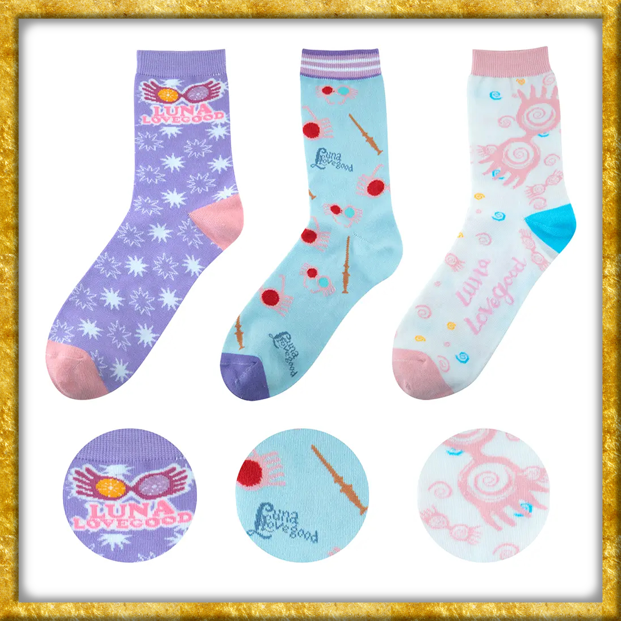Offiziell lizenzierte Harry Potter Socken in Pastellfarben welche Gegenstände und Schriftzug von Luna Lovegood darstellen. Das Set umfasst insgesamt 3 Paar Socken in den Grössen 35-45.