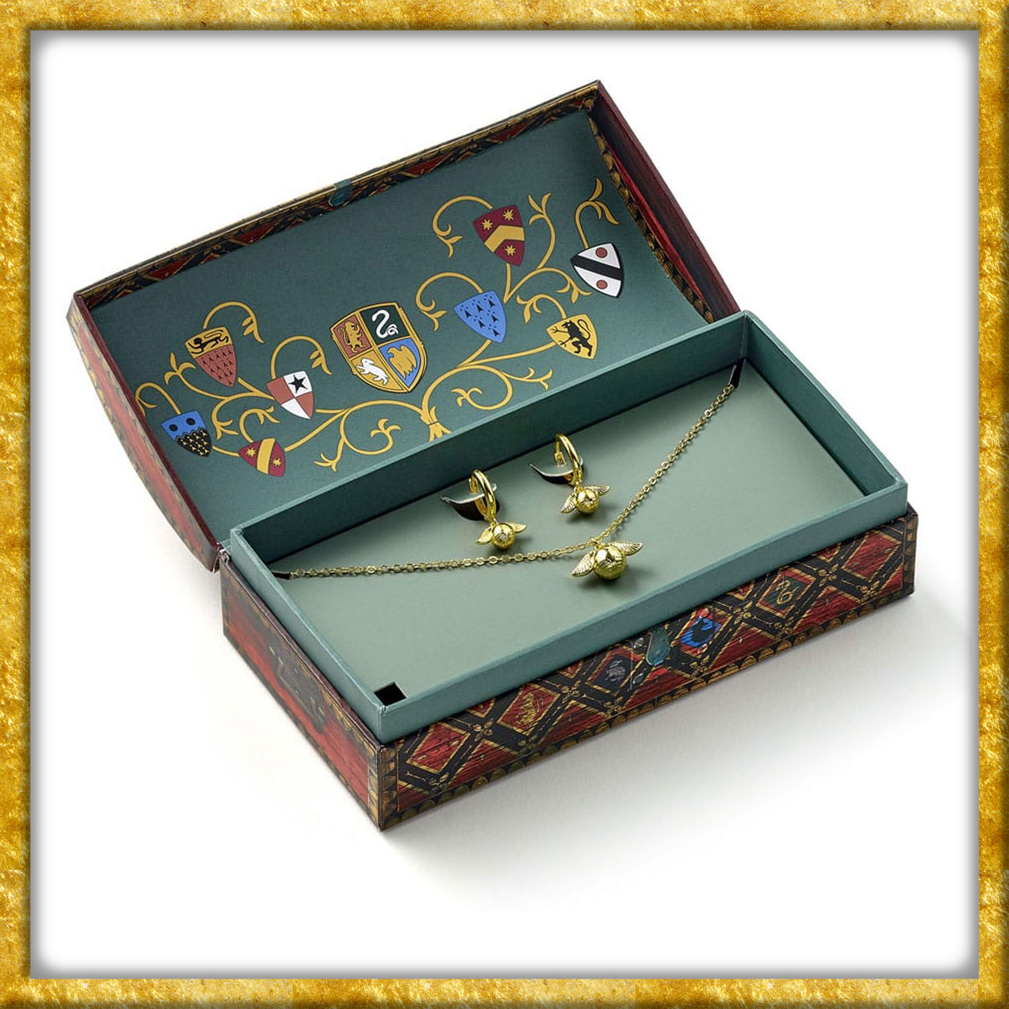Aus Harry Potter erscheint dieses originelle Geschenkset, ganz dem beliebten Sport Qudditch und damit dem bekannten goldenen Schnatz gewidmet. Das Schnatz-Set enthält eine 40cm lange hypoallergene Halskette mit einem Schnatz Anhänger ein Paar Ohringe, ebenfalls in Darstellung des Schnatzes. Das Set wird in einer bedruckten Box geliefert.
