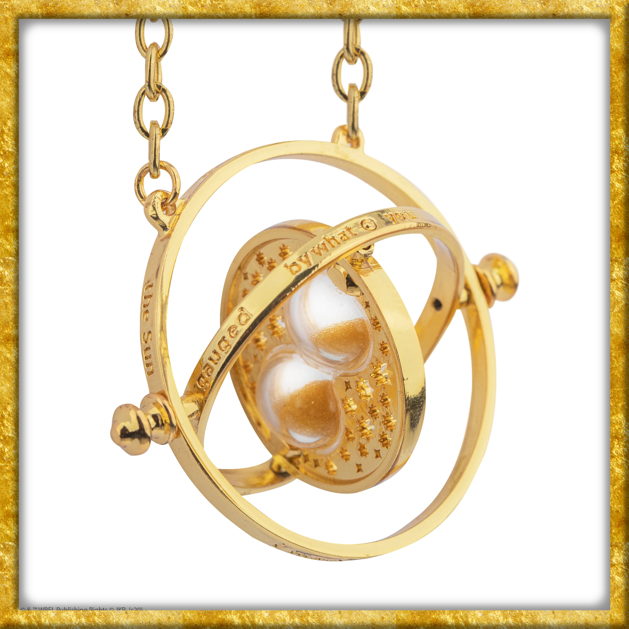 Im Inneren der filigranen Miniatur-Sanduhr rieselt goldener Sand und verleiht dem Anhänger seine geheimnisvolle Aura. Die drehbaren Ringe laden dazu ein, die eingravierte Inschrift zu entdecken und machen den Zeitumkehrer zu einem faszinierenden Schmuckstück mit Tiefe und Bedeutung. Ob getragen als Halskette oder stilvoll aufbewahrt, dieses Artefakt zieht die Blicke magisch an.