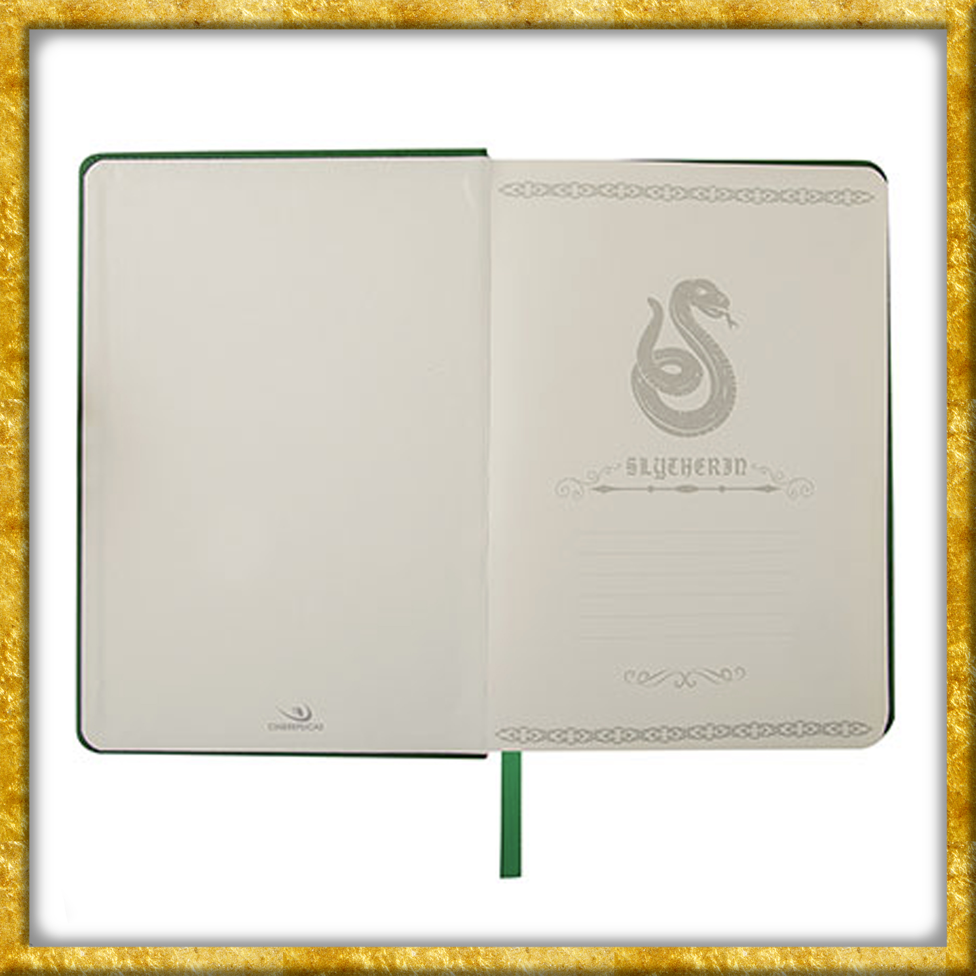 Offiziell lizenziertes Harry Potter Notizbuch in Grün auf welchem das Wappen des Hauses Slytherin abgebildet ist. Das schöne Notizbuch ist 27cm lang und 21.6cm breit. Dazu wird ein passender Stift, auf welchem ebenfalls das Wappen Slyterhin ziert, mitgeliefert.