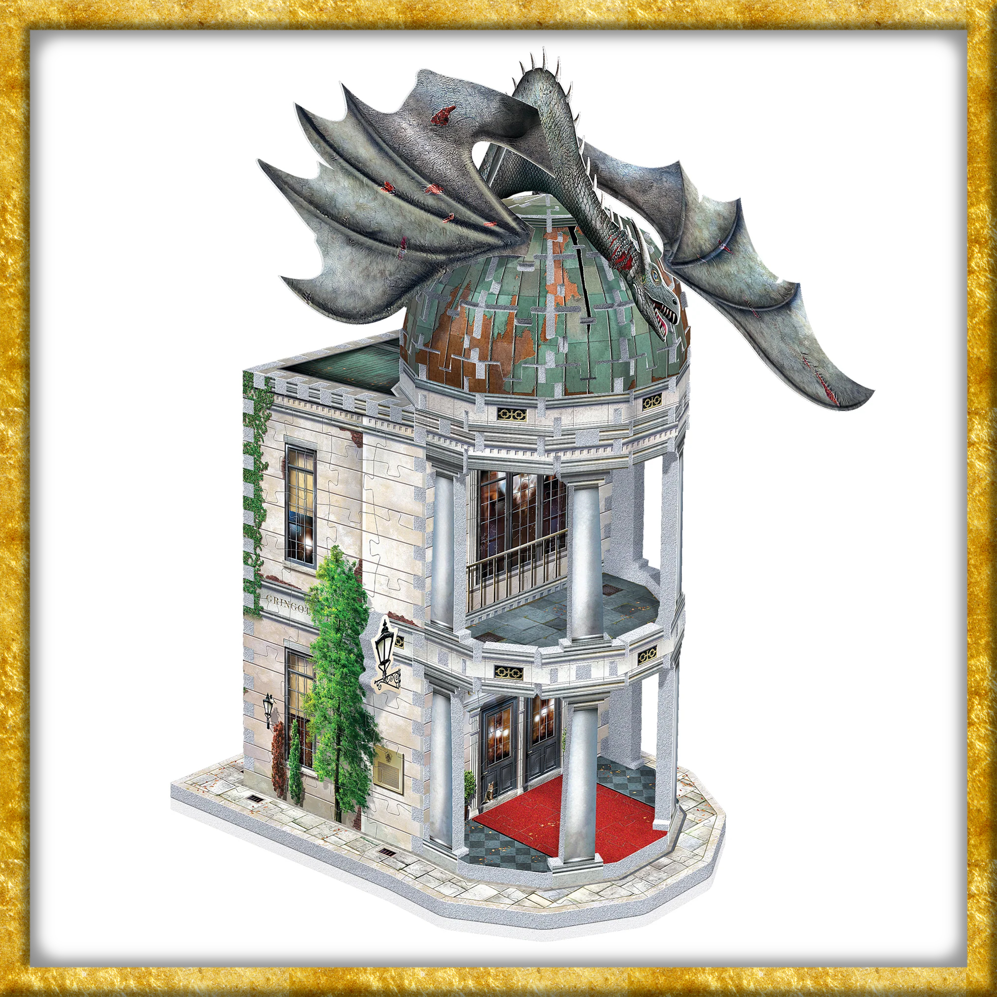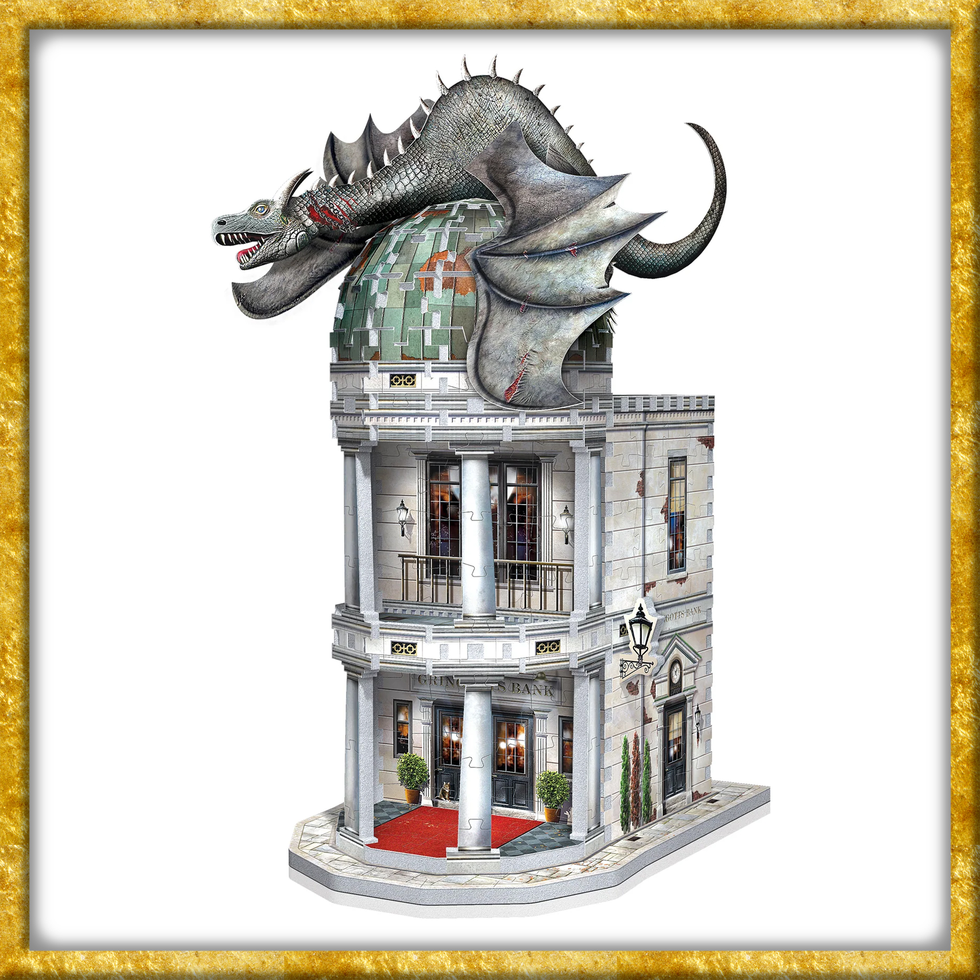 Majestätisch über der Winkelgasse thronend, ist die Gringotts Zaubererbank der sicherste Ort der magischen Welt. Tief im Inneren dieses schneeweissen, mehrstöckigen Bauwerks bewahren Kobolde Gold, Artefakte und Geheimnisse in ihren Gewölben auf. Gekrönt wird das imposante Gebäude von einem furchteinflössenden Ukrainischen Eisenbauch-Drachen, der Gringotts zu einem unverkennbaren Wahrzeichen macht.