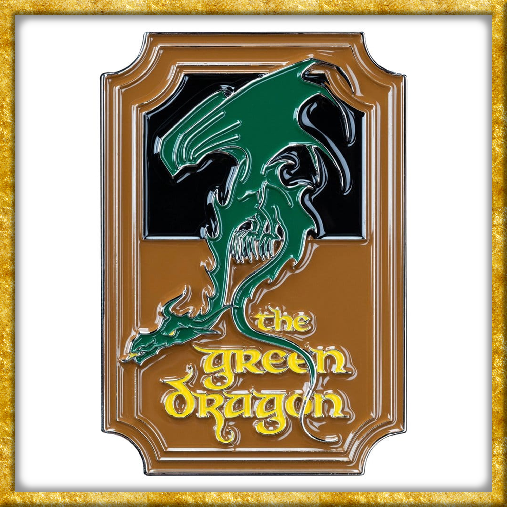 Dieser offiziell lizenzierte Magnet aus der Herr der Ringe, welcher in Form des Schildes der Taverne des grünen Drachen dargestellt wird, wurde aus Emaille hergestellt. Mit seiner Grösse von 4,5cm x 6,5cm x 0,4cm ist es ein Schmuckstück für jede Magnetwand.