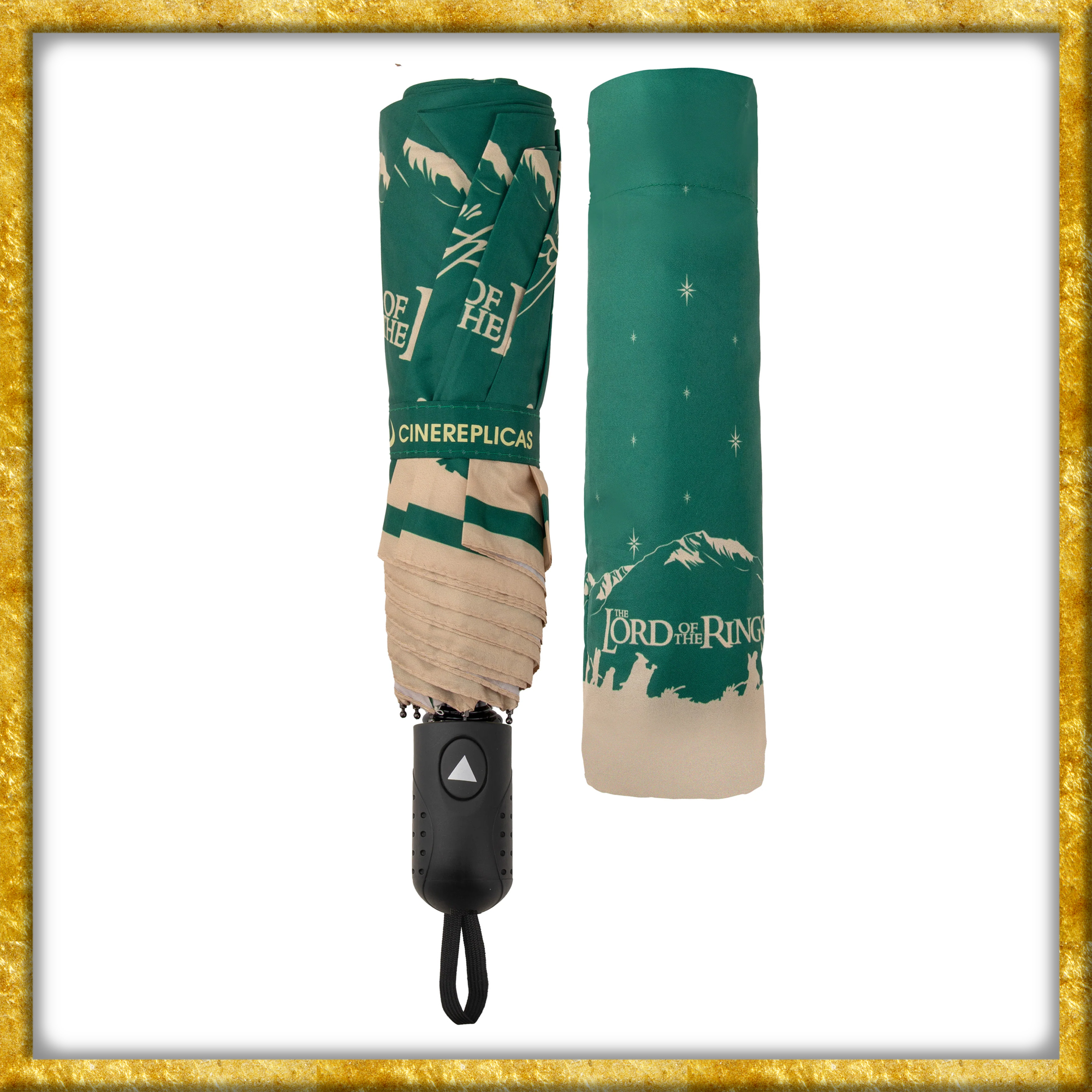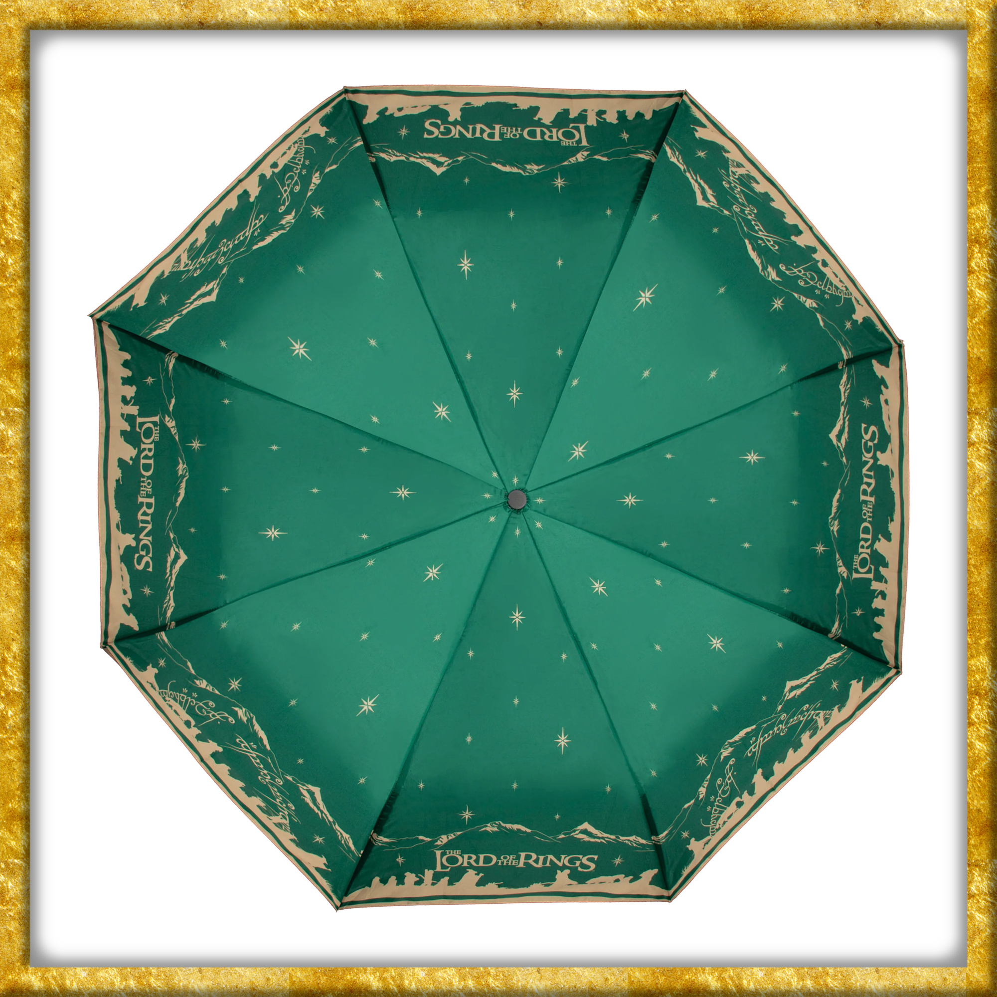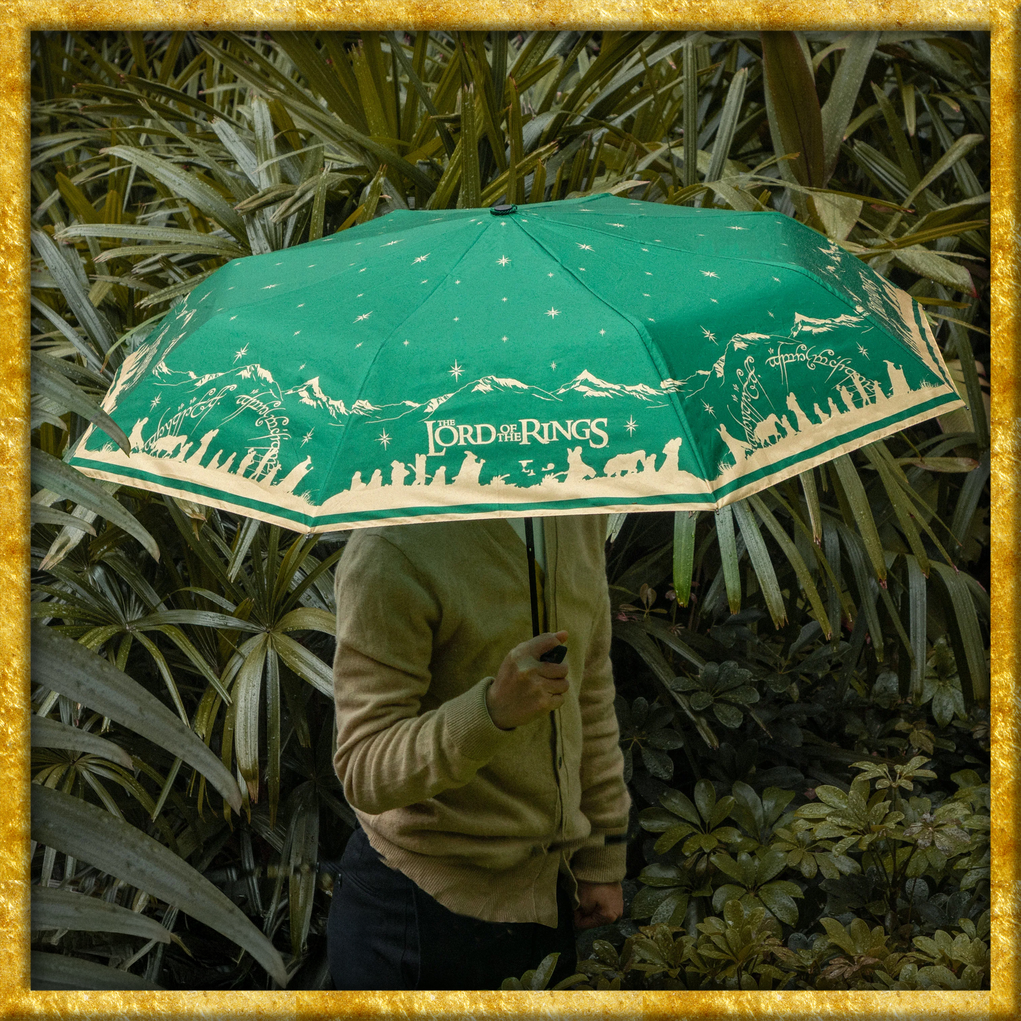 Mit diesem Gefährten des Rings Regenschirm begleitest du die Gefährten selbst an grauen Tagen auf ihrem Weg durch Mittelerde. Das eindrucksvolle Motiv zeigt die leuchtende Silhouette der Gemeinschaft auf ihrer legendären Reise und macht jeden Spaziergang im Regen oder in der Sonne zu einer stilvollen Hommage an Der Herr der Ringe.