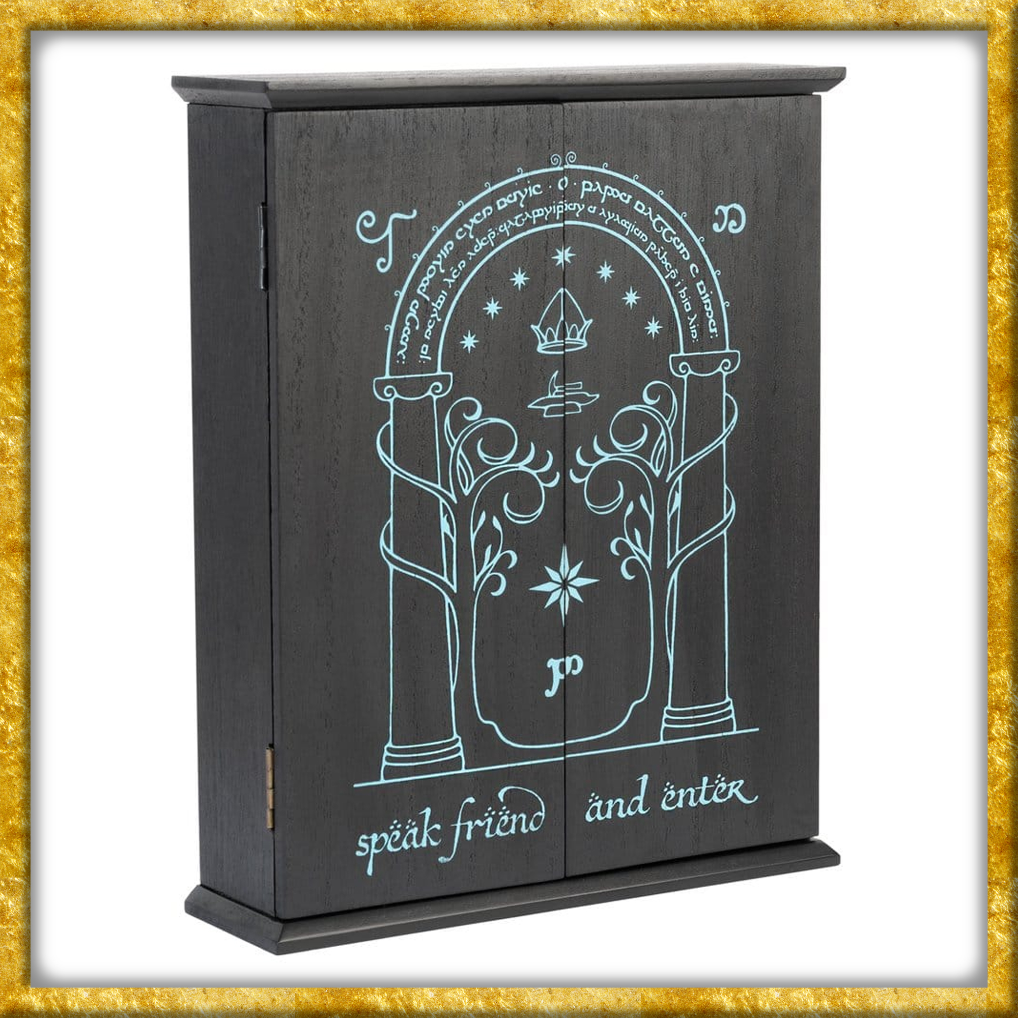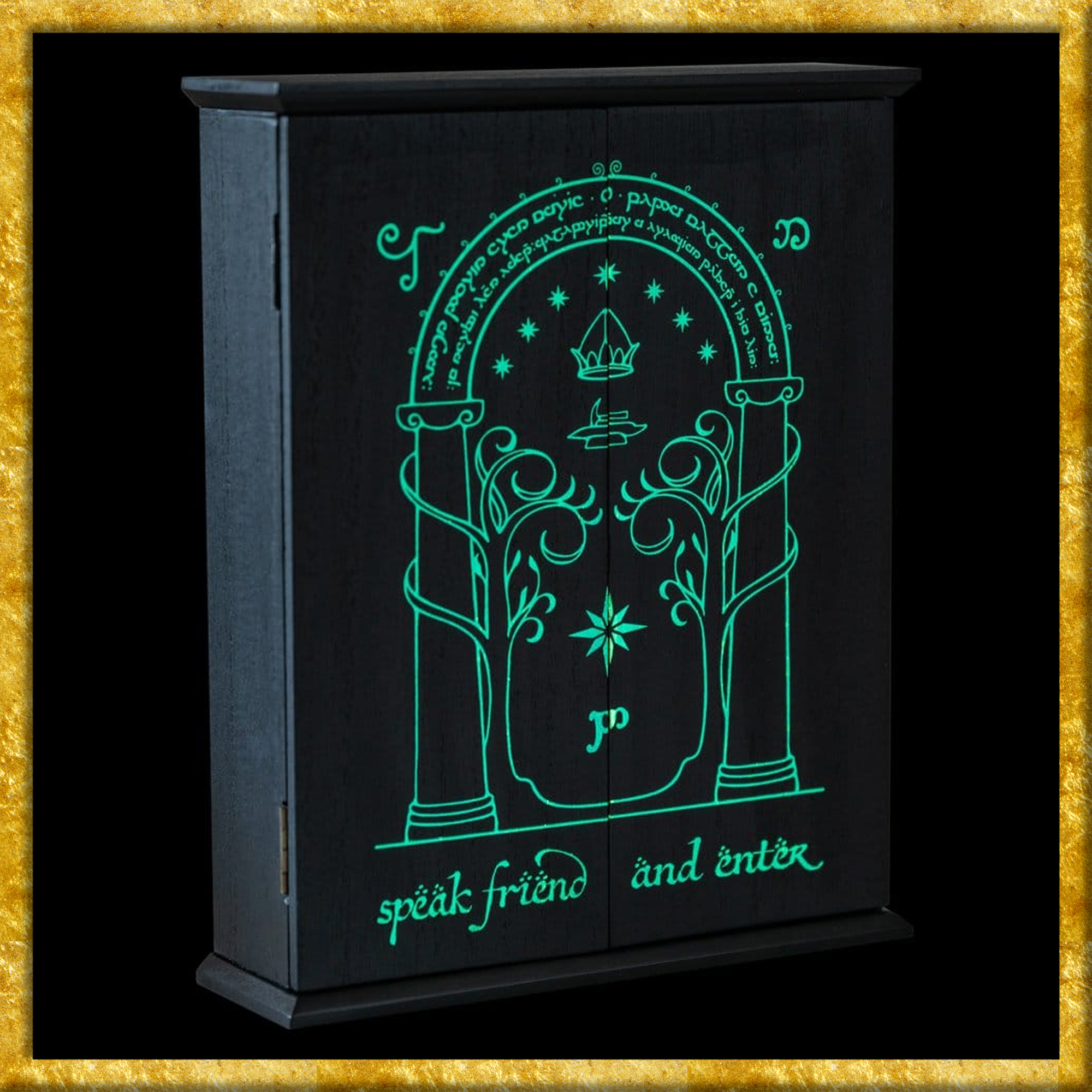 Dieser wundervolle Herr der Ringe Schlüsselhalter aus Holz zeigt die bekannten Türen von Durin. 6 Haken bieten Platz für Schlüssel, Ringe und vieles mehr. Die Vorderseite verfügt über ein mit Leuchtfarbe gedruckets Design, welches es im Dunkeln leuchten lässt, nachdem es natürliches oder Ultraviolettes Licht absorbiert hat. Eine tolle Dekoration für jeden Herr der Ringe Fan!