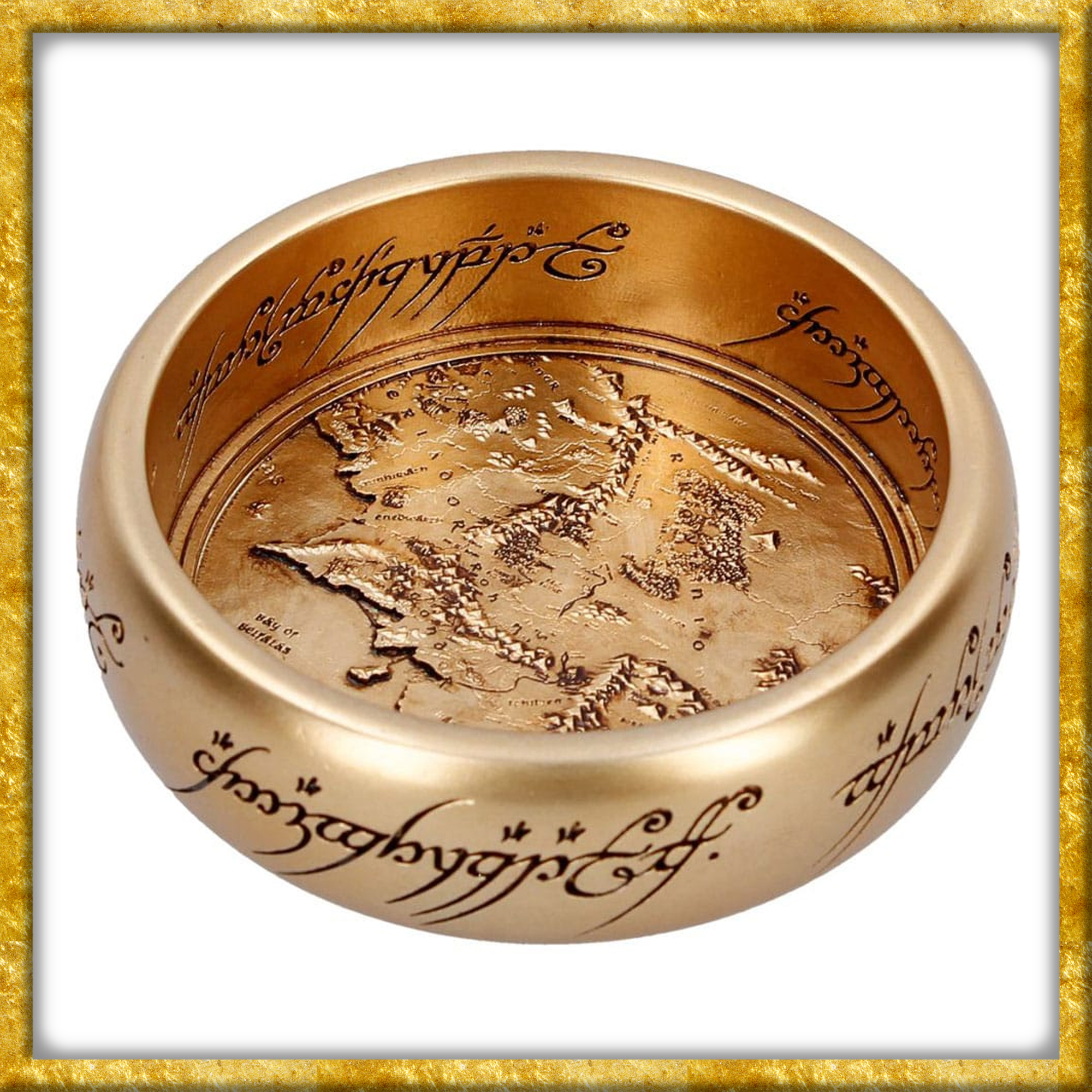 Aus dem Herr der Ringe Universum kommt dieser schicke Schmuckteller aus hochwertigem Resin. Der offiziell lizenzierte Schmuckteller hat einen Durchmesser von 11cm und ist ca. 3cm hoch. Der innere wie auch äussere Rand zeigt die Inschrift des Einen Ringes, der Gund des Tellers hingegen zeigt die Karte von Mittelerde. So lassen sich Schmuckstücke oder Hausschlüssel optimal verstauen.