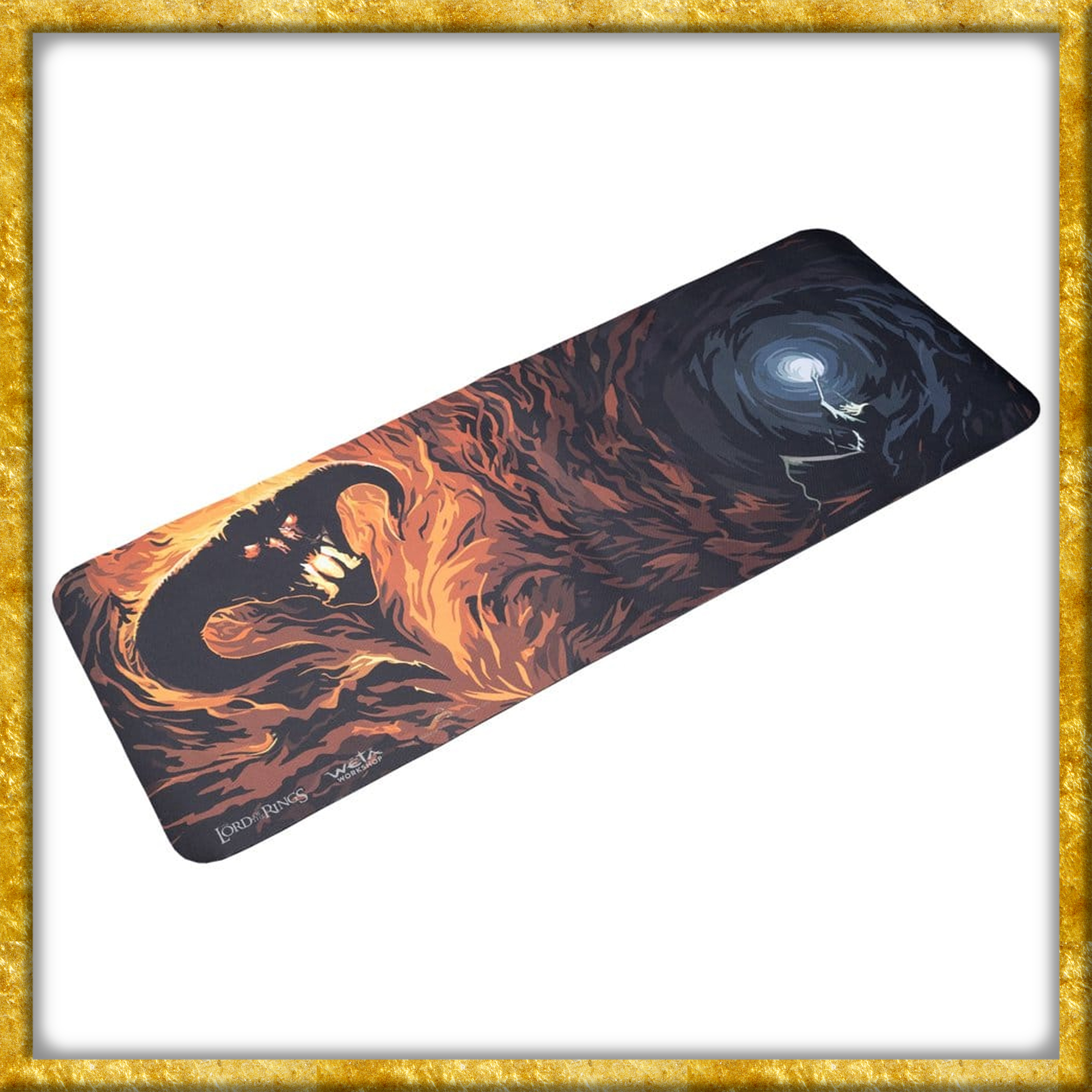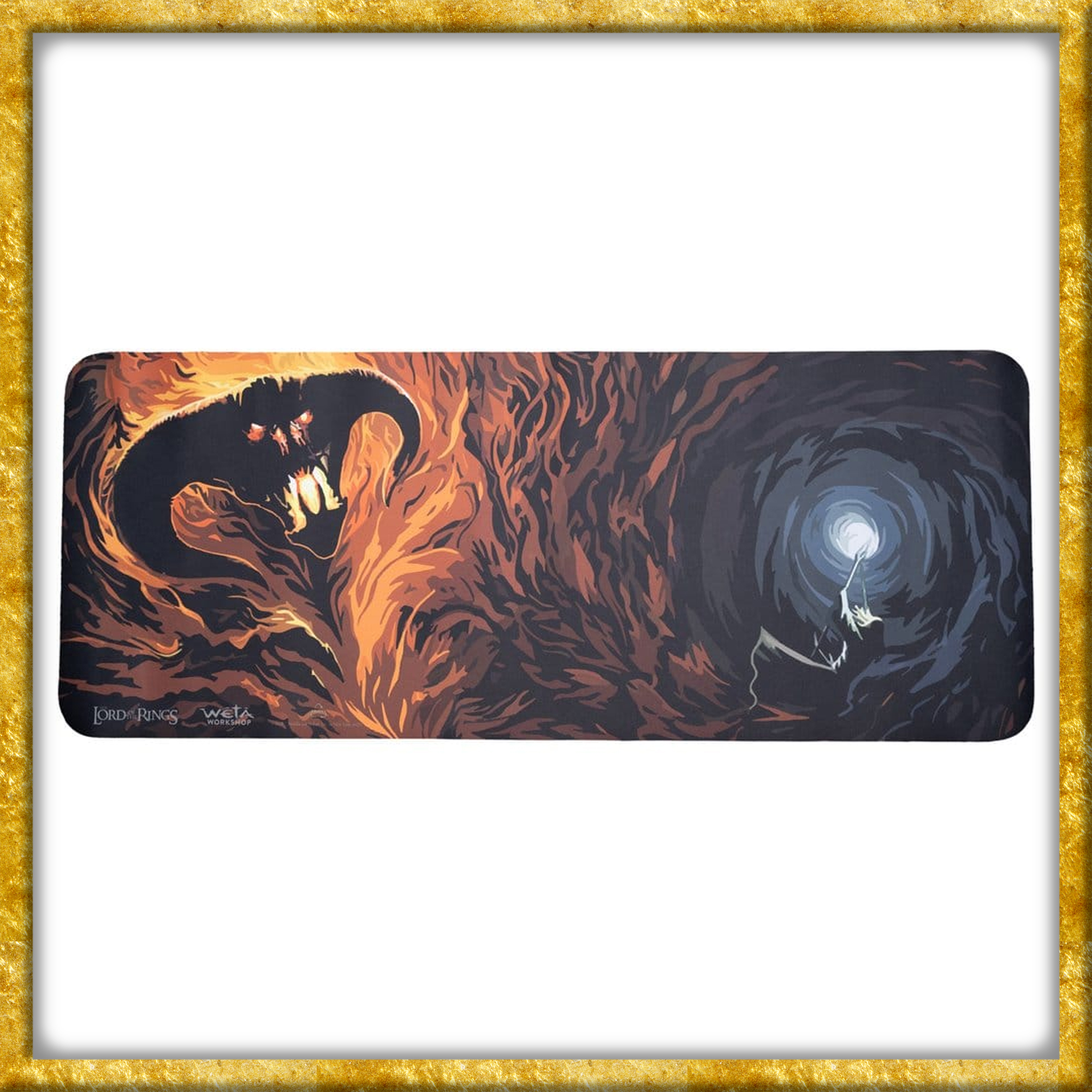 Verwandelt Euren Arbeitsplatz in eine Szene aus Mittelerde mit unserer epischen neuen Schreibtischunterlage, die Gandalf in seinem legendären Kampf gegen den Balrog in Moria zeigt. Mit ihrer lebendigen Grafik, ihrer grosszügigen Grösse von 74cm x 29,5cm x 0,4cm und ihrer glatten Oberfläche ist sie perfekt geeignet, um Eure Maus und Tastatur in Schach zu halten und Eurem Tag einen Hauch von Magie zu verleihen.