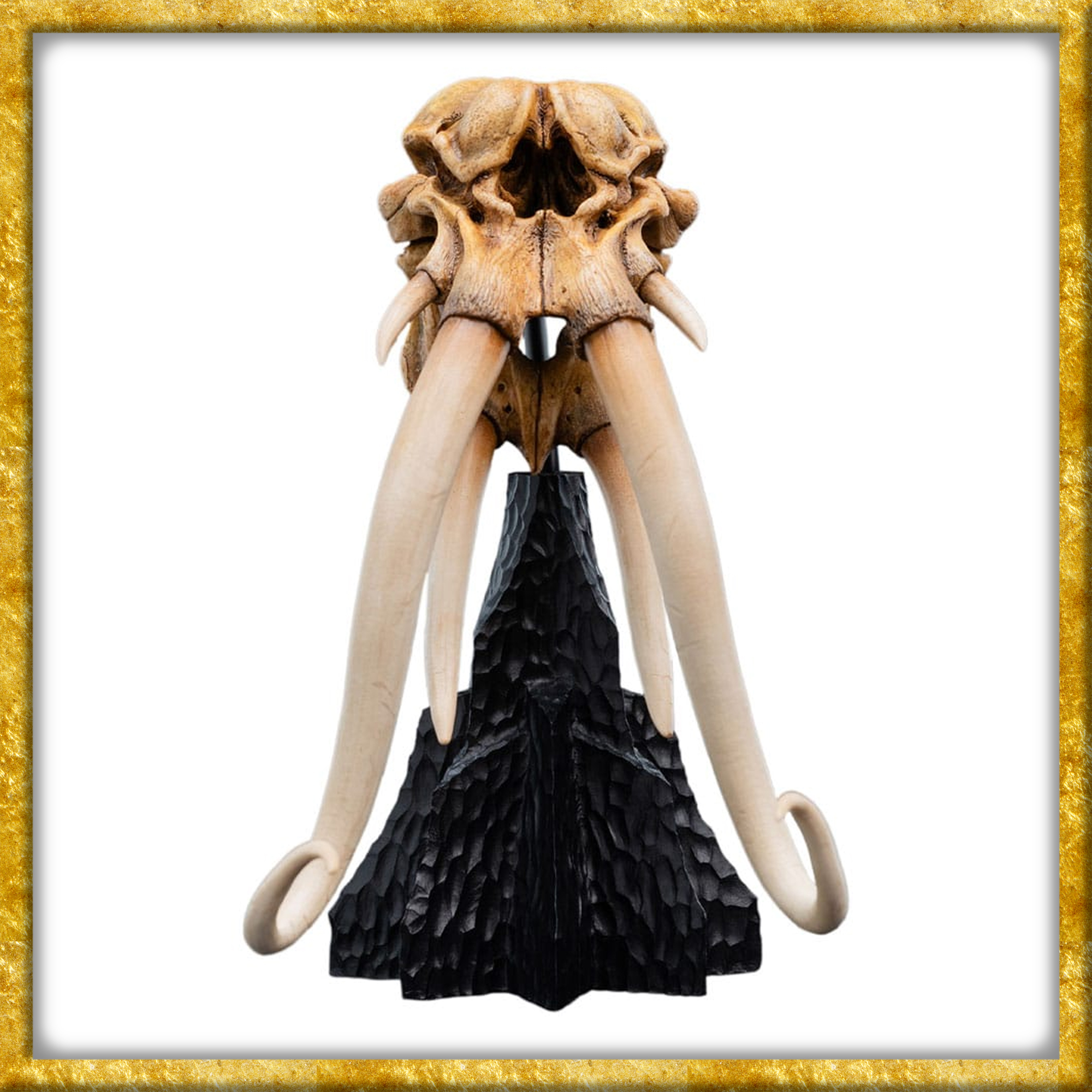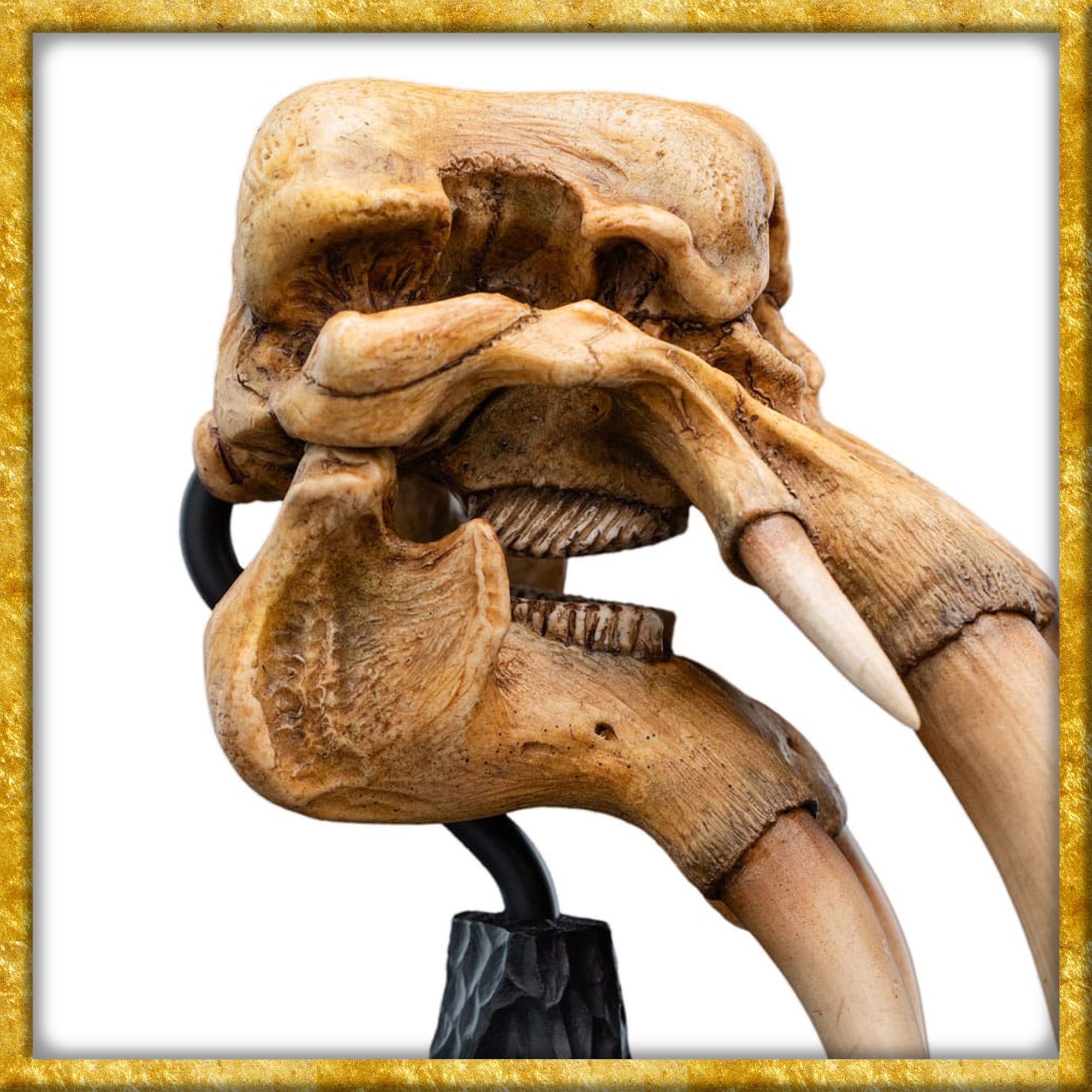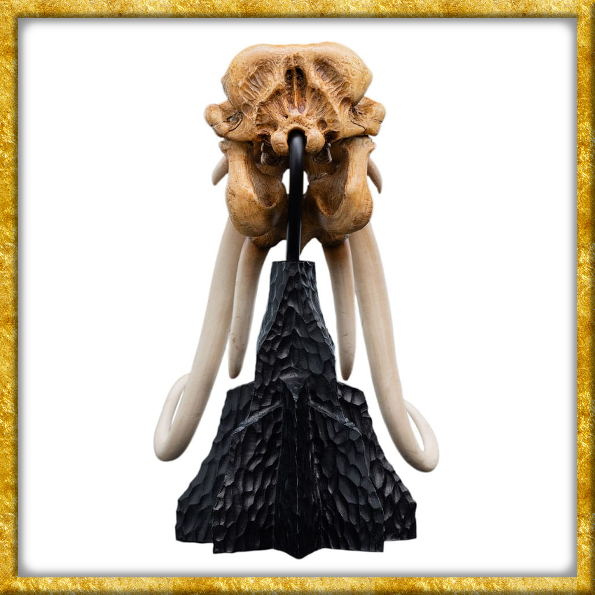 Aus Herr der Ringe erscheint diese detailreiche sowie qualitativ hochwertige Statue des Schädels eines Olifanten, welcher aus Polystone hergestellt wurde. Die Statue ist ungefähr 22cm x 15cm x 19,5cm gross. Gewaltige, gebogene Stosszähne ragen aus einem breiten, nach vorne ragenden Oberkiefer hervor, während die gewölbte Schädelhöhle auf die Masse und Muskulatur hindeutet, die erforderlich sind, um ein solches Gewicht und eine solche Wucht zu tragen. Die Anzeichen für dichte, verstärkte Knochen entlang der Stirn- und Nasenregion deuten auf eine evolutionäre Verstärkung hin, die sich gut dafür eignet, sowohl Gelände als auch Feinde zu durchbrechen.