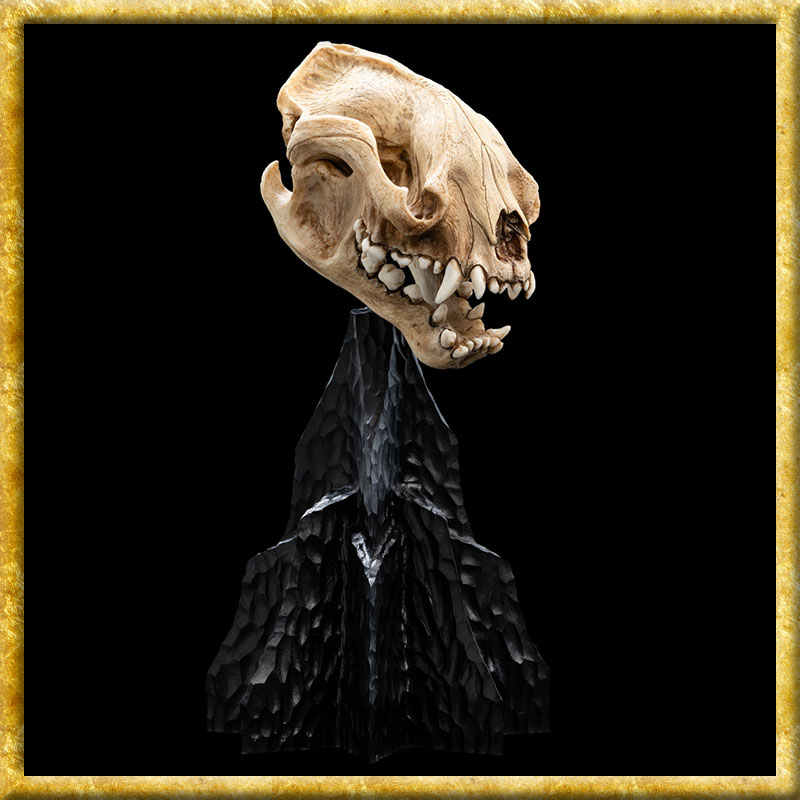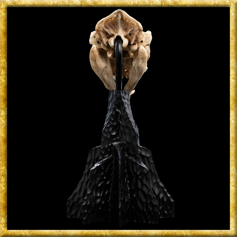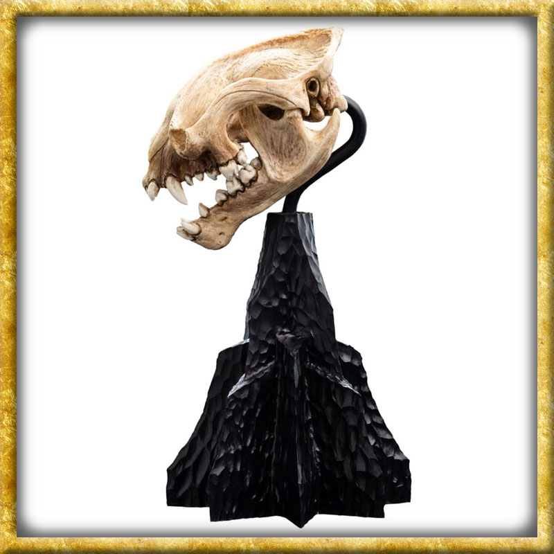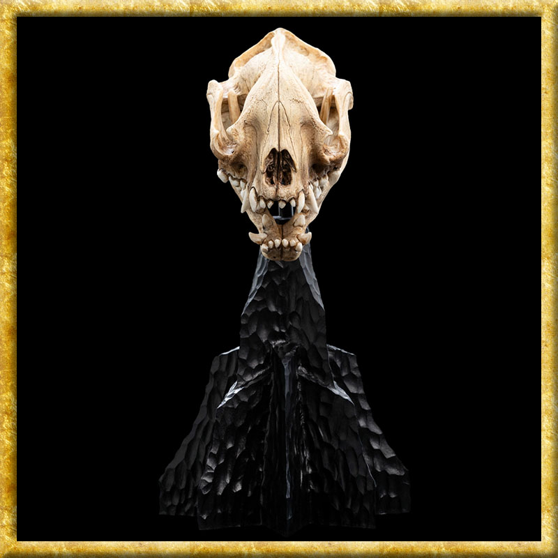 Aus Herr der Ringe erscheint diese detailreiche sowie qualitativ hochwertige Statue des Schädels eines Wargs, welche aus Polystone hergestellt wurde. Die Statue ist ungefähr 10,5cm x 20cm x 11,5cm gross. Die längliche Schnauze und der ausgeprägte Sagittalkamm lassen auf eine kräftige Kiefermuskulatur schliessen, die für das Greifen und Reissen optimiert ist. Das robuste Gebiss weist markante, konische Eckzähne und ineinander greifende Backenzähne auf, was auf eine fleischfressende Ernährung mit Schwerpunkt auf der Jagd nach grossen Beutetieren hindeutet. Die breiten Jochbeinbögen bieten den Kiefermuskeln viel Halt, während die nach vorne gerichteten Augenhöhlen auf eine scharfe Tiefenwahrnehmung hindeuten - eine entscheidende Eigenschaft für einen Spitzenprädator. Jedes Element des Warg-Schädels unterstreicht seine Rolle als dominante Kraft in seiner Umgebung, die auf Überleben und Aggression getrimmt ist.