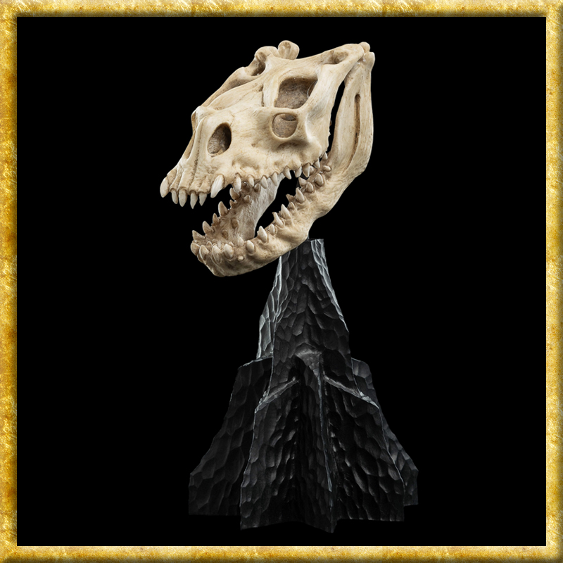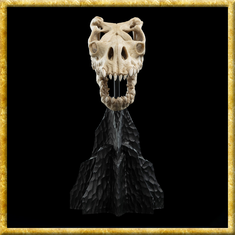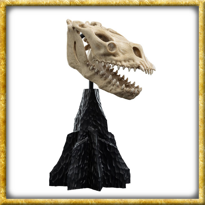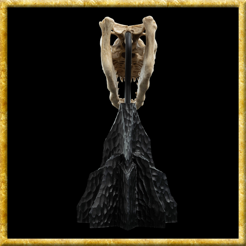 Aus Herr der Ringe erscheint diese detailreiche sowie qualitativ hochwertige Statue des Schädels eines Fell Beasts, welche aus Polystone hergestellt wurde. Die Statue ist ungefähr 10,5cm x 21cm x 13cm gross. Das unregelmäßige Gebiss mit scharfen Zähnen und ausgedehnten Schädelgraten lässt auf ein Raubtier von unglaublicher Grausamkeit schließen. Der leichte, aber kräftige Knochenbau deutet auf eine Anpassung an den Flugsport hin. Dieses Exemplar ist besonders aufschlussreich angesichts der dunklen, unheimlichen Präsenz, die diese Biester über den Himmel von Mittelerde werfen. Der längliche, reptilienartige Schädel der Fellbestie, dem furchterregenden Reittier der Nazgûl, offenbart eine Kreatur von alptraumhaften Ausmassen.