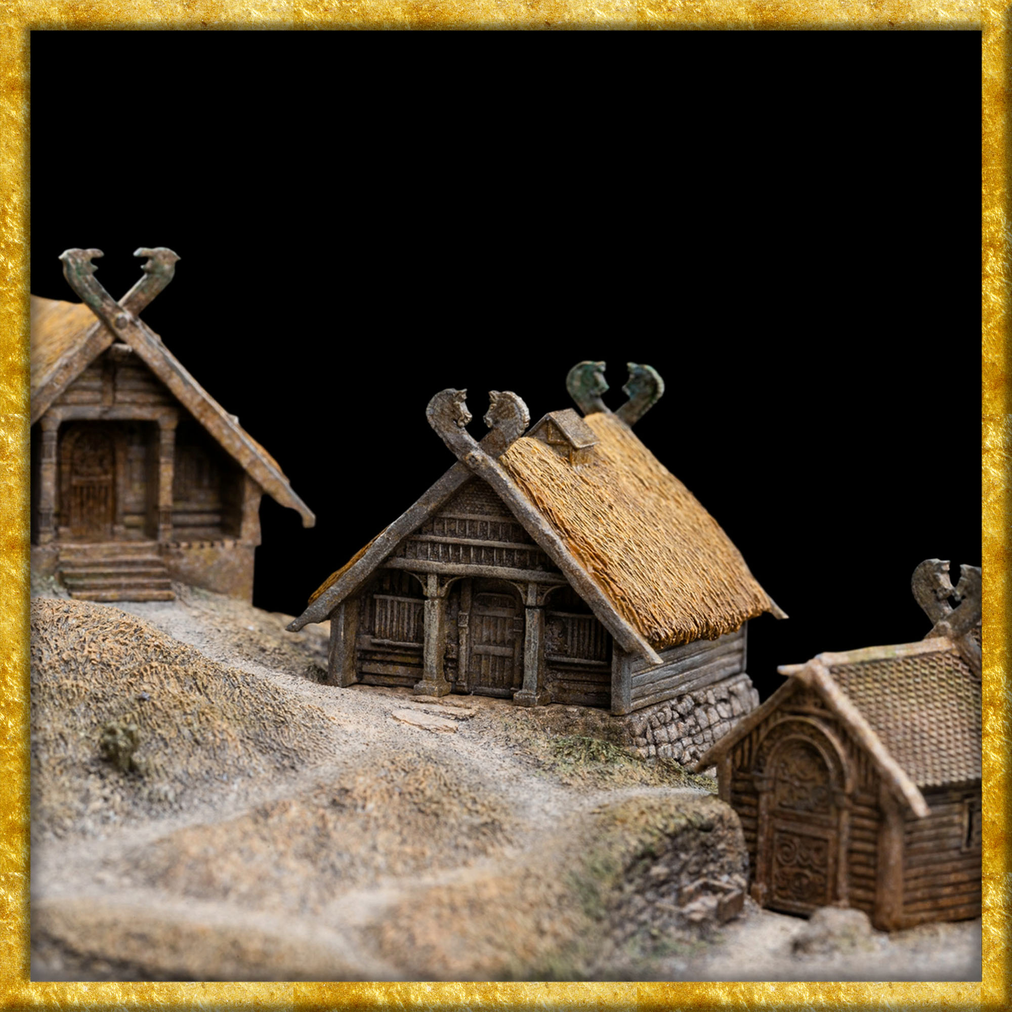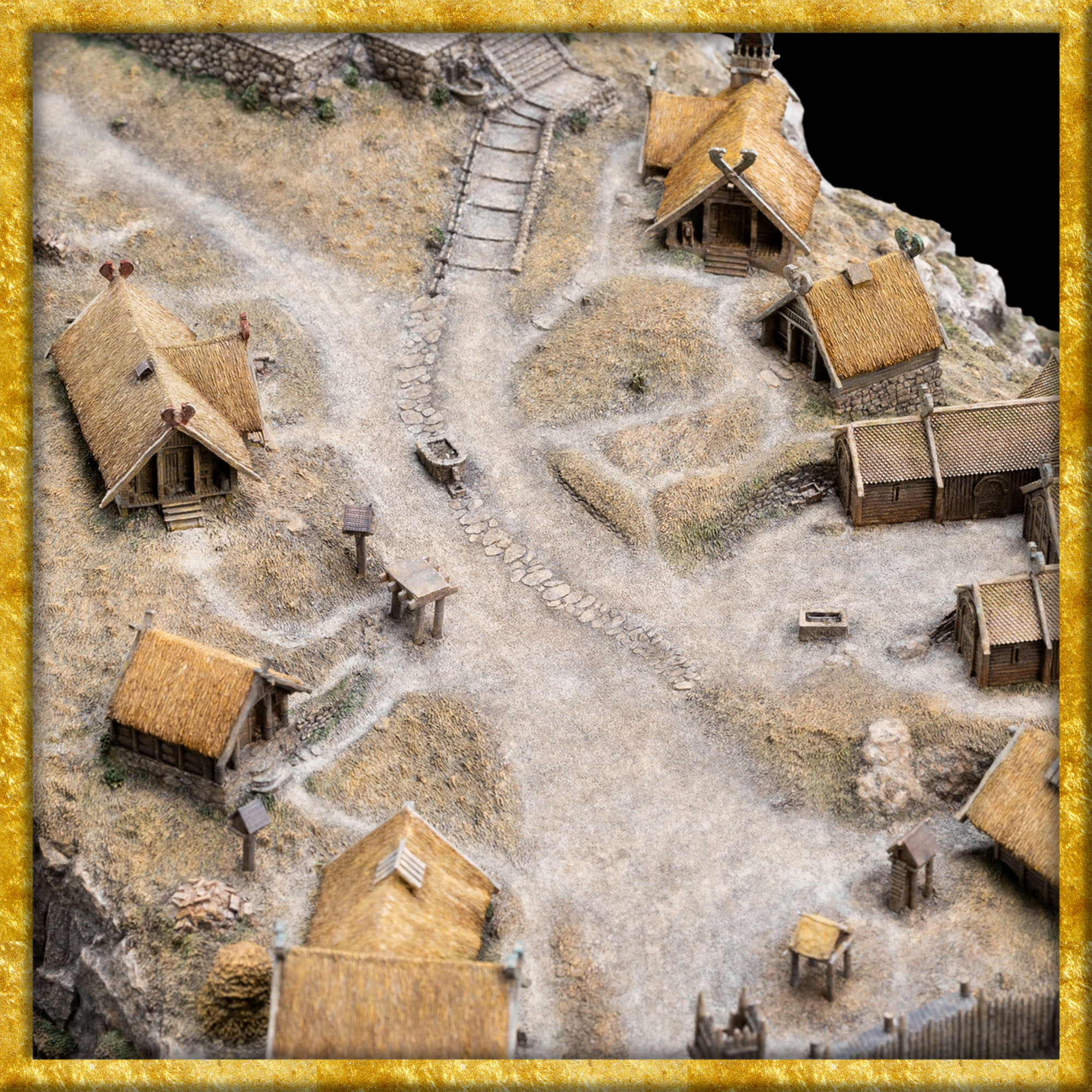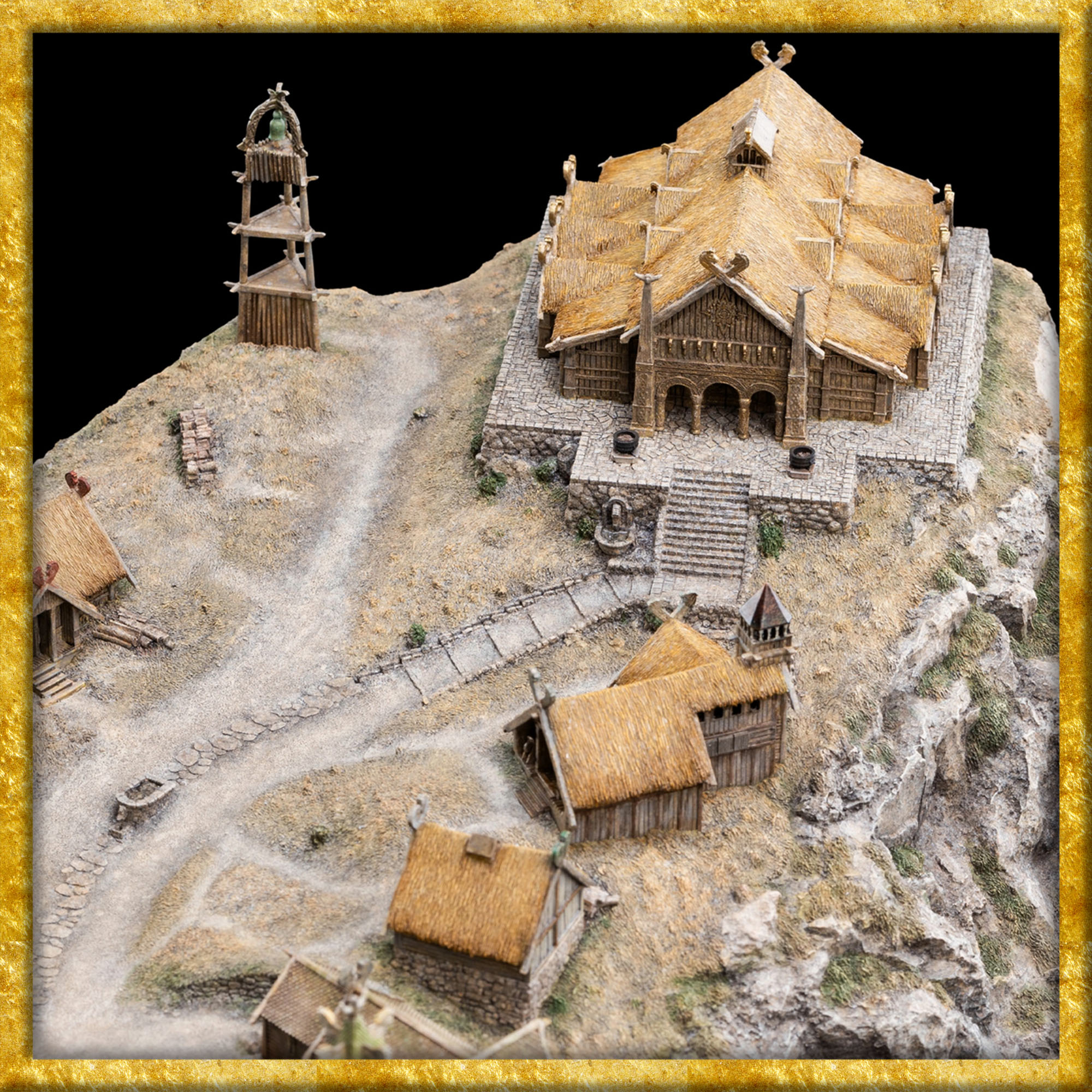 Im goldenen Licht des Morgens erhebt sich Edoras wie eine Krone auf den grünen Hügeln aus der Ebene. Die Stadt thront stolz auf einem hohen Hügel, umgeben von einem Ring aus alten Holzpalisaden und bewacht von den hoch aufragenden Gipfeln der Weissen Berge. Ein Ort der Stärke und Verbundenheit – seine Mauern sind vom Wind und der Zeit gezeichnet, doch so unvergänglich wie der Geist derer, die darin wohnen.