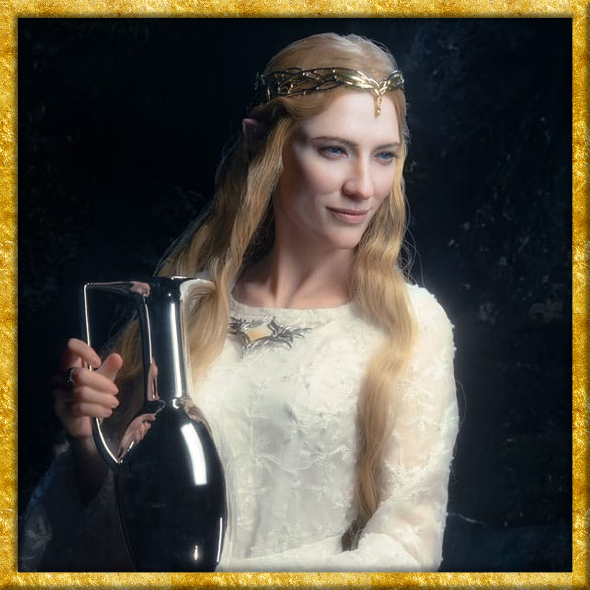 Galadriels Spiegel war ein wassergefülltes Becken, in dessen glitzernder, glatter Wasseroberfläche der Hineinschauende durch Galadriels Macht Bilder aus Vergangenheit, Gegenwart oder einer möglichen Zukunft sehen konnte. Er befand sich in einer Schlucht an den Südhängen von Caras Galadhon in Lothlórien. Das Becken stand auf einem niedrigen Sockel, der wie Baumgeäst geformt war, und hatte eine breite und flachen Form. In dem Becken befand sich eine silberne Schale, die mit Wasser aus dem Bach, der durch diese Schlucht floss, gefüllt wurde. Dazu diente ein silberner Krug, der neben dem Becken aufbewahrt wurde. - Quelle LOTR Fandom