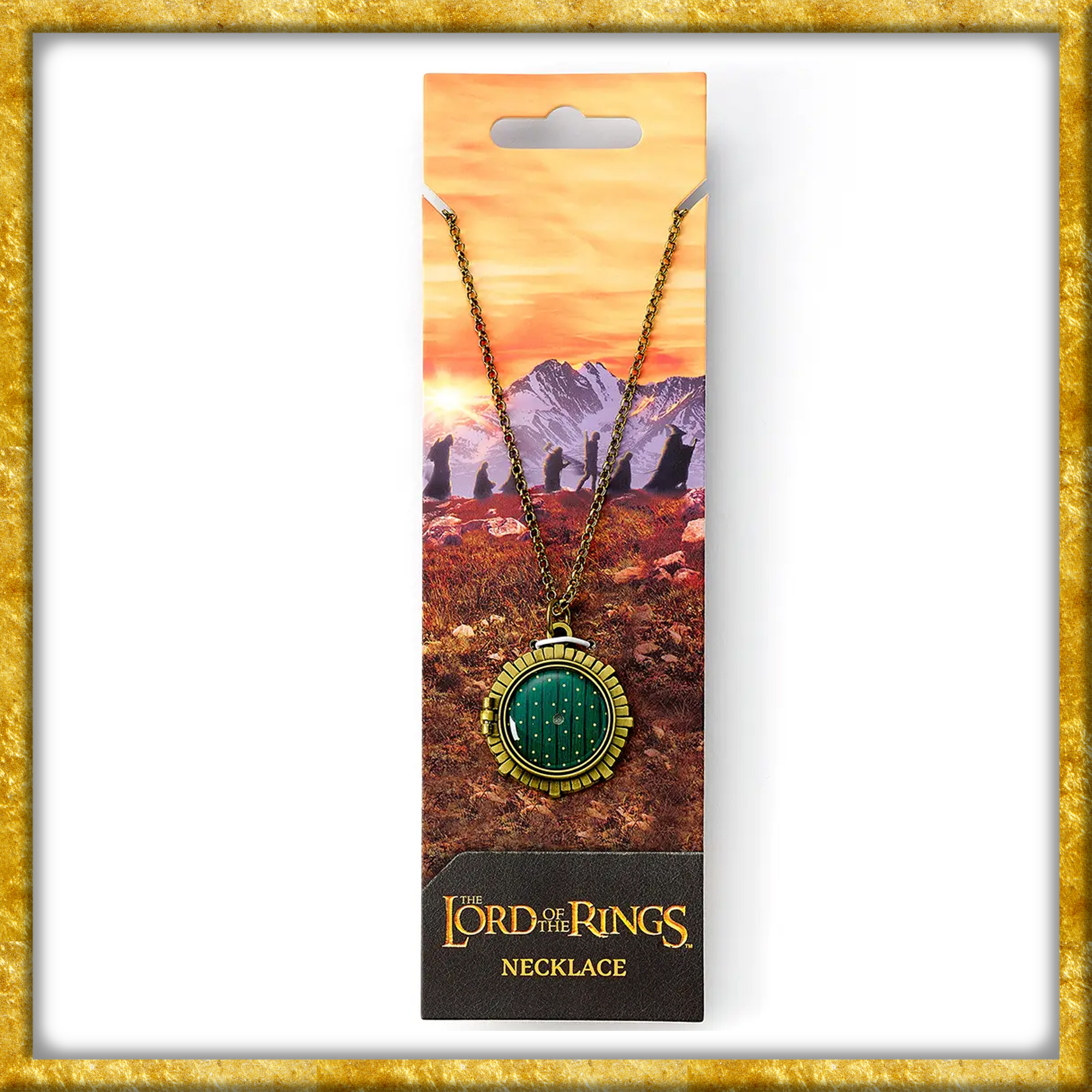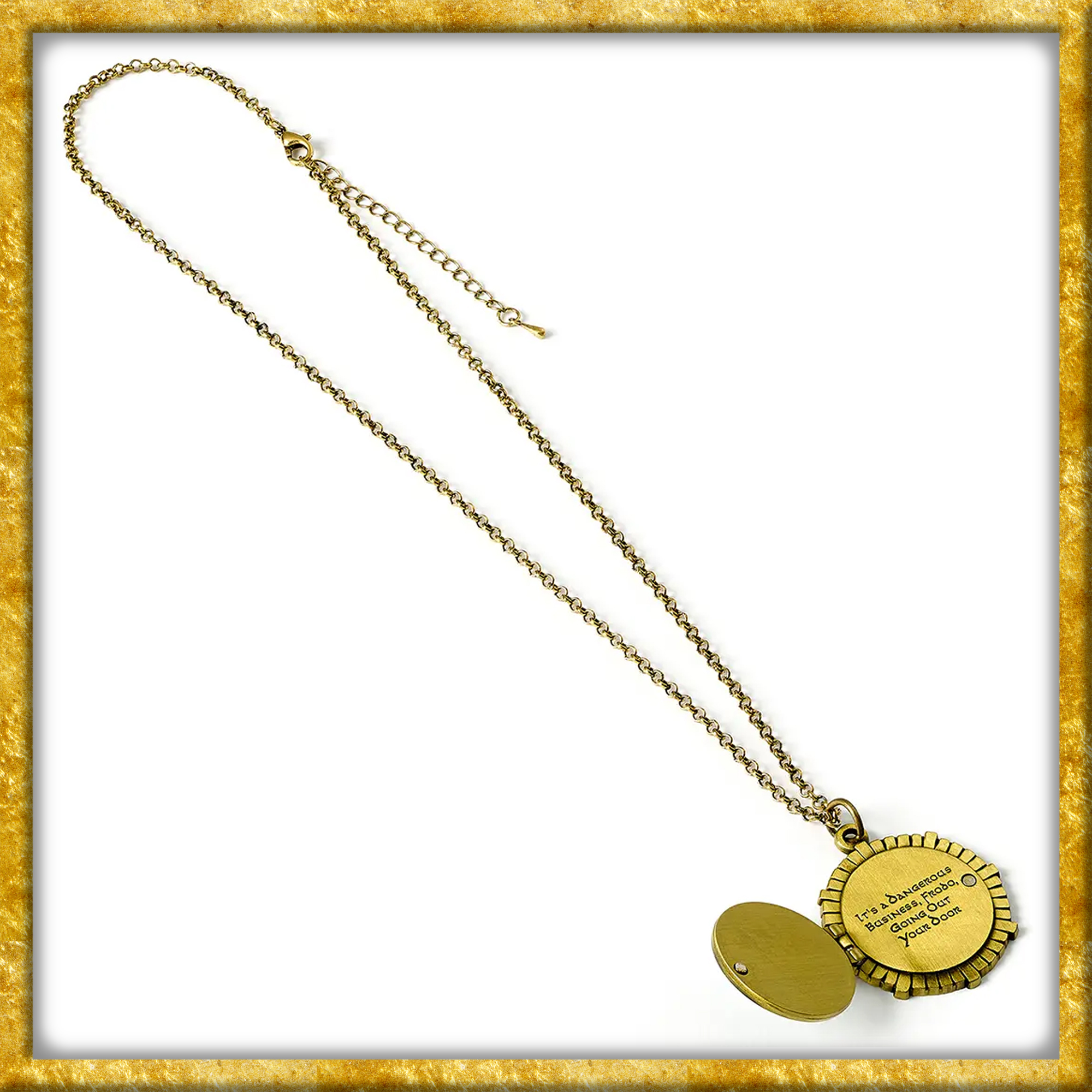 Diese Hobbit Halskette zeigt eine dem Original nachempfundenen Tür eines Hobbithauses an einer 60cm langen Kette. Die Halskette lässt sich öffnen und enthüllt eine versteckte geheime Botschaft mit dem berühmten Zitat: Es ist eine gefährliche Sache, Frodo, aus deiner Tür hinauszugehen. Trage den Einen Ring stets bei dir.