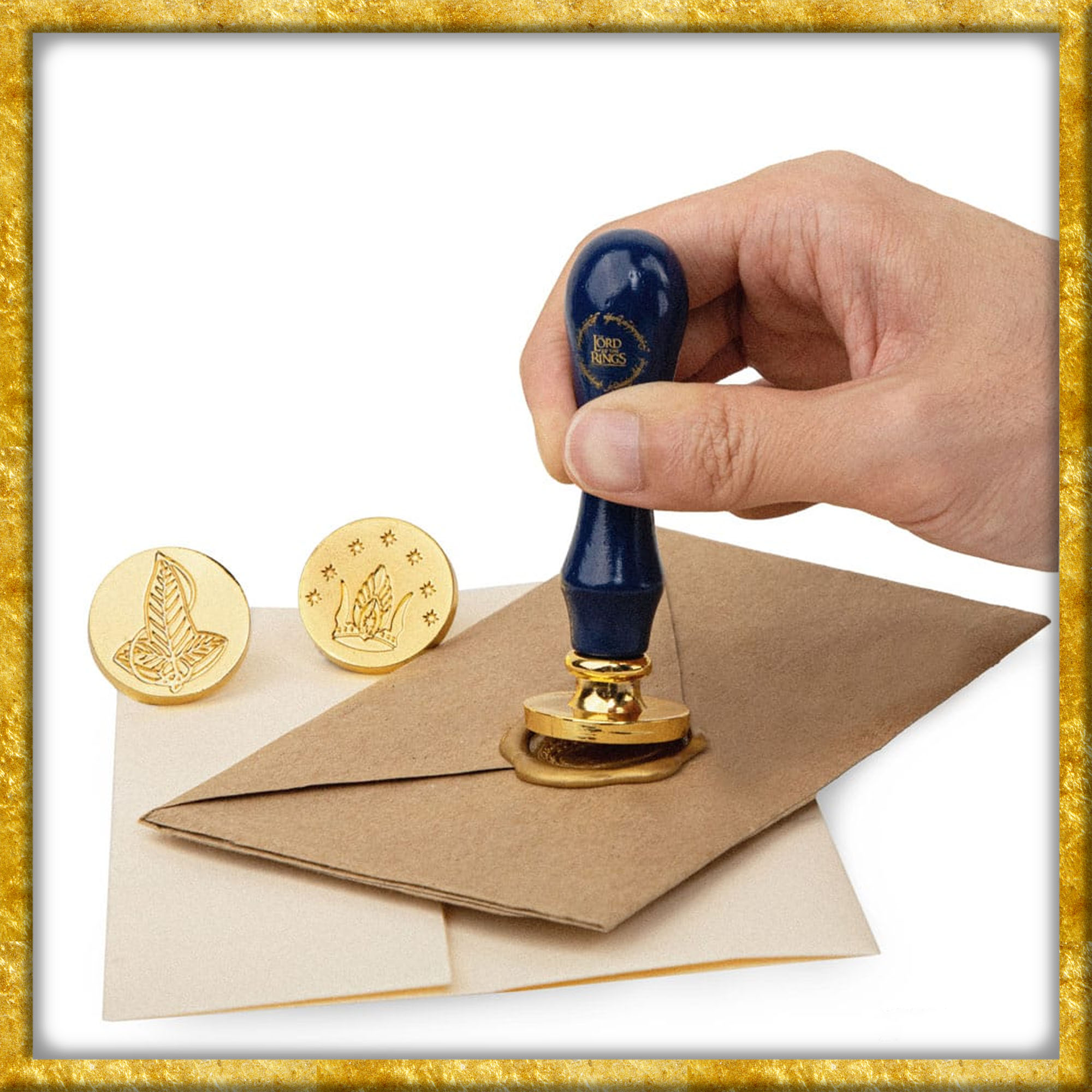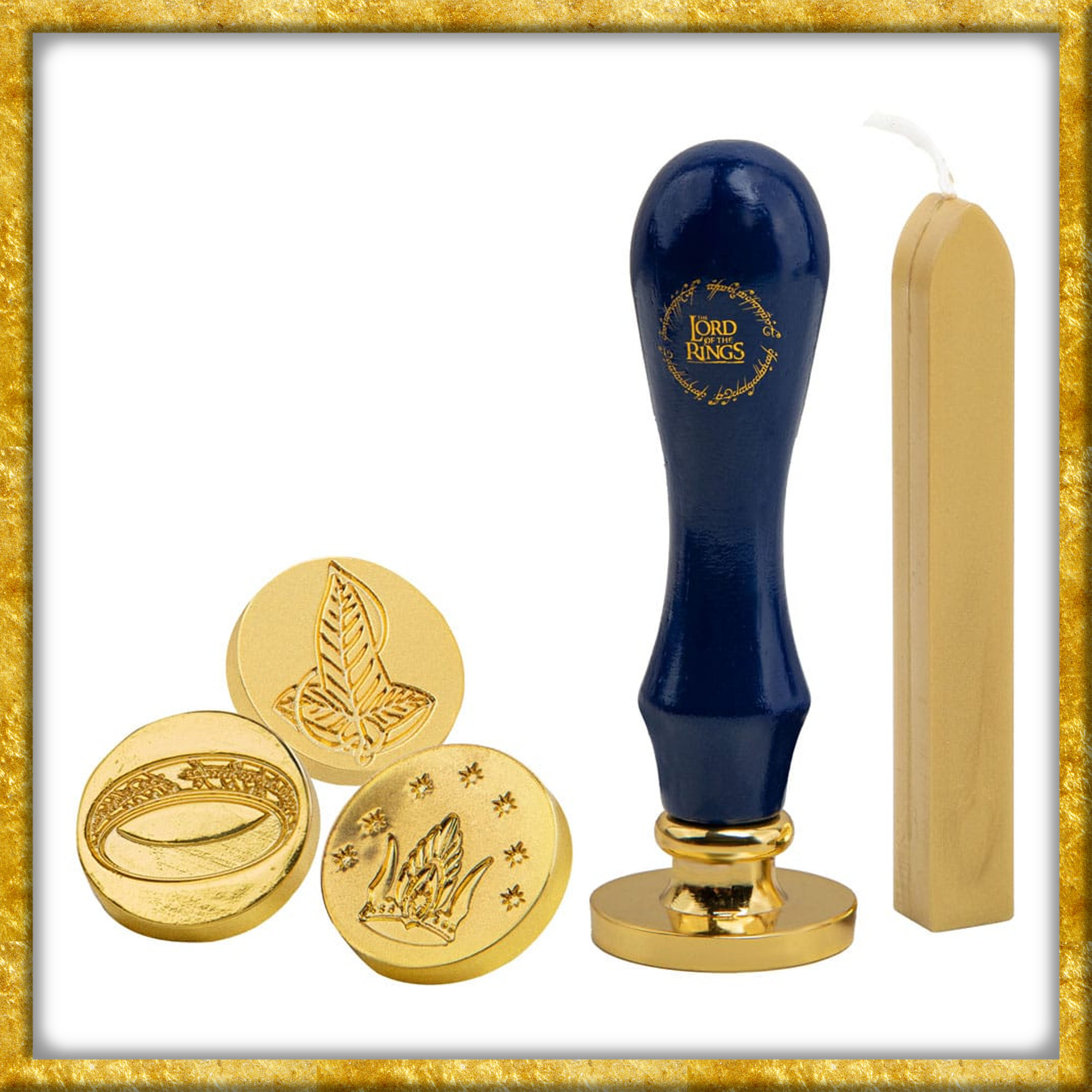 Mit diesem offiziell lizenzierten Herr der Ringe Stempel aus Metalldruckguss, könnt ihr Eure Dokumente und geheimen Briefe sicher versiegeln. In dem Dreierpack sind Aufsätze enthalten, welche der Eine Ring, die Krone Gondors sowie das Elbenlatt zeigen. Der Wachsstift in der Farbe Gold lässt das Siegel besonders magisch erstrahlen.