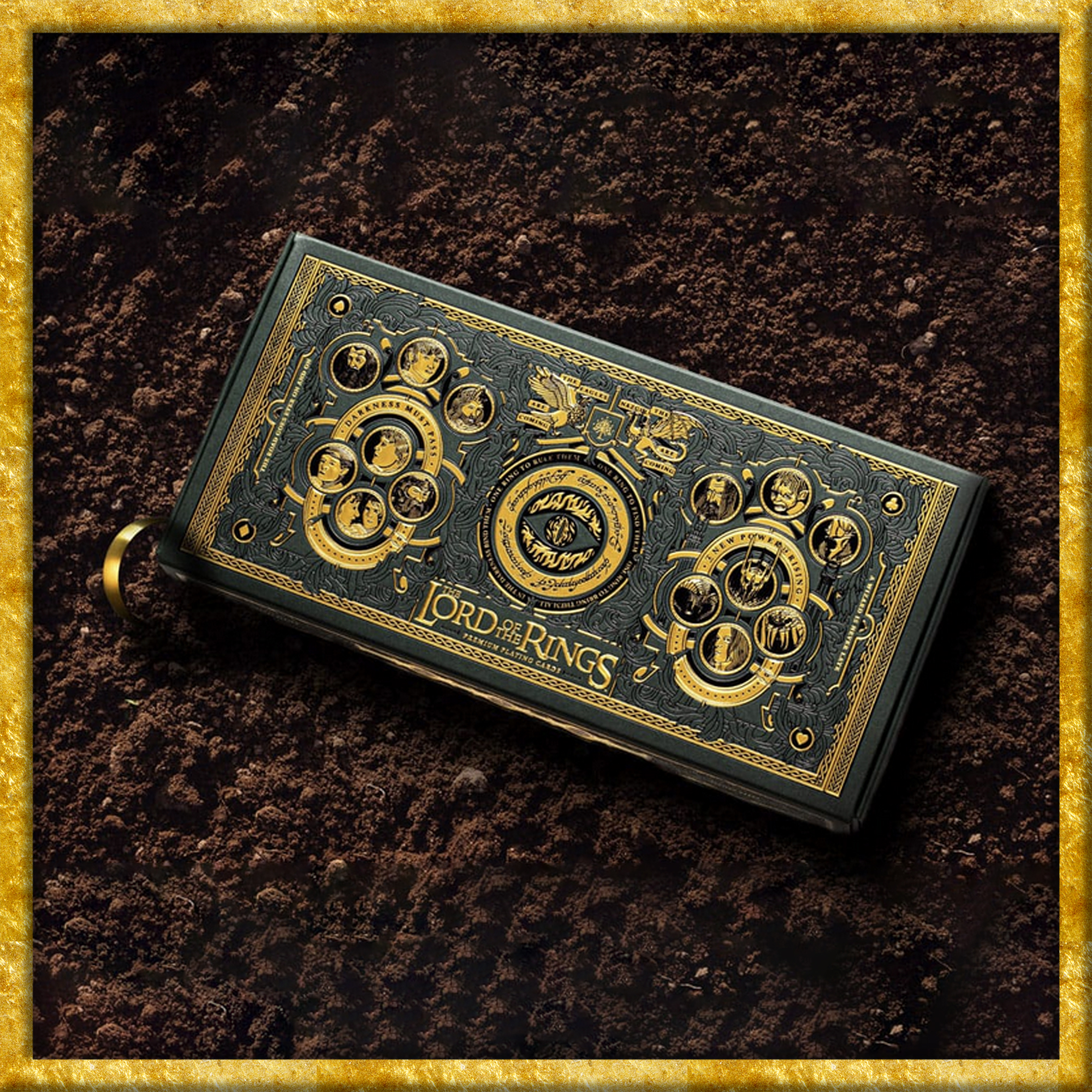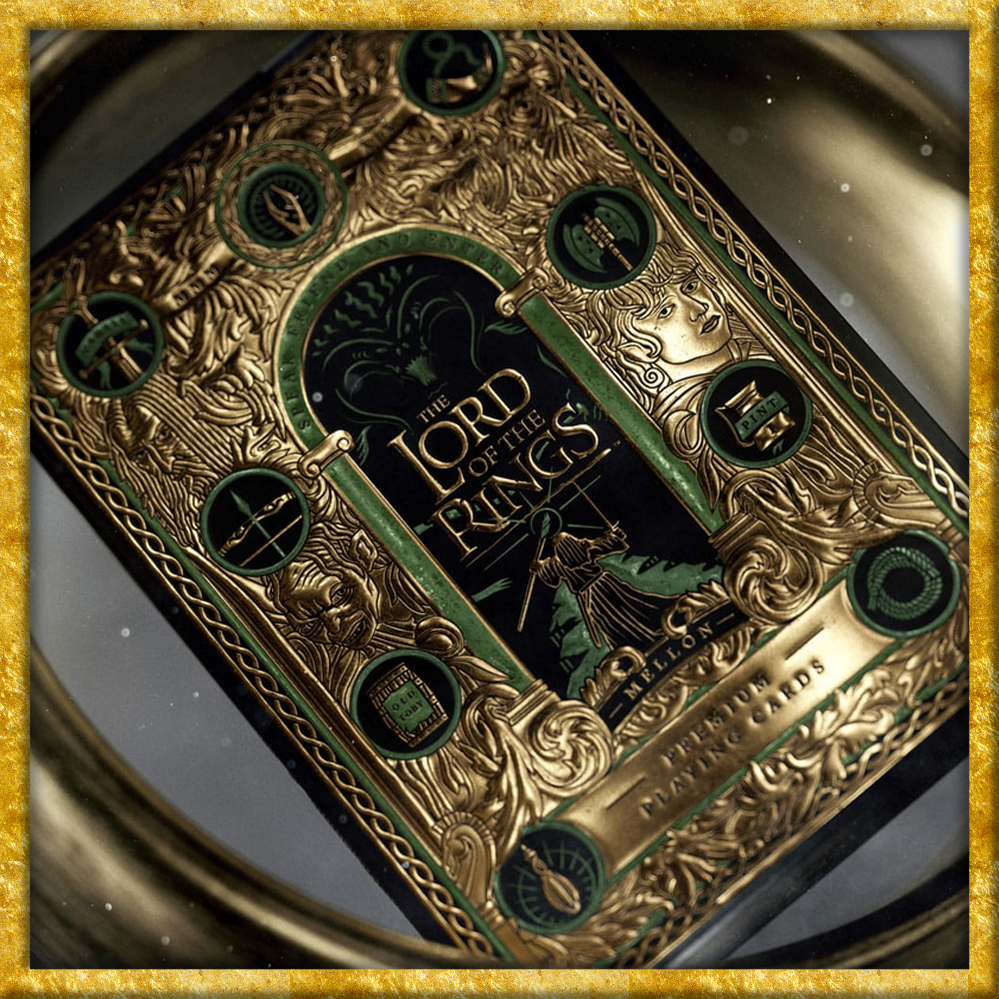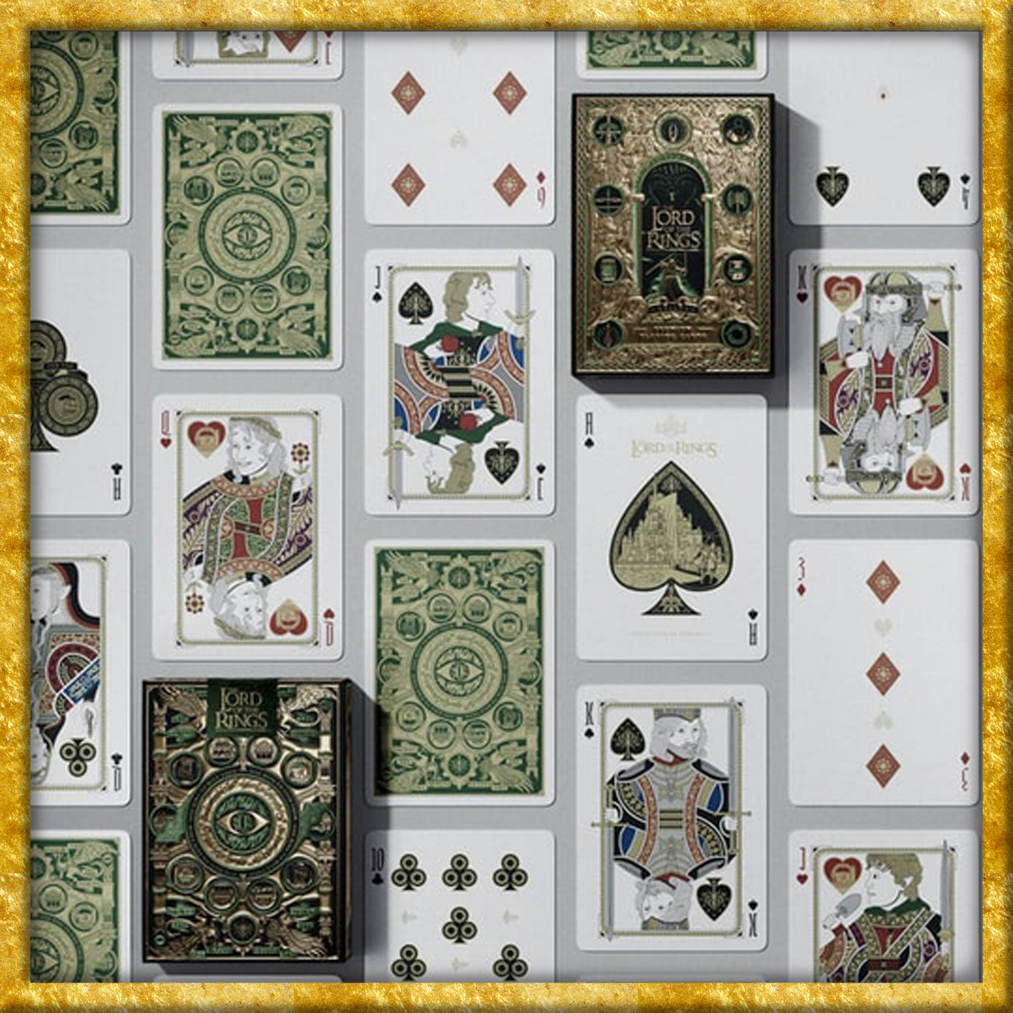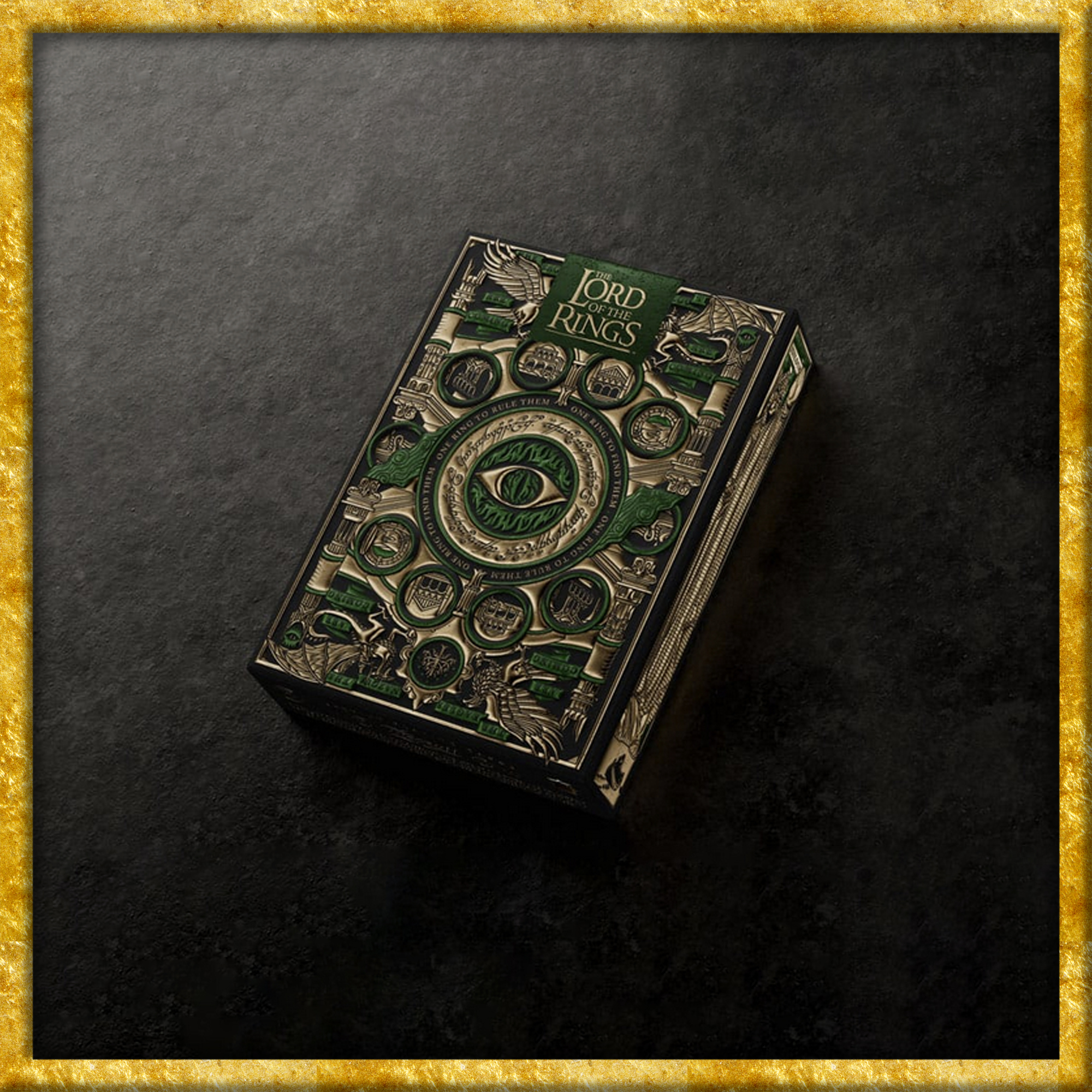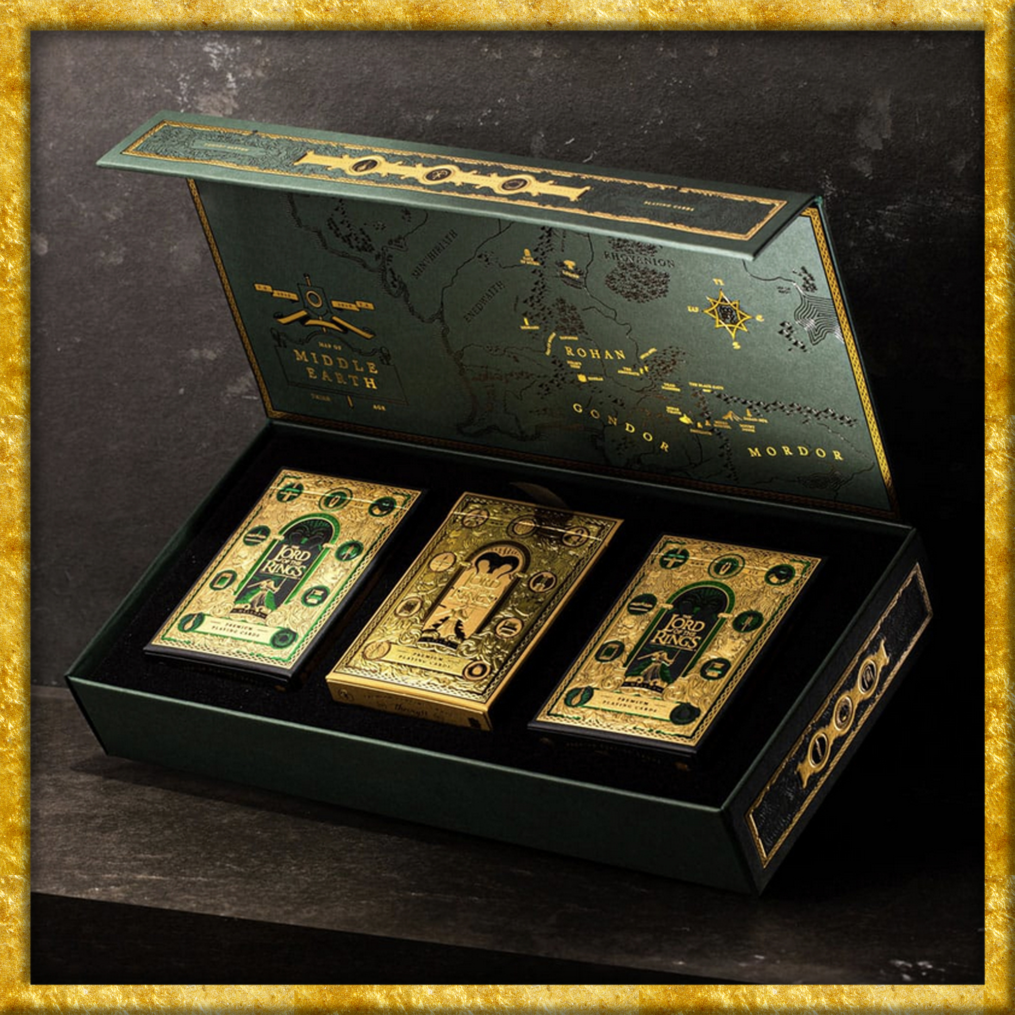 Aus dem Universum von Herr der Ringe erscheint hier dieses Spielkarten-Set in Premium-Qualität. Das Set wird in einer edel verzierten in Gold und Grün bedruckten Box geliefert. In der Box sind 4 Decks enthalten, darunter 2 Gold Foil Special Editions Decks, welche nur in diesem Box-Set erhältlich sind. Ein Deck enthält 52 Karten und ist unter anderem für Poker wie auch Skat geeignet. Die Karten werden von einem detailreichen verzierten Karton geschützt.